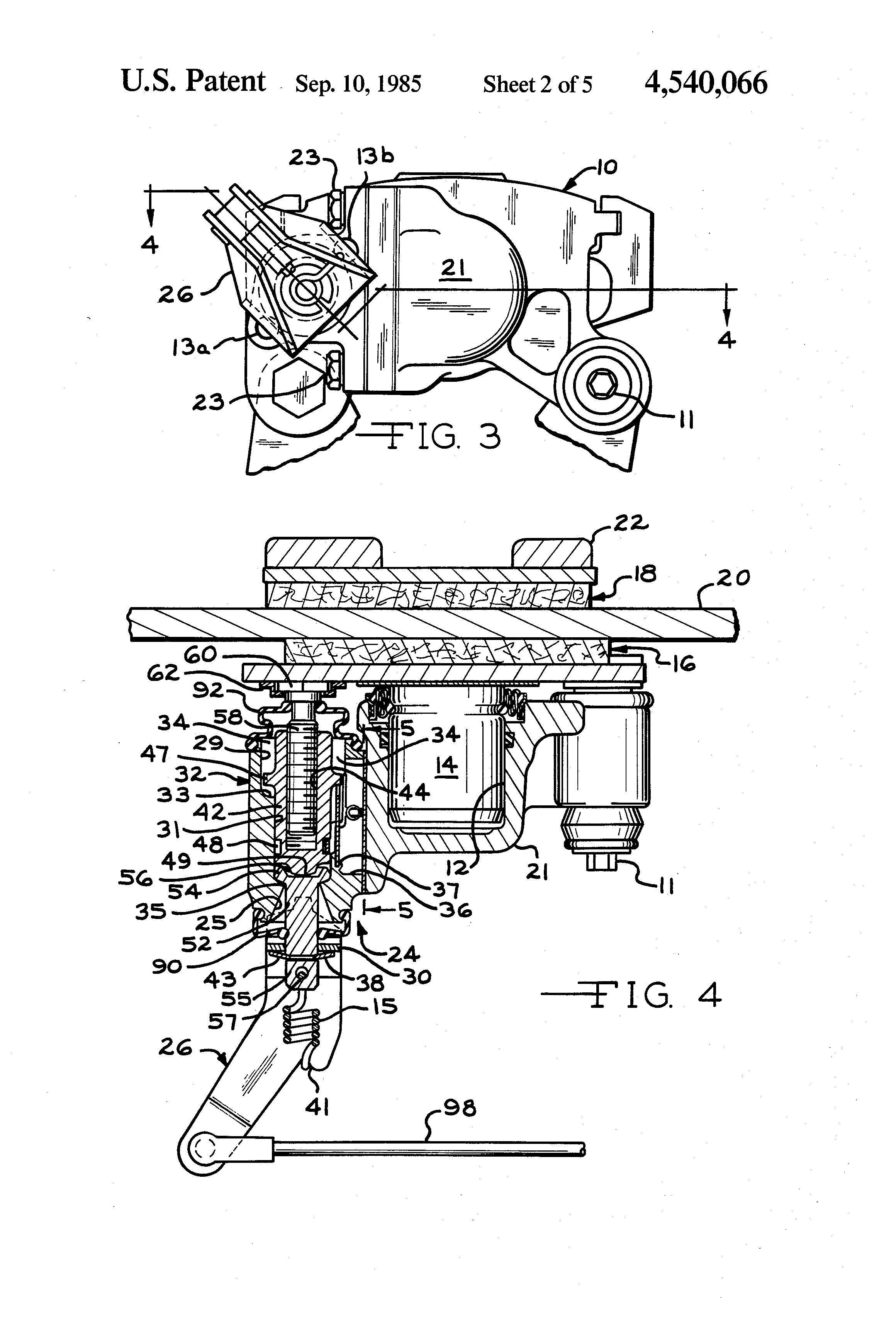 A mechanical parking brake mechanism having a self adjusting feature to compensate for friction pad wear suitable for use with a hydraulic disc brake is disclosed. The embodiment disclosed teaches a parking brake mechanism separate and independent of the hydraulic brake actuating mechanism. Thus the parking brake mechanism may be combined with any disc brake as an add-on device for use on motor vehicles.