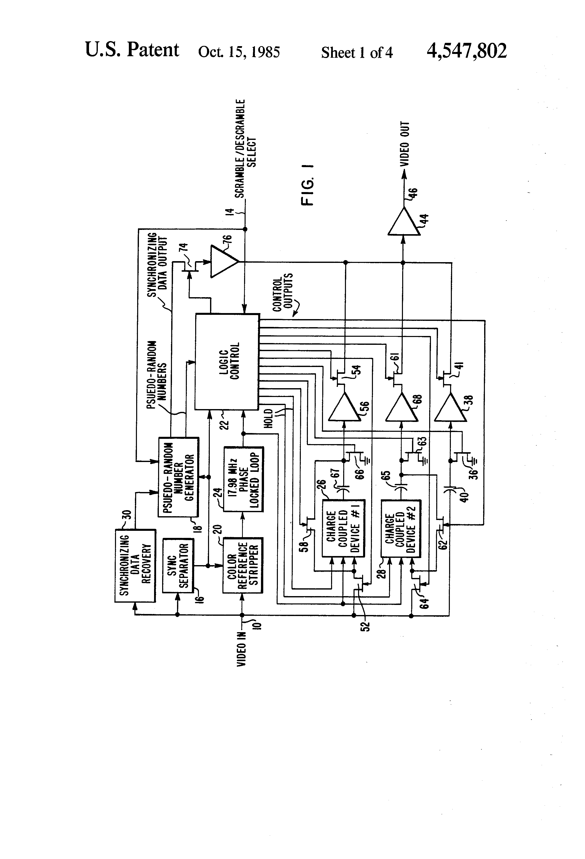 1. Field of the Invention The invention relates to TV scrambling/descrambling devices and more specifically to scrambling/descrambling devices utilizing serial memories such as charge coupled devices. 2. Description of the Prior Art Scramblers and descramblers for television signals in which the beginning and end portions of the lines of the video signal are interchanged for scrambling are well known in the art. For example, such a device is disclosed in a patent issued to H. B. Shutterly, U.S. Pat. No. 4,070,693 and assigned to the same assignee as this application. While the apparatus disclosed by Shutterly functions for its intended purpose, it is relatively complex due to the necessity for providing random access memories to store the samples representing the video data. The preferred embodiment of the invention comprises a system for scrambling or descrambling a video signal. The system includes first and second serial memories such as charge coupled devices, for example. Data representing adjacent portions of the signal is alternately stored in the two devices with the device into which information is not being currently inputted recirculated for a predetermined time interval to interchange with respect to time the data stored therein. The data output signal of the memory which is currently being used to store data is merged with synchronizing data to form a composite video output signal. In the scramble mode, the time interval is determined by a random number generator. Similarly, in the descramble mode, the time interval is determined by a random number generator synchronized with the random number generator used in scrambling. FIG. 1 is a block diagram of the preferred embodiment of the invention; FIG. 2 is a waveform diagram illustrating the operation of the preferred embodiment of the invention; FIG. 3 is a waveform diagram illustrating the location within the TV signal of the synchronizing data for the pseudo random number generator; and FIG. 4 is a waveform diagram illustrating the timing intervals for the restoration of the DC level of the video signal. A scrambler/descrambler system comprising the preferred embodiment of the invention is illustrated in FIG. 1. The system illustrated in FIG. 1 can function either as scrambler or a descrambler. Operation with respect to the scramble cycle will be first described and then the descramble operation will be subsequently described. In the scramble mode, a standard TV video signal such as the signal illustrated at reference numeral 12 (FIG. 2) is coupled to the input lead 10. Additionally, a scramble signal is coupled to the scramble/descramble select terminal 14 to indicate that the system is to operate in the scramble mode. In the scramble mode the TV video signal 12 is coupled to a sync separator 16 which recovers the horizontal, vertical and color burst signals. Pseudo random number generator 18 utilizes the synchronizing signals to control the generation of random numbers for scrambling, as subsequently described. The synchronization signals are also coupled to a color reference stripper circuit 20 and to the logic control circuit 22. Color reference stripper circuit 20 recovers the color reference signal and couples this signal as an input to a phase lock loop 24 to generate a signal which is five times the frequency of and phase locked to the color burst, i.e. ≈17.9 MHz. The 17.9 MHz output signal of the phase lock loop 24 is coupled to the logic control circuit 22 and to the charge coupled devices 26 and 28 as a clock signal. Pseudo random number generator 18 generates two outputs. The first output is a pseudo random number which is coupled to the input of the logic control circuit 22 to determine the duration of the time interval during which the data stored in one of the memories is recirculated. The second output is a synchronizing code to synchronize the descrambler with the scrambler. In response to the synchronizing data of the video signal, the 17.9 MHz phase lock loop output signal and the pseudo random numbers from the pseudo random number generator 18, the control logic 22 generates signals which control the shifting of data into the charge coupled devices 26 and 28 (serial memories) and selectively combines the output signals of the charge coupled devices, 26 snd 28, to form the scrambled signal 13. Additionally, the logic control circuit 22 generates the signals necessary to insert the synchronizing data for the descrambler into a line of the scrambled signal, for example an unused line of the vertical blanking interval. FIG. 2 is a waveform diagram illustrating the operation of the system shown in FIG. 1. As previously discussed, in the scramble mode the unscrambled TV video signal 12 is coupled to the input lead 10 of the scrambler. A synchronizing data recovery circuit 30 also receives the TV video input signal, but is inactive in the scrambling mode. Following the detection of the first horizontal synchronizing pulse of the first field of the TV video input signal by the sync separator circuit 16, the bypass sync signal 34 (FIG. 2) switches to the high level. This turns off a switching transistor 36 causing the TV video input signals to be coupled to the input of an amplifier 38 through a coupling capacitor 40. Coincident with the bypass sync signal 34 is a signal coupled to the gate of field effect transistor 41 which turns this transistor on. This couples the horizontal synchronizing pulse and the following color burst signals from the input line 10 to the output line 46 through coupling capacitor 40, amplifier 38, switching transistor 41 and amplifier 44. For each subsequent time interval corresponding to the horizontal synchronizing pulse and the color burst signal, the synchronizing data and the color burst signal are similarly coupled from the input line 10 to the output line 46 as indicated by the time intervals during which the bypass signal 44 in FIG. 2 is at the high level. The data path from th