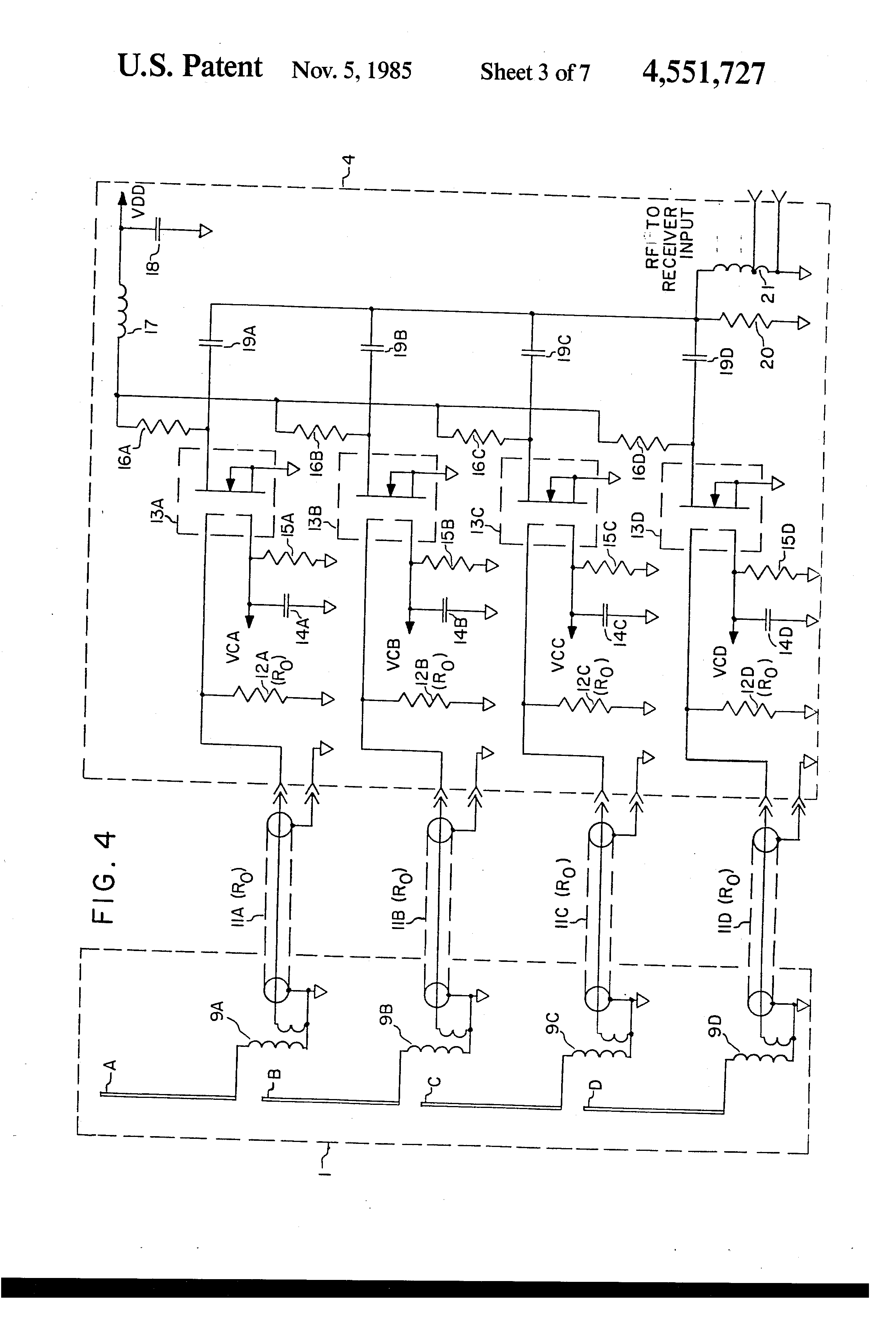This application is a Continuation-in-Part of copending prior application Ser. No. 06/157,366, filed on June 9, 1980, for a RADIO DIRECTION FINDING SYSTEM, by the same inventor. This invention relates to radio direction finding systems and specifically to radio direction finding systems based on the doppler frequency shift principle whereby phase modulation is imparted to the received signal by electronically moving the effective receiving antenna location along a circular path such that the modulation phase angle indicates the bearing of the radio transmission. Radio direction finding (RDF) systems based on the doppler shift principle have been used for some time in aeronautical applications. Most non-doppler RDFs employ directional antennas which produce peaks or nulls in the signal amplitude as they are rotated. Doppler type systems, on the other hand, detect the phase modulation imparted to the signal by translation motion of the receiving antenna. As a consequence of the "capture effect" of the FM receiver which detects the phase modulation, doppler type systems generally are less sensitive to site errors than amplitude measurement systems. Early disclosures of RDFs based on detecting the doppler shift are given in U.S. Pat. No. 2,414,798, by H. T. Budenbom, U.S. Pat. No. 2,481,509, by P. G. Hansel and "Radio Direction-Finding by the Cyclical Differential Measurement of Phase", by C. W. Earp and R. M. Godfrey, J.IEE, 1947, 94, Pt. IIIA, pp. 705-721. Practical doppler RDF systems do not mechanically rotate an antenna but instead rely on sequential switching between a series of antennas placed in a circular array. Since current flow in the non-selected antennas interacts with the signal induced in the selected antenna, methods have been invented for de-resonating the non-selected elements in such antenna arrays (U.S. Pat. No. 3,157,878 by P. G. Hansel, et. al.). While providing generally better performance than amplitude detection systems, doppler type RDFs tend to be large and complex owing to the number of antennas needed to generate a suitably large phase modulation while at the same time keeping the incremental phase angle change occurring at the switchover between antennas small enough so as to reasonably approximate a continuously rotating single antenna element. Reducing the size of the antenna array decreases the magnitude of the phase modulation, and decreasing the number of elements in an array of given size causes larger increments of phase to occur as adjacent elements are selected. Both of these factors decrease system accuracy. Also, discretely commutated doppler RDFs generate rf transients at the receiver input which tend to momentarily overload the receiver causing desensitization, and the incremental phase modulation can result in false bearings being introduced from the modulation of off channel signals on to the selected frequency. A recent disclosure (U.S. Pat. No. 4,041,496) by P. R. Norris attempts to overcome these problems by connecting the outputs of four antennas through electronically variable series resistive elements into a common antenna output to the receiver. The antenna dimensions and series resistances are chosen in such a manner that a constant antenna output impedance is presented to the receiver, and the resulting rf output is phase modulated in a manner which approximates that which would be introduced by a single rotating element. The magnitude of this phase modulation, however, is rather small, thus making the system difficult to use with an unmodified conventional FM receiver. Also, the variable series resistance circuitry must be made integral with the antenna itself because the technique depends on simultaneously controlling the rf currents through each antenna element in a prescribed manner to produce the proper output. A further disadvantage is that the array size is constrained to a specific small diameter as a consequence of the requirement for zero reactive mutual impedance between diagonally opposite elements. Accordingly, it is an object of this invention to provide a radio direction finding system utilizing the doppler principle compatible with a standard FM receiver. It is another object of this invention to provide a doppler direction finding system having all of its electronics contained within a single enclosure located remotely from the antenna. It is still another object of this invention to provide a doppler direction finding system capable of operating with a simple antenna array, the dimensions of which are not critical and may be varied over a wide range. These and other objects of the invention are achieved through the use of electronically controlled variable transconductance devices which provide rf output currents proportional to their respective rf input voltages. The proportionality is determined by periodic low frequency control voltages generated within the control electronics. The rf output currents flow through a common load impedance which acts as a voltage summer. By properly selecting the control voltage waveforms, the rf output voltage is caused to be phase modulated at the periodic frequency of the control waveforms and to approximate that which would be induced in a single antenna rotating in the circular path which inscribes the polygonal figure formed by the elements of the antenna. Peak phase modulation is typically six times greater than that produced using the variable series resistance approach with the same size antenna. A conventional FM receiver is capable of detecting this phase modulation. The input impedance of the rf summer containing the variable transconductance devices is a constant which may be matched to the characteristic impedance of the transmission line connecting each input to its corresponding antenna element and, consequently, the antenna array may be located at any convenient distance from the rf summer. Phase modulation is produced by linearly summing the rf voltages induced in the 