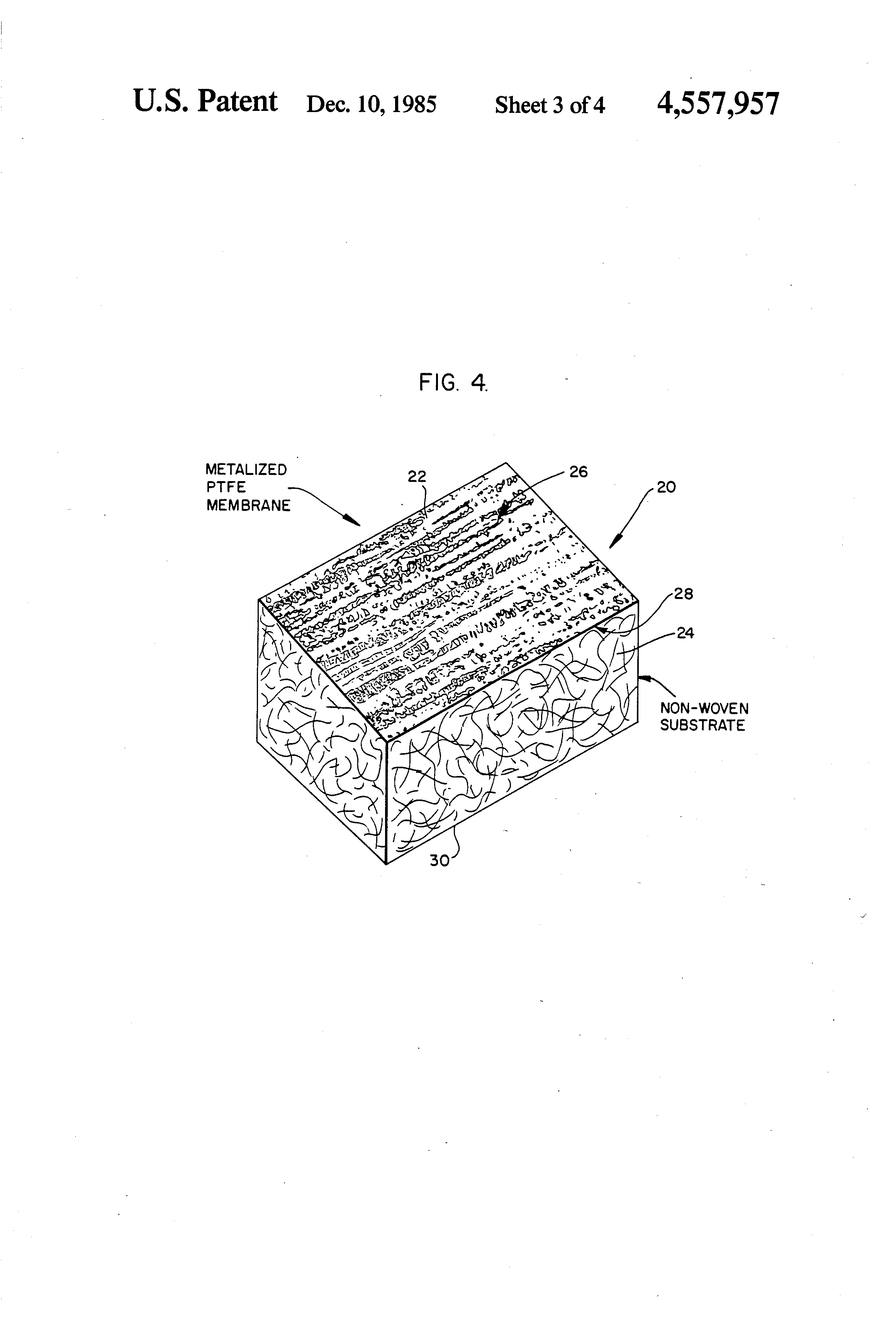 1. Field of the Invention The present invention relates to microporous metal-coated articles, preferably polytetrafluoroethylene (PTFE) articles, and a method for manufacturing the articles. 2. Background of the Invention There has long been a need for a method of obtaining a high quality, adherent conductive metal coating on articles made from polytetrafluoroethylene (PTFE) polymer. However, the same qualities that have provided an impetus to use PTFE, namely, the relative inertness to a wide range of corrosive chemicals and low dielectric constant (good insulator) also have rendered this material extremely difficult to "metallize" using conventional metal plating techniques, and/or can result in products having poor and non-uniform metal coatings. Representative of the prior art concerning metal plating techniques for PTFE are the U.S. Pat. Nos. 4,150,171 to Feldstein and 4,021,314 to Dafter, Jr. In addition to the problem of creating an adherent coating for PTFE, it is especially difficult to metallize the inner surface area of any porous structure. This characteristic is further affected by a reduction in the size of the porous openings, particularly with miniscule size pores in the order of 10 microns and even as small as 0.1 micron. Representative of prior art dealing with metal plating of porous electroplatable conductive bodies is U.S. Pat. No. 4,204,918 to McIntyre et al. A recent invention (U.S. Pat. No. 3,953,566) provides a process for manufacturing microporous, high strength, shaped PTFE articles. These articles are characterized by a microstructure of nodes of substantially solid PTFE interconnected by fibrils. Products produced by this process should find wide acceptance in the industrial, medical, and electrical arts, for example, in industrial filter bag filtration art. In accordance with the present invention, as embodied and broadly described herein, the metal-coated microporous article of manufacture preferably comprises a microporous polytetrafluoroethylene membrane having a microstructure characterized by nodes, interconnected by fibrils, and a continuous interporous coating of metal, the metal coating substantially encapsulating at least some of the individual nodes and fibrils, wherein at least one surface of the article is metal-coated and wherein at least a portion of volume of the article beneath the one surface is metal-coated. Preferably, the article has an average pore size less than about 100 um and a porosity of greater than 25% by volume. It is also desireable for the article to be flexible, electrically conductive, hydrophilic, and to have high fluid permeability, an effective surface area greater than 1 m2 /gm, and a metal coating that tenaciously encapsulates both nodes and fibrils of the microporous PTFE membrane while maintaining substantial porosity. By effective surface area is meant the surface area which is available for contact throughout the volume by a material as a result of the porous structure. By tenaciously encapsulate is meant adhering or tending to hold strongly to the surfaces of the microporous structure, while substantially enclosing the PTFE structure. It is also preferred that the article have a bulk density of less than about 10.0 gm/cc, the conductive metal is nickel, and that the thickness of the nickel coating surrounding the nodes and fibrils is about 10 to 1000 Å. Further in accordance with the present invention as embodied and broadly described herein, it is preferable that the articles of manufacture comprise a microporous first layer, the first layer also being flexible and electrically conductive along at least one layer surface and also from the one surface along a path perpendicular to the one surface through at least a portion of the first layer thickness, the first layer also having a bulk density less than about 10.0 gm/cc; and a second layer contacting the first layer at the surface opposite the one surface. Preferably, the first layer is a metal-coated thin microporous PTFE membrane having a microstructure characterized by nodes interconnected by fibrils and being conductive through its total thickness and having a thickness of about 0.5 mils, and said second layer is a porous, fabric backing with a thickness of about 10.0 mils, and wherein the fabric backing also is coated with a conductive metal, the fabric backing layer being conductive along its surface opposite the membrane. It is also preferred that the metal coating on the fiber backing surrounds the individual fibers and the fiber backing is conductive through the entire second layer thickness so that a microporous article of construction is formed, which is comprised of a metal-coated polytetrafluoroethylene microporous membrane, supported by a porous metal-coated fabric backing. Therefore, the layered construction of the articles of manufacture contemplates a structure being microporous (15-0.01 um pores), highly porous (98-50%), flexible, electrically conductive along its exterior surfaces and through its volume, hydrophilic, and highly permeable. The article of the invention has an effective metal-coated surface area greater than 1 m2 /gm, and metal coating which tenaciously encapsulates both exterior and interior surfaces without substantially reducing porosity. Table 1 provides additional characterization of metal-coated articles. Still further in accordance with the present invention, as embodied and broadly described herein, there is included the process for coating microporous polytetrafluoroethylene membrane with conductive metal, the membrane having a microstructure of nodes interconnected with fibrils, and the conductive metal coating substantially surrounding at least some of the fibrils, the coated membrane being conductive along at least one surface and through at least a portion of the membrane volume beneath the one surface, the coated membrane retaining a certain degree of porosity, the process including the sequential steps of cleaning t