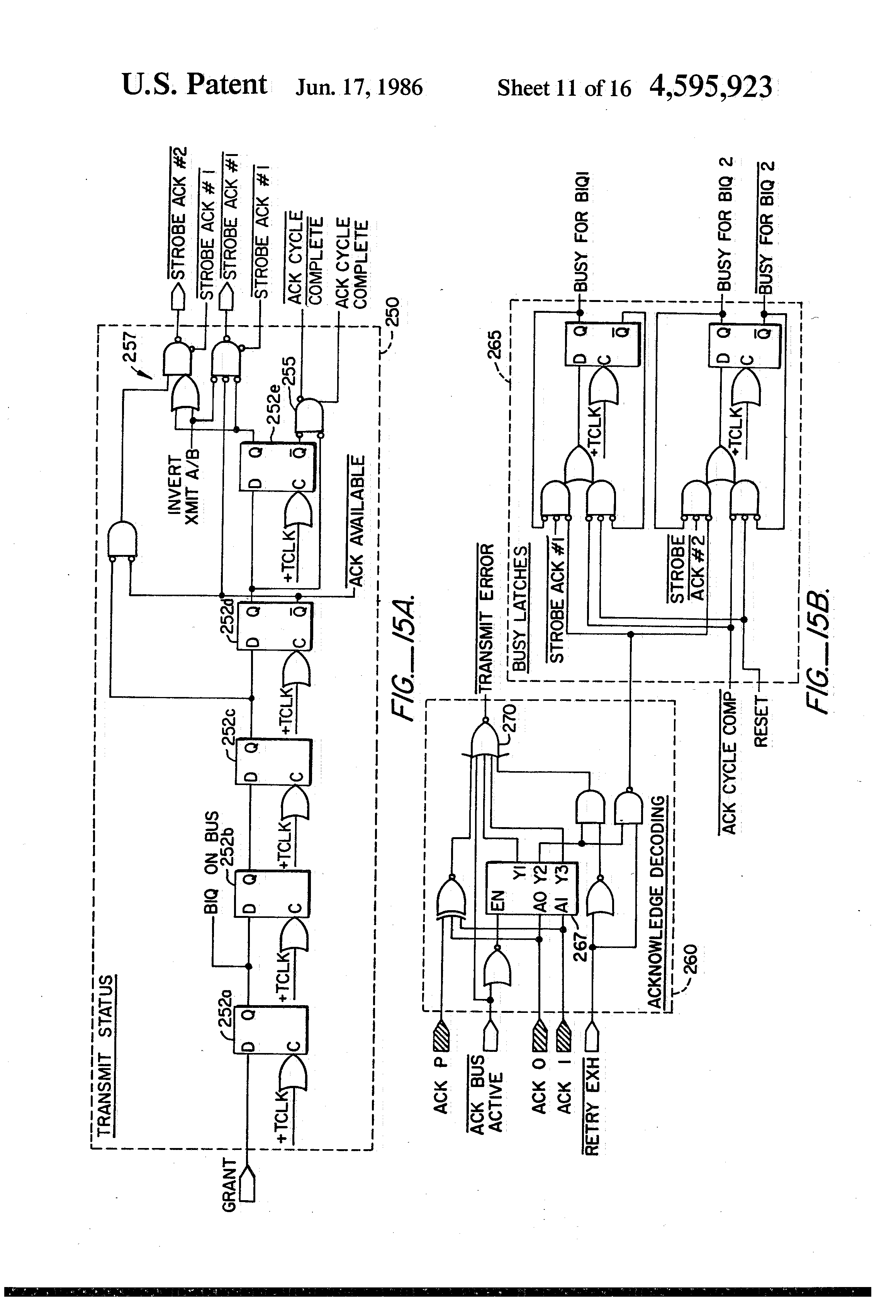 FIG. 15B is a logical schematic of ACK decoding circuitry 260 and busy latch circuitry 265 for generating a number of internal signals on the basis of the received ACK signals. More specifically, ACK decoding circuitry 260 includes a binary decoder 267 having output lines corresponding to the nonzero values for the ACK code. A five input NOR GATE 270 produces an internal signal, designated TRANSMIT ERROR, if the ACK signals had a parity error, if the ACK signals indicated that the transmitted data was received with a parity error, if there was not ACK bus activity when expected, if the receiving unit was broken, or if the receiving unit was busy and the specified number of retries has been made. Busy latch circuitry 265 correlates detection of a busy condition with the STROBE ACK signals to generate internal signals, designated BUSY FOR BIQ 1 and BUSY FOR BIQ 2.