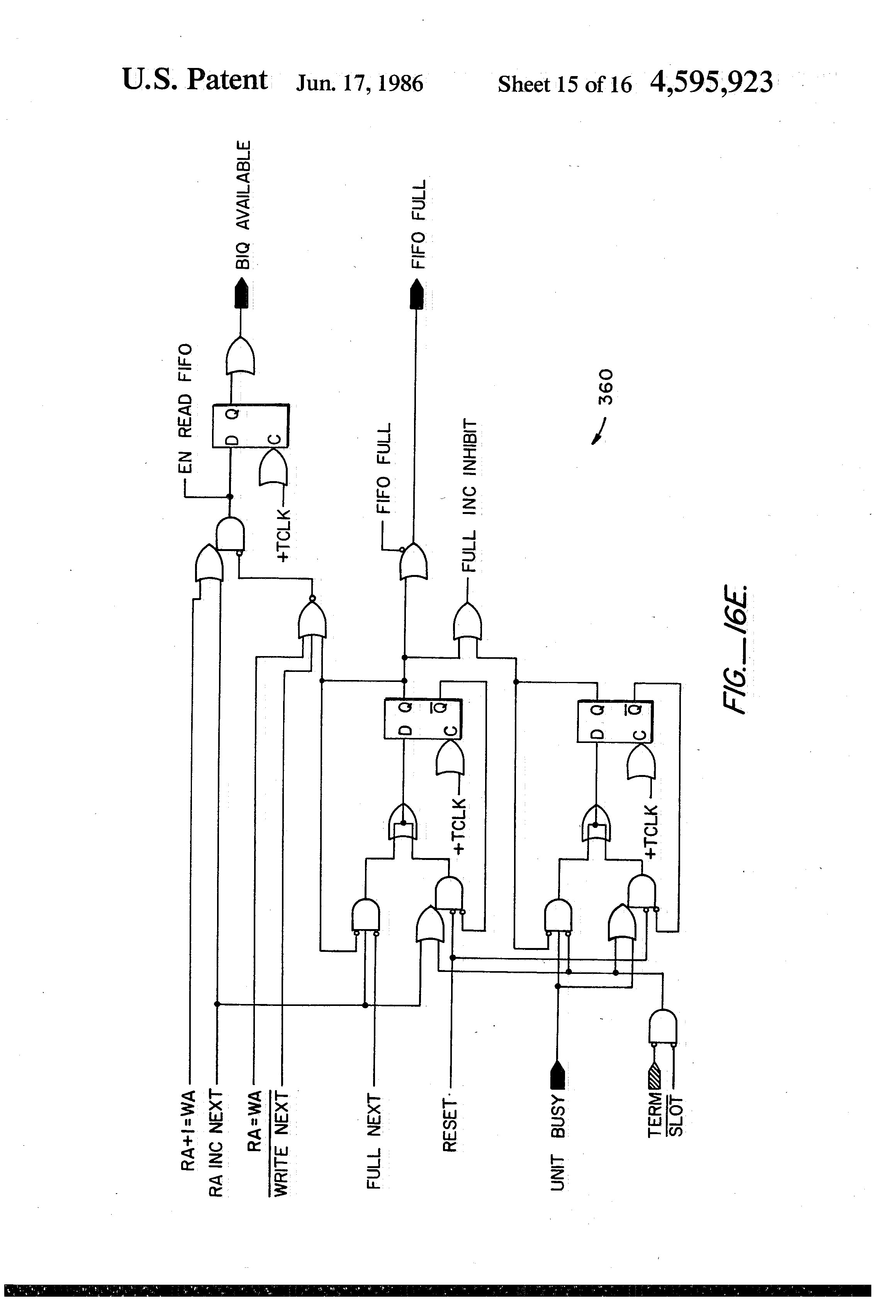 FIG. 16E is a logical schematic of functional unit interface circuitry 360 which generates a FIFO FULL signal and a BIQ AVAILABLE signal to inform the functional unit that a BIQ has been received in the FIFO. When the functional unit finishes reading the BIQ from the FIFO, it raises the READ FIFO line that is communicated to the read address pointer circuitry 320 to effect incrementing of the read address pointer. The BIQ AVAILABLE signal is valid whenever the FIFO read pointer is behind the FIFO write pointer.