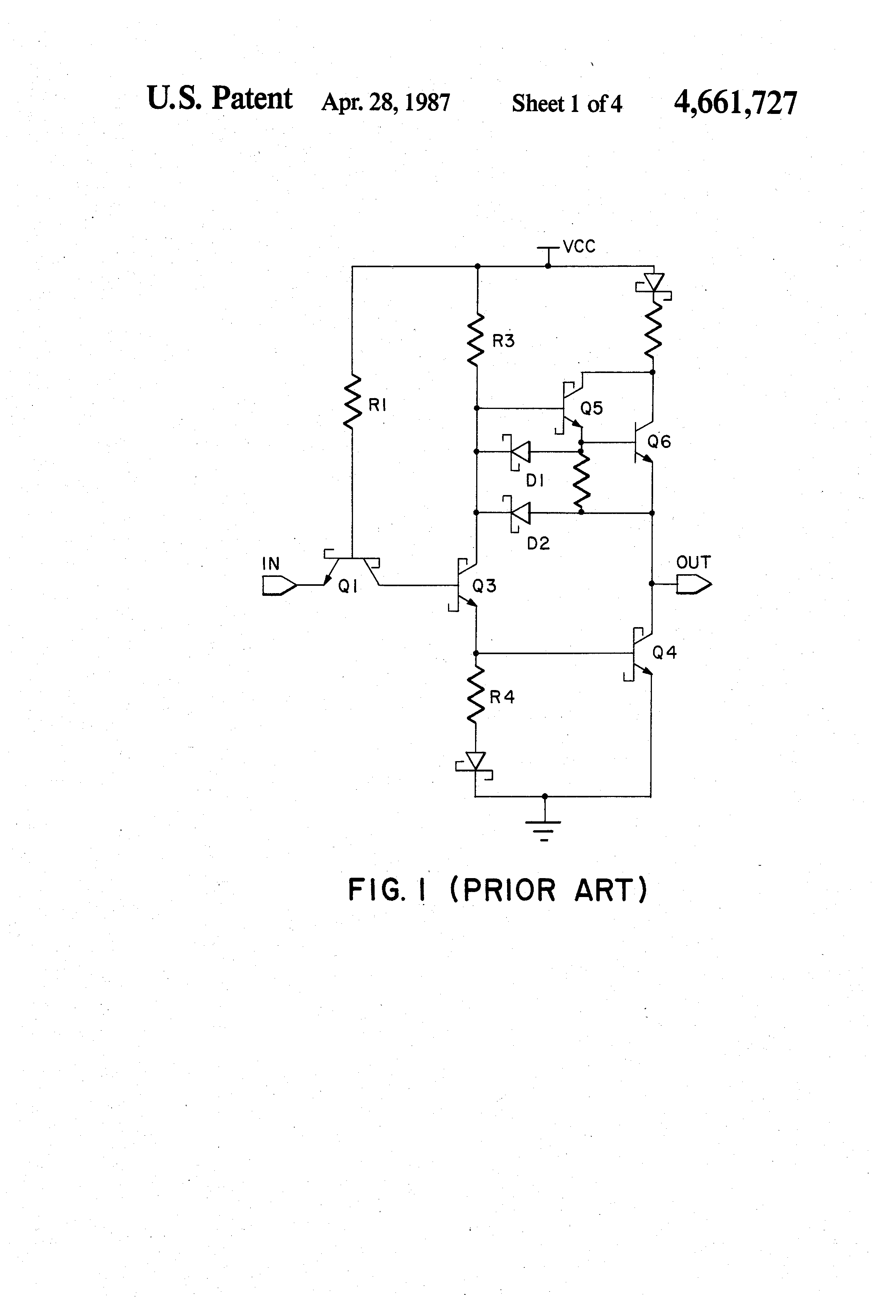 This invention relates to an improved multiple phase-splitter TTL tristate output device having a large sink current capability without increasing the power to the device. The invention is particularly suitable in output device applications for driving large capacity loads or low impedance transmission lines. A typical Transistor-Transitor Logic (TTL) output circuit or output device for delivering binary logic signals of high or low potential at the signal output OUT is illustrated in FIG. 1. The output device includes a pullup transistor element consisting of the Darlington transistor pair Q5 and Q6 for sourcing current to the signal output OUT from high potential source Vcc and for pulling the output OUT to the logic high level or high potential. The pulldown transistor element Q4 sinks current from the signal output OUT to low potential or ground for establishing a logic low level or low potential signal at the output OUT. The respective conducting states of the pullup and pulldown transistor elements are controlled by the phase-splitter transistor Q3. When a low level or low potential input signal appears at the signal input IN and input transistor Q1, the phase-splitter base drive current through base drive resistor R1 from high potential source Vcc is diverted and the phase-splitter transistor Q3 is nonconducting. The pulldown transistor Q4 is therefore also nonconducting. Base drive current passes through resistor R3 from potential source Vcc to the base of pullup transistor element Q5, part of the Darlington transistor pair Q5 and Q6. With the pullup transistor element conducting a logic high level or high potential appears at the signal output OUT. When a high level or high potential signal appears at the signal input iN, then base drive current through resistor R1 is directed to the base of phase-splitter transistor Q3 turning it on. With transistor Q3 conducting the base drive current to the pullup transistor element through resistor R3 is diverted through the collector to emitter of the phase-splitter to the base of the output pulldown transistor Q4. With pulldown transistor Q4 conducting a low level signal or low potential appears at the signal output OUT. The feedback diode D2 provides a large sink current capability when the output is at high potential for transition at the output from high to low potential. With phase-splitter transistor Q3 conducting the feedback current from the output through diode D2 is amplified by phase-splitter transistor Q3 and applied to the base of pulldown transistor Q4. As hereafter further explained, the increase in output sink current through pulldown transistor Q4 is proportional to β2 during transition from high to low level at the signal output OUT. As shown in FIG. 1 the typical TTL output device or output circuit with the feedback diode circuit and high current seeking mode is capable of operating only as a bistate device delivering high and low level logic signals at the output for low and high level logic signals appearing at the input. Unlabeled components of the output device of FIG. 1 are typical components well known to those skilled in the art. Further analysis indicates how the feedback diode D2 enhances the output sink circuit in the prior art TTL output circuit of FIG. 1. When the signal output OUT is at the binary low level or low potential, the output sink current IOL through the collector to emitter circuit of pulldown transistor Q4 is determined by beta, β, the gain of the pulldown transistor Q4 and the base current to transistor Q4, IbQ4. IOL=β*IbQ4 (1) With the signal output OUT at low potential and the phase-splitter transistor Q3 conducting, IbQ4 is in turn the Kirchoff sum of the collector current IcQ3 and the base current IbQ3 through transistor Q3 less the current through squaring network resistor R4, IR4, as follows: IbQ4=IbQ3+IcQ3-IR4 (2) IcQ3 is in turn the Kirchoff sum of the current through R3, IR3, and the current through D2, ID2. IcQ3=IR3+ID2 (3) Diode D1 provides a low impedance discharge path for the base of transistor Q6 and the current through diode D1 is neglected because in steady state conditions, it is either reverse biased or conducting substantially less than D2. If the output voltage Vo is less than the sum of the voltage drop across the base to emitter junction of pulldown transistor Q4, VbeQ4, the voltage drop across the collector to emitter junction of phase-splitter transistor Q3 at saturation, VsatQ3, and the voltage drop across diode D2, VD2, then no feedback current will conduct through diode D2 and the expression for the output sink current IOL through pulldown transistor Q4 is given by: IOL(Vo<VbeQ4+VsatQ3+VD2)=β*(IbQ3+IR3-IR4) (4) If, however, Vo is greater than VbeQ4+VsatQ3+VD2, then diode D2 will conduct sufficient current to pull the phase-splitter Q3 out of saturation and into the linear operating region. When phase-splitter transistor Q3 is operating in the linear region out of saturation, the collector current IcQ3 becomes: IcQ3=β*IbQ3 (5) The output sink current IOL through pulldown transistor Q4 therefore becomes: IOL(Vo>VbeQ4+VsatQ3+VD2)=β*((β+1)*IbQ3-IR4) (6) The difference IOLD in the output sink current IOL between the high and low voltage potentials at the output reduces to: IOLD=β2 *IbQ3-β*IR3 (7) The difference between the low voltage output sink current capability and the high voltage output sink current capability, that is the step up in the output sink current from low voltage potential to high voltage potential at the output is therefore proportional to β2. By use of the feedback diode D2, the ability of the typical bistate TTL output device to drive large capacity loads or to drive low impedance transmission lines is greatly enhanced without resorting to large increases in base drive to the pulldown transistor Q4 and without increasing the power requirements and power consumption of the output device. In order to provide a tristate TTL output device capable o