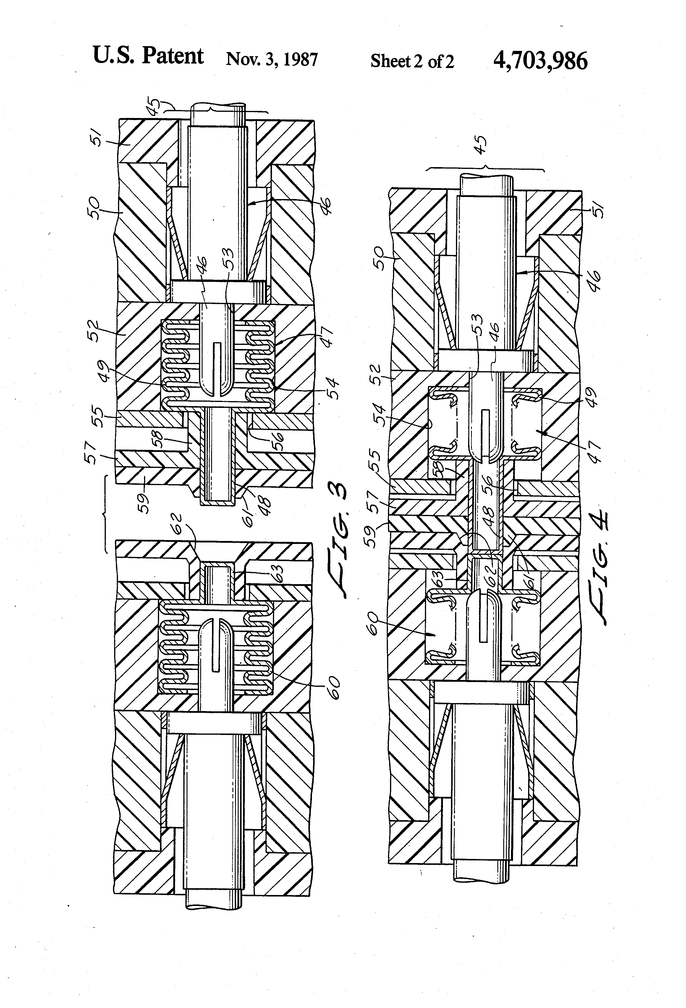 The present invention pertains generally to releasable electrical connectors and, more particularly, to such an electrical connector having improved butt contacts which automatically close off and shield the electrical connector on separation of the connector parts effecting isolation from external electromagnetic fields. A plug and receptacle connector with which the present invention is most advantageously employed includes plug and receptacle connector parts which are releasably mated to one another in order to interconnect one or more cable wires via internally located contacts. One commonly employed type of contacts consist of pin and socket contacts having male and female parts which are conductively joined on mating of the connector parts to effect the desired electrical interconnection. The pin and socket contacts are mated and unmated by relative movement along a single straight line axis and any attempt to separate the connector parts along other directions will damage or destroy the connector contacts. It is necessary in certain uses and circumstances (e.g., emergencies) to be able to rapidly release such a connector by relative movement of the connector parts in any of several different directions. For this purpose there is a known type of contacts for use in plug and receptacle connectors in which a male pin contact merely abuts against the end of a spring-loaded contact when the connector parts are joined to form an electrical connection therebetween. These "butt" contacts have the special utility of being able to withstand transverse bending forces applied to the connector, such as may happen when a connector is only partially mated or has been mated and inadvertently loosened. A decided advantage over pin and socket contacts is that transverse bending forces when applied to a pin and socket contact can break or damage the contacts impairing operation of the connector and producing electrical shorts. Still further, butt contacts can be disconnected by moving the connector parts transversely from one another rather than merely toward and away from one another. An electrical connector with which the described invention can be advantageously utilized includes plug and receptacle parts which are releasably mated together in order to connect one or more cable wires via included electrical contacts. The plug connector part consists of a metal shell within which there is received a rubber or plastic insert having openings therein to receive respectively pin-like contacts extending from a front face thereof. A resilient interface rubber or plastic seal is located on the front of the insert and through which the outer ends of the pin contact extend. The receptacle includes an outer metal shell within which a plastic or rubber insert is received similarly having a plurality of openings therethrough corresponding in number and arrangement to the pins in the plug and within which receptacle openings there are individually received bellows contacts having forwardly extending concave surfaces adapted to receive the end of the pin contact in use. The outer or front face of the receptacle also includes a grid plate which completely covers the face except for a plurality of openings directly opposite each of the bellows contacts. The grid plate is conductively secured at its edges and integral with the receptacle shell. Each bellows contact includes an elongated solder post to which cable wire can be soldered or, alternatively, crimped. At the opposite end, a spring-like bellows member has an outer end part with a concavity at its end adapted to receive the outer end of a pin contact in abutting conductive relationship in use. More particularly, each bellows contact is mounted such that in the unmated condition the bellows extends and completely closes off each opening in the grid plate thereby effecting an EMI shield for the conductors. On mating of the plug and receptacle the pin contact exerts a force against the bellows moving it away from its shielding condition to the grid plate and into full contact with the solder post thereby establishing the desired connection aspect. In accordance with an alternative version, the contacts used in each of the connector parts are identical and each of the connector parts includes a grid plate which covers the connector part front except for access openings to the individual contacts. Each contact includes a base portion having an open end for receiving a cable wire to be soldered or crimped therein and a split-pin end. A bellows shell is located about the split pin end and which bellows is normally spaced from the split end of the pin when the bellows is in extended relation and when compressed is in conductive contacting relationship with the split end of the pin. A rod-like pin affixed to the outer end of the bellows extends through a grid opening and projects outwardly from the grid surface. An insulative interface plate is received over the grid plate outer face and includes openings which are aligned with the respective openings for the contacts and through which extend the rod-like extensions of the bellows. When the plug and receptacle connector parts are axially joined together, the rod-like extension of the two bellows contacts abut against one another and press the bellows on each until there is a full conductive relationship between the pins, bellows and rod-like extensions thereof, and in that way effect the desired connection between the cable wires. FIG. 1 is a side elevational, sectional view of a first version of butt contacts shown in separated or unmated condition. FIG. 2 is a side elevational, sectional view of the contacts of FIG. 1 shown fully mated. FIG. 3 is a side elevational, sectional view of a further embodiment of butt contacts shown in separated condition. FIG. 4 is a side elevational, sectional view similar to FIG. 3 showing the contacts when mated. A well-known plug and receptacle connector at the present time includ