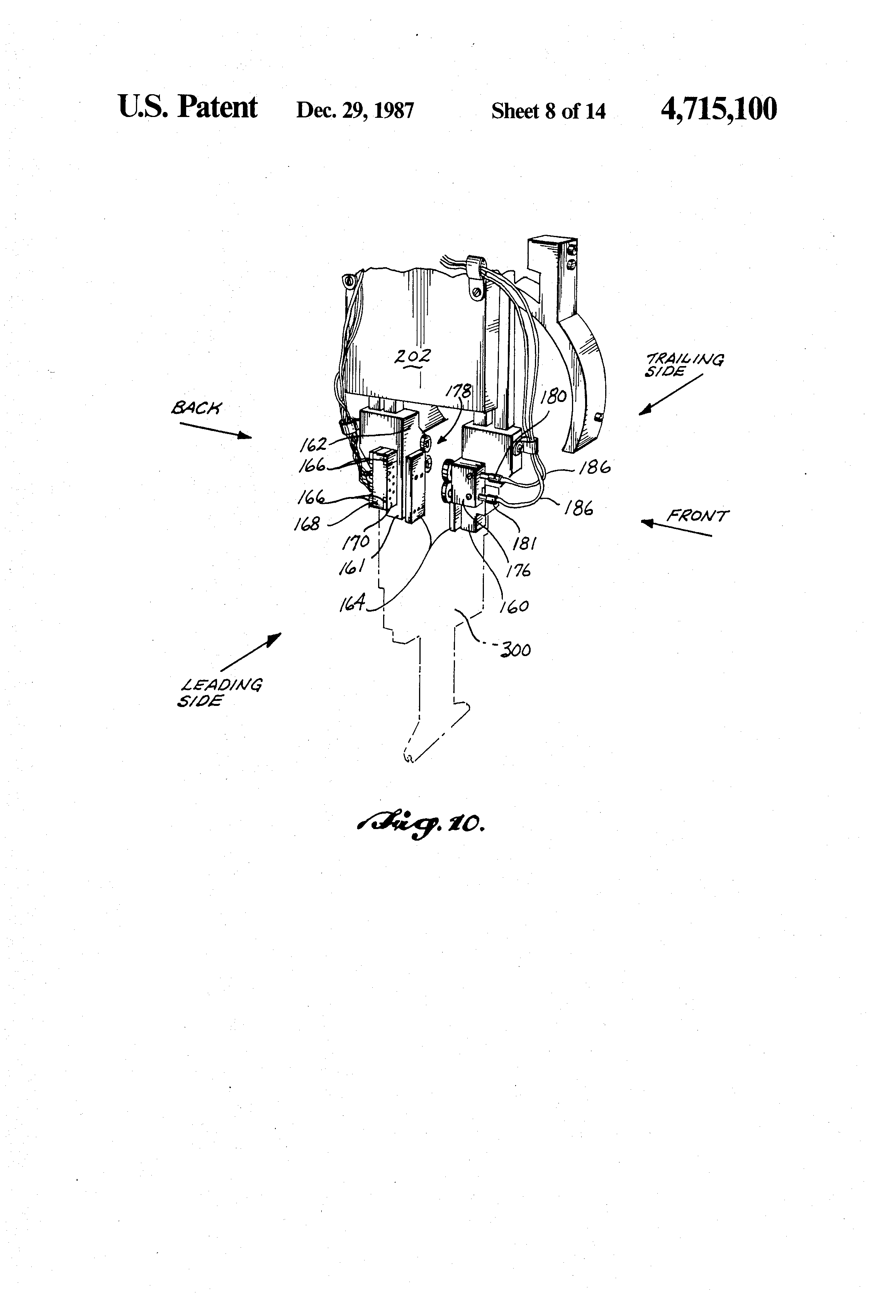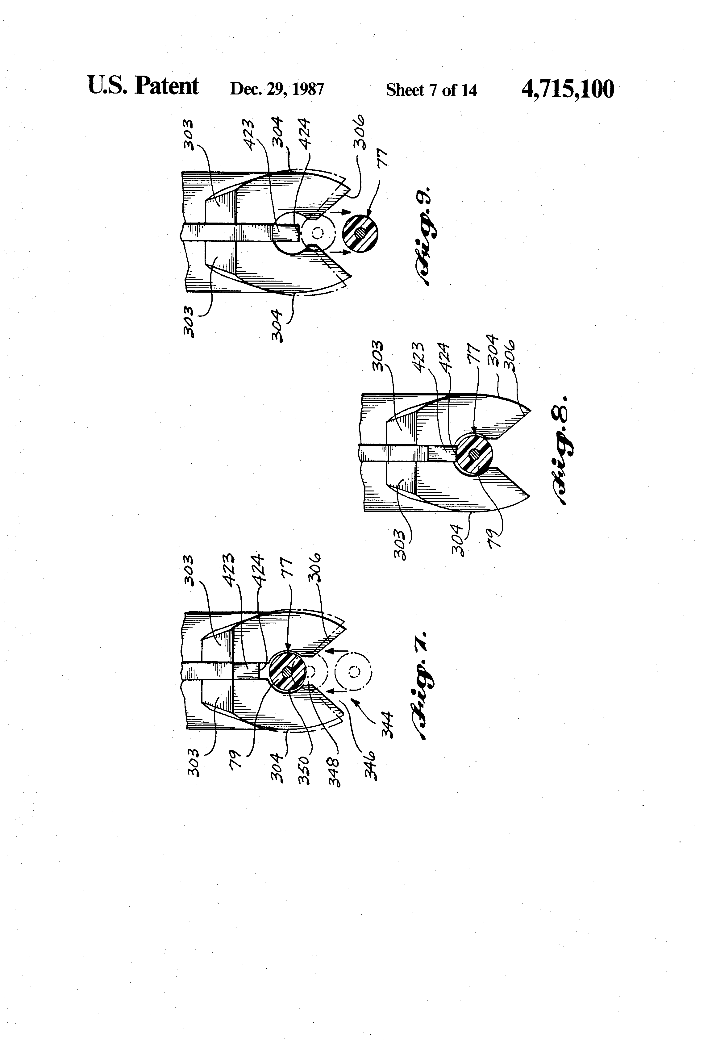 The United States Government has rights in this invention pursuant to Contract No. DAAH01-82-D-0013-0003 awarded by the U.S. Army. This application is a continuation-in-part of an application filed June 4, 1985, Ser. No. 741,318, entitled Robotic Wire Harness Assembly System, Now U.S. Pat. No. 4,677,734, which is a continuation-in-part of Ser. No. 539,768 filed Oct. 17, 1983 now U.S. Pat. No. 4,520,766. This invention relates to a wire routing tool that is carried and controlled by a robot for automated assembly of a wire harness. A wire harness is a bundle of wires that can be handled as an element and can be easily installed to interconnect components of various electrical and electronic systems. The shape of a wire harness is dictated by the environment for the harness and the particular location of connections for the harness. Accordingly, a wire harness often includes one or more bands and branches for routing various wire segments of the harness to their corresponding connection points. A harness often includes 50 or more wires, each uniquely terminated and uniquely positioned. It is important that each wire extend from a predetermined position on one connector to the corresponding position on a second connector. Bends must be formed into each wire during layup or the final product since it is difficult to bend the assembled bundles of wires. When done manually, the wires are cut to length after being inserted into the originating connectors and being laid up in the necessary path. Each wire must be identified so that the technician can place the correct wire in the correct contact. Even for simple harnesses, the manual assembly of wire harnesses is extremely labor intensive. Robotics in manufacturing has recently led to research and development of robotic systems for assembling wire harnesses. To achieve robotized assembly, special tools for handling the wire had to be developed, since the lengths of wire were difficult to handle without some precise control. While robots can move in predefined paths, they are not intelligent and cannot make even rather minor course corrections. Therefore, the tools necessarily were designed to overcome the variations that would undoubtedly occur so that the preciseness of the robot motion could still be utilized. This invention is directed to a wire routing tool that is adapted to be carried by a robot, such as the IBM 7565 robot, for sequentially positioning wire segments in a predetermined configuration in a wire harness. The various functions performed by the tool include installing one end of a precut wire segment to an electrical connector that is positioned on a wire harness form board; routing the wire segment along its proper path; and installing the second end of the wire segment to a second connector are similar termination. To perform these functions, the tool is adapted for selectively grasping and dispensing the wire segment. In its broadest aspect, the present invention relates to a tool for grasping a wire segment and for moving that wire along a predefined spatial line so that an end can be inserted into a connector. The tool also allows the wire to slide freely when the robot traces the path between the lead connector and terminal connector when positioning the wire in a harness. A preferred embodiment of the tool includes two legs pivotably connected to a base, with each leg being independently capable of engaging the wire and being capable of guiding longitudinal movement of the wire. A preferred tool also includes pneumatic actuators connected for independent longitudinal movement of each leg about its pivot and for independently actuating clamps that either grasp the wire or release the wire so that it can be dispensed. The preferred tool also includes a detector and associated circuitry for detecting the location of electrically conductive portions of the otherwise insulated wire (e.g., terminals installed to an end of the wire) . FIGS. 1 and 2 illustrate a robotic wire harness assembly system using the wire routing tool of this invention; FIG. 3 is an isometric view of the wire queuing and wire layup subsystems of the wire harness assembly system; FIG. 4 is an isometric view of the manipulator arm of the layup robot positioned over a form board; FIG. 5 is an isometric view of bays of the wire queuing subsystem; FIG. 6 is an isometric view showing the tool engaging a wire segment in a bay; FIGS. 7, 8 and 9, are end views of a foot of the routing tool showing grasping release and ejection of a wire; FIG. 10 is another isometric view of the manipulator arm of the layup robot, illustrating connection with the routing tool; FIG. 11 is a side view of a preferred routing tool; FIG. 12 is a front view of the routing tool of FIG. 11; FIG. 13 is a front sectional view of the routing tool taken generally along line 13--13 of FIG. 11; FIG. 14 is an exploded view of the tool of FIG. 11; FIGS. 15 through 18 depict movement of the wire within the tool; FIG. 19 is a schematic diagram of a detector circuit associated with the second leg of the tool of FIG. 11; and, FIG. 20 is an isometric view showing the tool inserting the end of a wire segment into an end connector held in a connector block. A. System Overview As shown in FIGS. 1 and 2, the system 10 is an integrated combination of hardware and software capable of producing an electrical wire harness 15. Data necessary for controlling each subsystem of the system 10 is generated in an off-line CAD computer and is transmitted from the computer to a control system 30, which includes: a master system computer 25; data input devices (such as keyboard 31); and data output devices (such as a CRT 32 and printer 33). The system computer 25 supplies control signals to a wire preparation subsystem 35, a wire reeling subsystem 40, a wire termination subsystem 45, a wire queuing subsystem 50, and a wire layup subsystem 55, as described in U.S. Pat. No. 4,520,966 and U.S. patent application Ser. No. 7