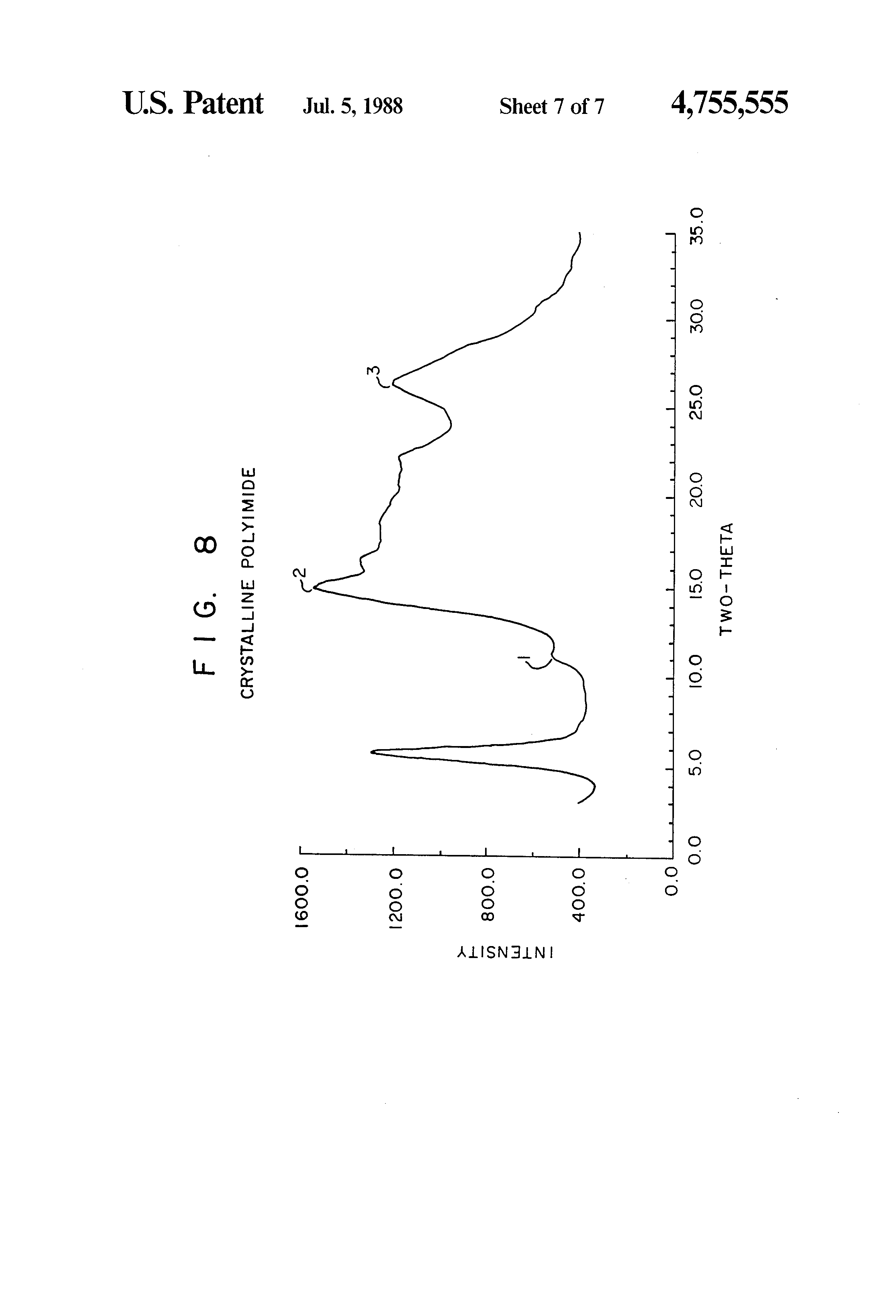 This is a Continuation-in-Part of copending application Ser. No. 727,811, filed Apr. 26, 1985, now U.S. Pat. No. 4,622,384, granted Nov. 11, 1986. Aromatic polyimide materials are generally prepared by the reaction of an organic diamine with a tetracarboxylic acid dianhydride to form a polyamide acid, with subsequent conversion of the polyamide acid to a polyimide. Techniques for the preparation of such polymers are found, for example in Endrey, U.S. Pat. No. 3,179,631, British Pat. No. 981,543, and Gall, U.S. Pat. No. 3,249,588. The Endrey patent involves simultaneously converting the polyamide acid to the polyimide and precipitating the polymer from solution. An alternative technique previously suggested and illustrated in example 7 of the Endrey patent involves first precipitating the polyamide acid and subsequently converting the polyamide acid to polyimide by thermal or chemical means. This results in resins having low crystallinity and low surface area. The processes shown in the Gall patent result in polyimides having high surface area and high crystallinity. Polyimides are used industrially in a wide variety of applications. For example, polyimides can be formed into a shaped article such as a film, or can be compounded into a coating enamel. Still other uses for such resins are in molding applications, in which polyimide in particulate form is fabricated into various configurations that can be used in a variety of technically demanding environments such as jet engines, business machines, automotive components and diverse industrial equipment. Such molded polyimide parts are capable of withstanding high temperatures and exhibit excellent bearing properties, good electrical properties and excellent creep resistance. However, continuing effort has been directed to the improvement of the mechanical properties of these resins, such as toughness, which would permit their use in a still broader range of high temperature environments. The present invention provides an improved polyimide molding resin which is characterized by excellent toughness in a molded configuration. Specifically, the instant invention provides, in solid particulate polyimide, the polyimide having the recurring unit The invention also provides molded articles of this polyimide, which, when molded to a density of at least about 1.30 g/cc and without filler, exhibit improved tensile elongation and tensile strength over molded articles of the same polymer in its crystalline form. The invention further provides, in a process for the preparation of a solid particulate polyimide by the reaction of (1) at least one organic diamine of the formula H 2 N--R'--NH 2 , wherein R' is a divalent radical containing at least one six-carbon atom rings, each ring characterized by benzenoid unsaturation, and, when at least two rings are present in R', no more than one valence bond is located on any one of said rings, and (2) at least one aromatic tetracarboxylic acid dianhydride and converting the resulting product to polyimide, the improvement which comprises: (a) reacting the diamine and the dianhydride in a solvent having a pH of about from 8.0 to 10.0; (b) maintaining the concentration of the solution resulting from the reaction of the tetracarboxylic acid dianhydride and the organic diamine at about from 1 to 15% polymer; (c) bringing the polymer solution into contact with a nonsolvent for the resulting polymer at a temperature of about from 0° to 65° C.; (d) maintaining the ratio of the nonsolvent and original polymer solvent such that the combined solvent and nonsolvent contains no more than about 70% solvent; and (e) agitating the mixture of polymer solution and nonsolvent to bring the nonsolvent and the solution into intimate contact so as to provide a surface area in the polyimide resin of greater than about 20 square meters per gram. FIGS. 1, 2 and 3 are graphical illustrations of the performance of molding resins of the present invention compared to prior art resins when immersed in sodium hydroxide solutions. FIG. 4 is a graphical comparison of tensile strength when resins of the present invention and the prior art are exposed to refluxing acetic FIGS. 5 and 6 are graphical comparisons of tensile strength and elongation of resins of the present invention and the prior art containing various concentrations of graphite. FIGS. 7 and 8 are representative x-ray diffraction curves of substantially amorphous and crystalline polyimides, respectively. The reactants used to prepare the present polyimide compositions are those described in Gall U.S. Pat. No. 3,249,588, hereby incorporated by reference. In addition to those reactants specifically disclosed in the Gall patent, reactants can be used in which R2, R3, and R7, as described in Gall, are partly or fully halogenated. The present invention is based on the discovery that rigid, normally crystalline polyimides of the type described in the Endrey patent, when prepared under process conditions as defined herein, can be made in a particulate form which is characterized by high surface area and a substantially amorphous crystalline state. These particulate polyimides, when molded using high pressure according to conventional techniques, give products which are characterized by a significant improvement in toughness. Depending on the composition of the polyimide, tensile strengths can be improved by as much as 3 fold (300%). At the same time, elongation at break of these products can be improved as much as 10 fold (1000%). By contrast, polyimides which are not rigid or which exhibit low crystallinity, when prepared by conventional solution-phase imidization, will benefit little or not at all from the formation of a substantially amorphous molding resin. The present invention is applicable, as noted above, to polyimides which are normally crystalline and rigid, that is, the polyimide repeating units of which contain less than two flexible linkages. Such polyimides include rod-like 