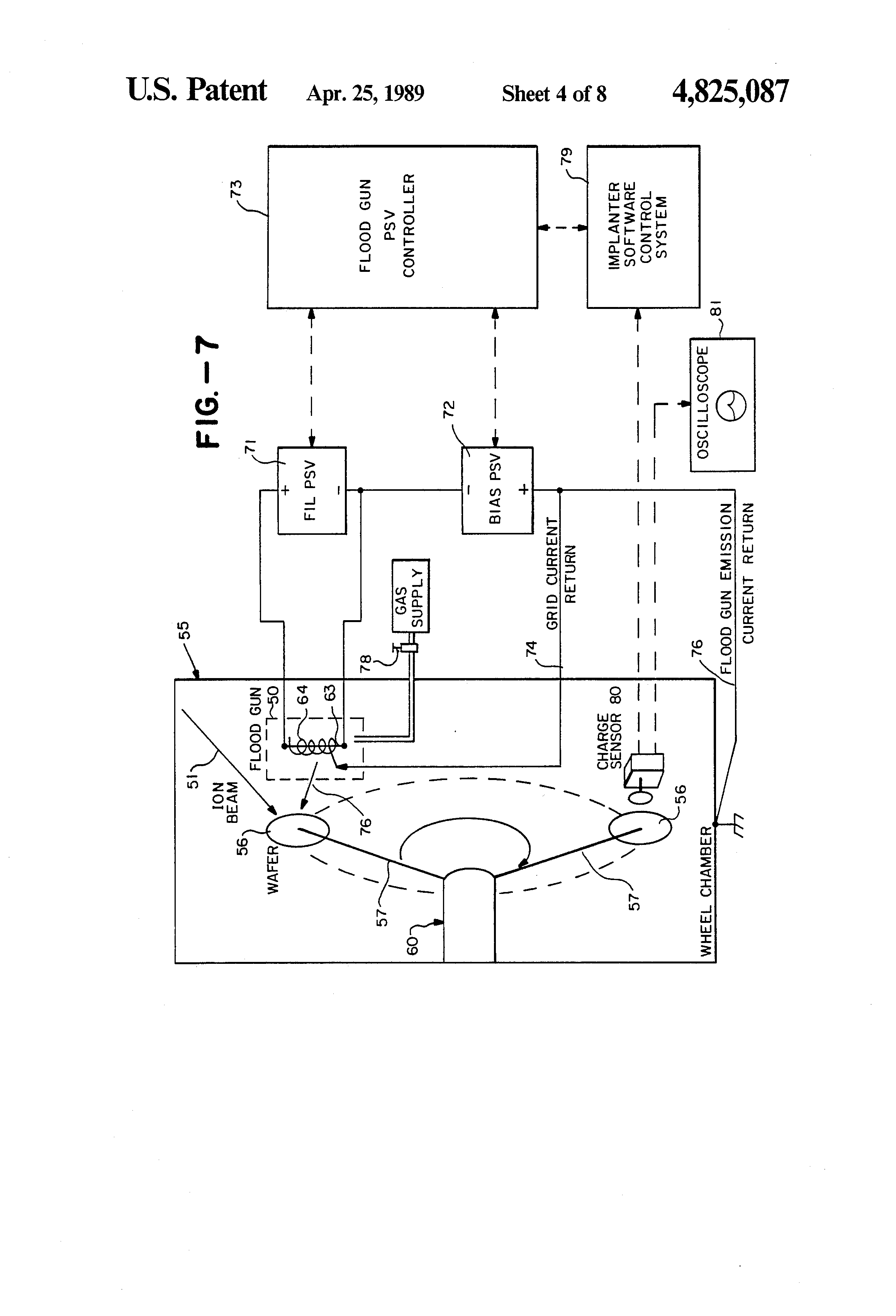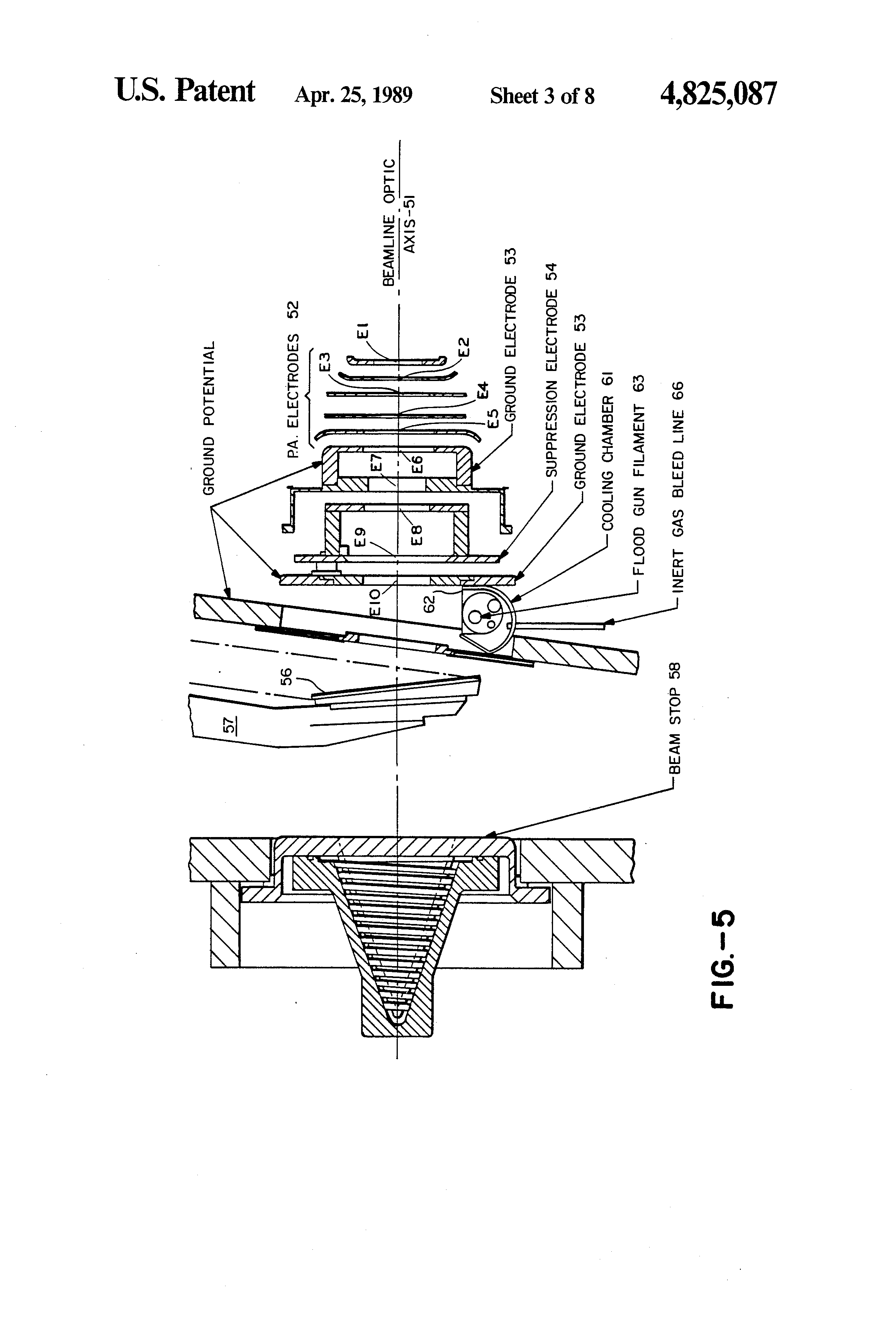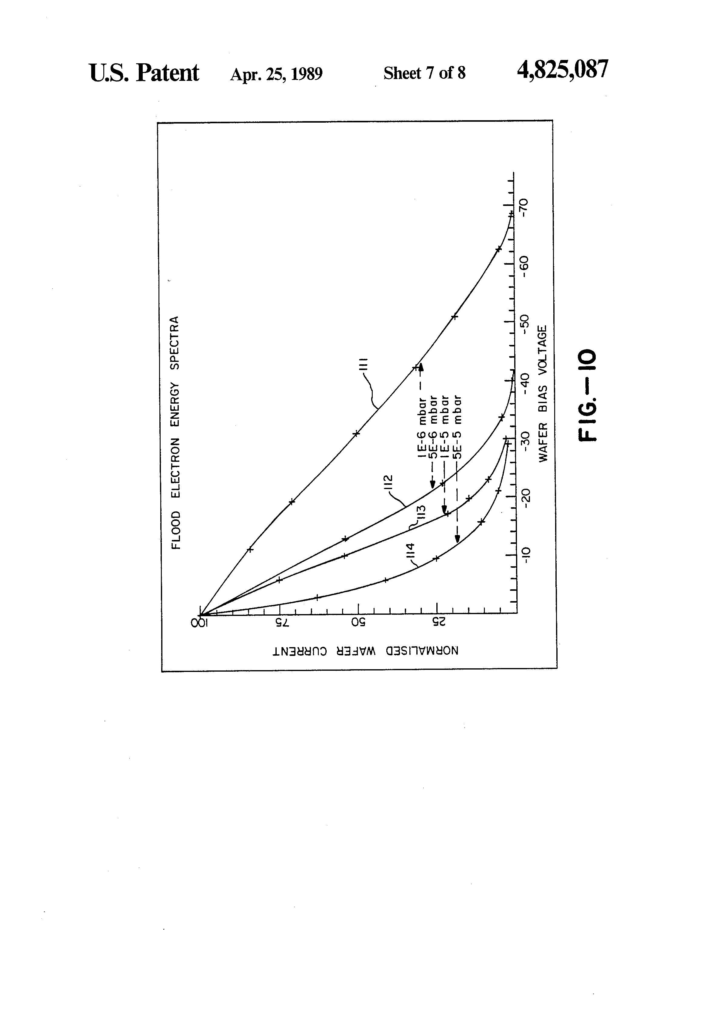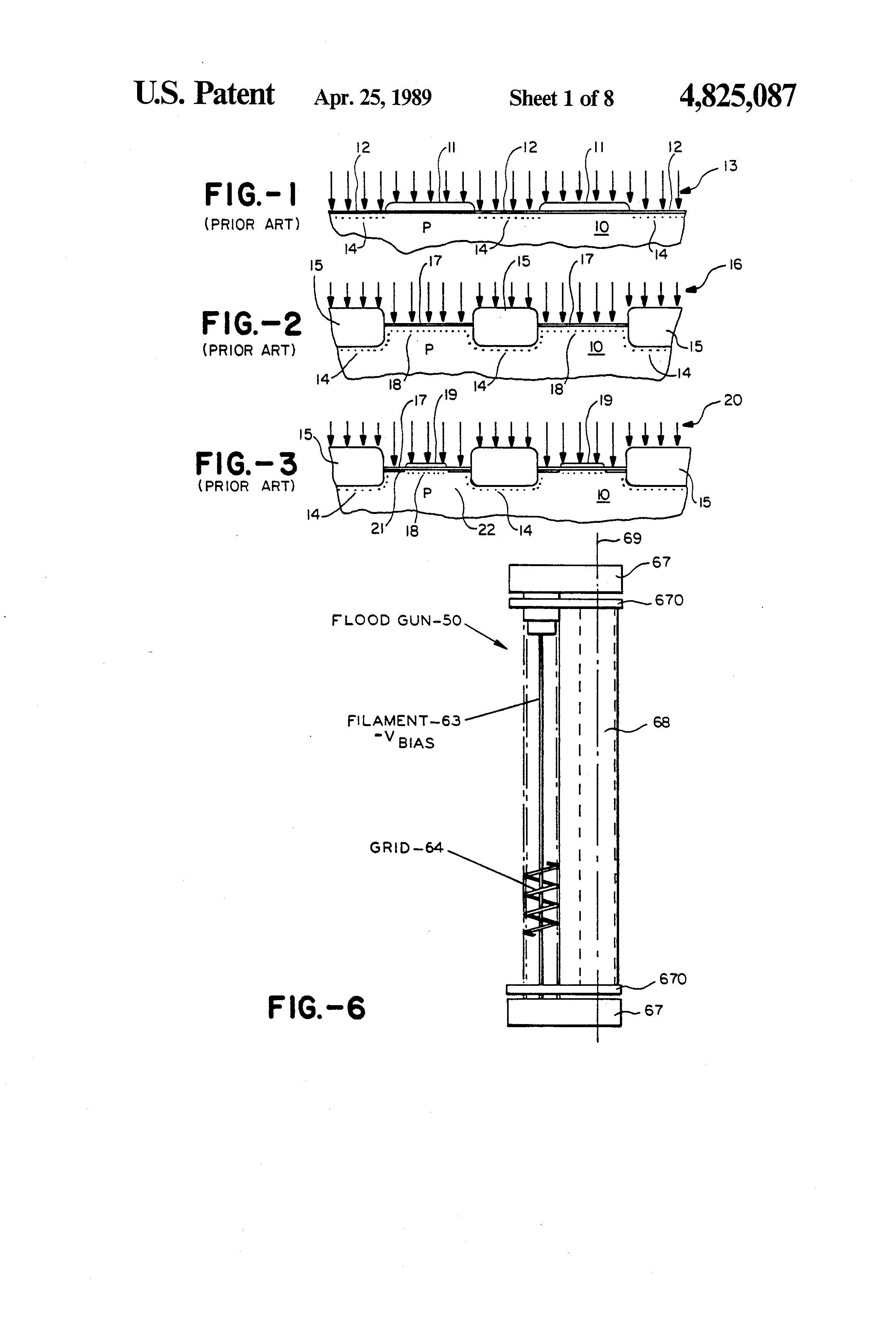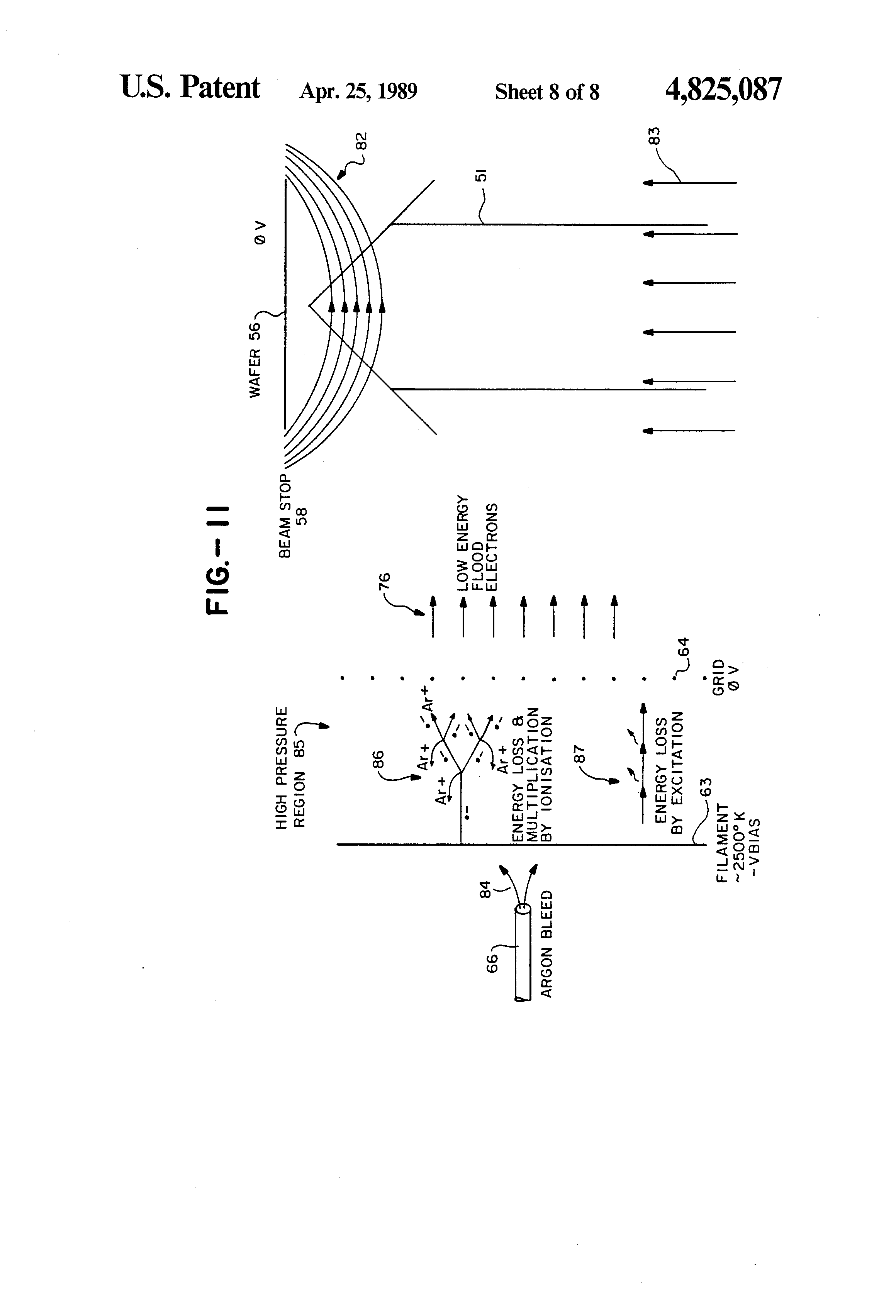 The apparatus and system and methods of the present invention are applicable to ion implantation systems such as the PI 9000 system available from Applied Implant Technology of Horsham, England, a subsidiary of the Assignee, Applied Materials, Inc. of Santa Clara, Calif. The PI 9000 system is described in Aitken U.S. Pat. No. 4,578,589, which issued Mar. 25, 1986, and is assigned to Applied Materials, Inc. This patent is incorporated by reference in its entirety. The present invention relates to wafer charge reduction systems for ion implanters, and to so-called electron flood guns for introducing negative charge into the ion beam to reduce positive charging of ion implanted wafers. In particular, the invention relates to an electron flood gun and to methods of operation which provide a hitherto unattainable combination of large magnitude flood electron current and low energy characteristics which are required to control or eliminate both local and bulk positive charging by the ion implant beam. FIGS. 1-3 illustrate the use of a sequence of ion implantation steps in fabricating CIS (conductor-insulator-semiconductor) integrated circuit devices on a semiconductor wafer. FIG. 1 illustrates a first ion implantation step which may be performed on the P-type wafer 10 to produce a light implant in the field regions 14 of the wafer. The field regions 14 at this point are not covered by the region of photoresist mask 11. The photoresist 11 is formed using a standard lithography process in which a thin layer of resist is applied over the entire surface of the wafer. After the layer of resist has been exposed and developed, a thin layer of thermal oxide 12 typically is grown over the exposed surfaces of the semiconductor wafer so that the implant in the field regions 14 will be made through the thin oxide layer. Next, the light field implantation of ions of a P-type material such as boron is done to provide greater electrical isolation between the active device regions which lie under the regions 11 of photoresist material. Then, thick field oxide regions 15 are grown using a wet oxidation process. See FIG. 2. During this oxidation process, the implanted ions 14 are driven into the semiconductor substrate to underlie the field oxide regions 15. The mask 11 is then removed, a thin gate oxide 17 is formed in the active device regions 18, and a second ion implantation step is performed to implant N-type dopant ions 16 through the gate oxide layer 17. This light implant step creates the implanted region 18 and tailors the threshold voltage of the MOS (metal oxide semiconductor) silicon gate field effect transistor. See FIG. 3. After this light threshold-setting implant, the silicon gate regions 19 of the field effect transistor devices are formed on the wafer to produce the device topology shown in FIG. 3. Then, a heavy implantation of N-type ions may be performed to simultaneously dope the silicon gate element 19 and the source and drain regions 21 and 22 to complete the basic structure of the silicon gate field effect transistor device. Of course, additional fabrication steps are required to complete typical integrated circuits, including additional ion implantation steps. The present invention is directed to device performance degradation and the concomitant decrease in yields which can result from positive charging of the target semiconductor wafer during ion implantation steps such as are described above. Positive charging typically manifests itself in two ways, as bulk charging or as localized charging. Bulk charging occurs during ion implantation because limited charge mobility causes the whole surface to become charged. Localized charging manifests itself when conductive regions or layers (such as the gate electrodes 19 shown in FIG. 3) which are isolated from the conducting substrate by a dielectric (such as gate oxide 17, FIG. 3), charge up. The positive charge which is induced in a semiconductor wafer target during ion implantation usually can readily exceed a few volts. However, depending upon the device architecture, development of a positive charge of only a few volts magnitude on a dielectrically isolated conductor "island" such as a gate electrode 19 can create a field across the underlying dielectric which is sufficient to cause breakdown and loss of dielectric integrity and, as a consequence, render the device inoperative. While local charging can be a problem for bi-polar circuits, it presents very difficult problems for MOS and CMOS (complementary metal oxide semiconductor) circuits, more so as the technology implements thinner gate oxides and high dose implants. To our knowledge, the prior art does not suggest an adequate solution to the positive charging problem. Simple diode electron flood guns which introduce electrons into the ion beam have been available for some time. See, for example, Bower U.S. Pat. No. 3,507,709, issued Apr. 21, 1970. However, to be effective for contemporary and future ion implant systems, such flood guns must be able to provide low energy electrons at high current levels. This is so because, first, contemporary so-called medium current implanters and high current implanters utilize high ion implant beam current levels, within the approximate range 0.1-5 milliamps (mA) for medium current operation and 5-100 milliamps for high current operation. Clearly, effective neutralization of wafers which are implanted using such large magnitude currents requires much larger electron flood currents, current levels roughly comparable to the ion beam current. Second, the flood electrons must have low energy in order to have sufficient "selectivity" to the wafer surface which, as mentioned, is charged positive with respect to earth or ground. Clearly, for the electrons to be attracted to the positively charged regions of the wafer surface their trajectories must be affected by the small electric fields associated with the low voltage positive charge. This can only happ
