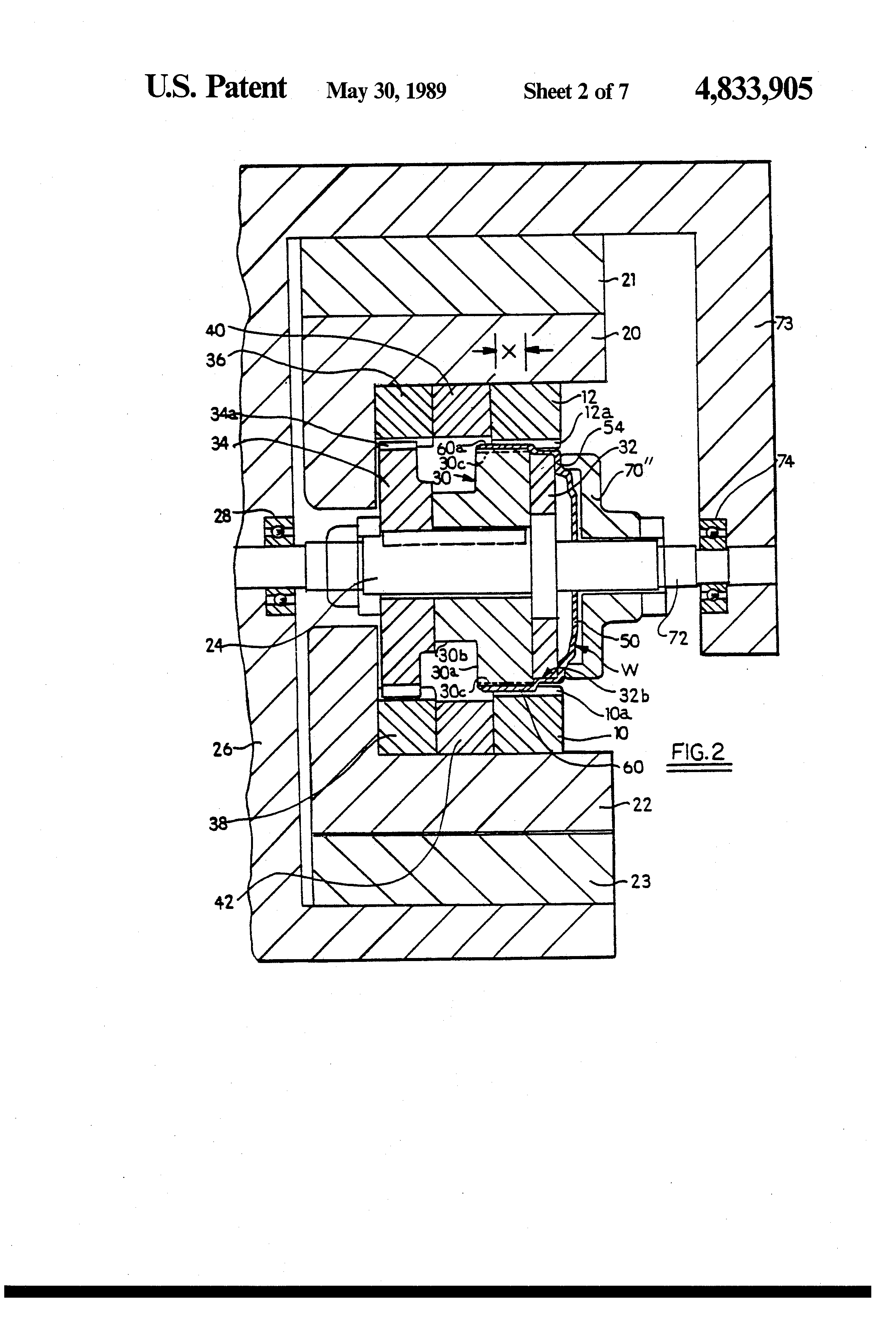 However, to-date prior art workers have had difficulty using the types of machines and methods described hereinabove in manufacturing a splined cup-shaped power transmission member, such as a clutch hub, within the well known six or eight sigma tolerance which includes total part print tolerances. In particular, prior art workers have had difficulty with respect to the axially extending splines or teeth on the sleeve portion and especially in meeting the specific tolerance limiting taper of the splines along the longitudinal axis of the sleeve prescribed by users of the parts, such as automobile manufacturers. This problem has frequently been referred to as "bellmouthing" of the sleeve characterized by an outward tapering of the splined sleeve in a longitudinal or axial direction from the annular end wall toward the open end of the sleeve. A typical tolerance for "bellmouthing" has been set as 0.016 inch for a particular clutch hub for power transmissions. Furthermore, it has been difficult to provide the desired longitudinal tooth tolerance (bellmouth tolerance) and at the same time maintain the proper roundness tolerance for the cylindrical oil seal surface or sleeve of the clutch hub. A typical tolerance for oil seal surface roundness has been set as 0.006 inch for the clutch hub just mentioned. The oil seal surface is typically connected to the sleeve portion of the power transmission member by a so-called transition region which heretofor has not been splined or otherwise substantially deformed in the splining process since past experience indicated that splining of the transition region could increase out of roundness of the oil seal surface.