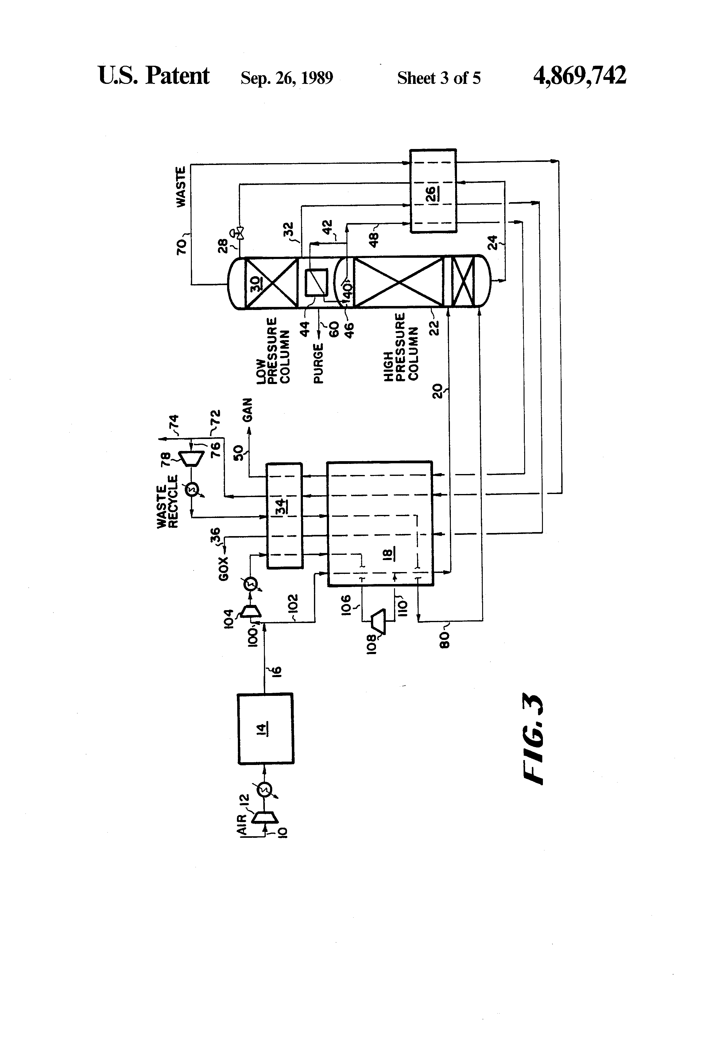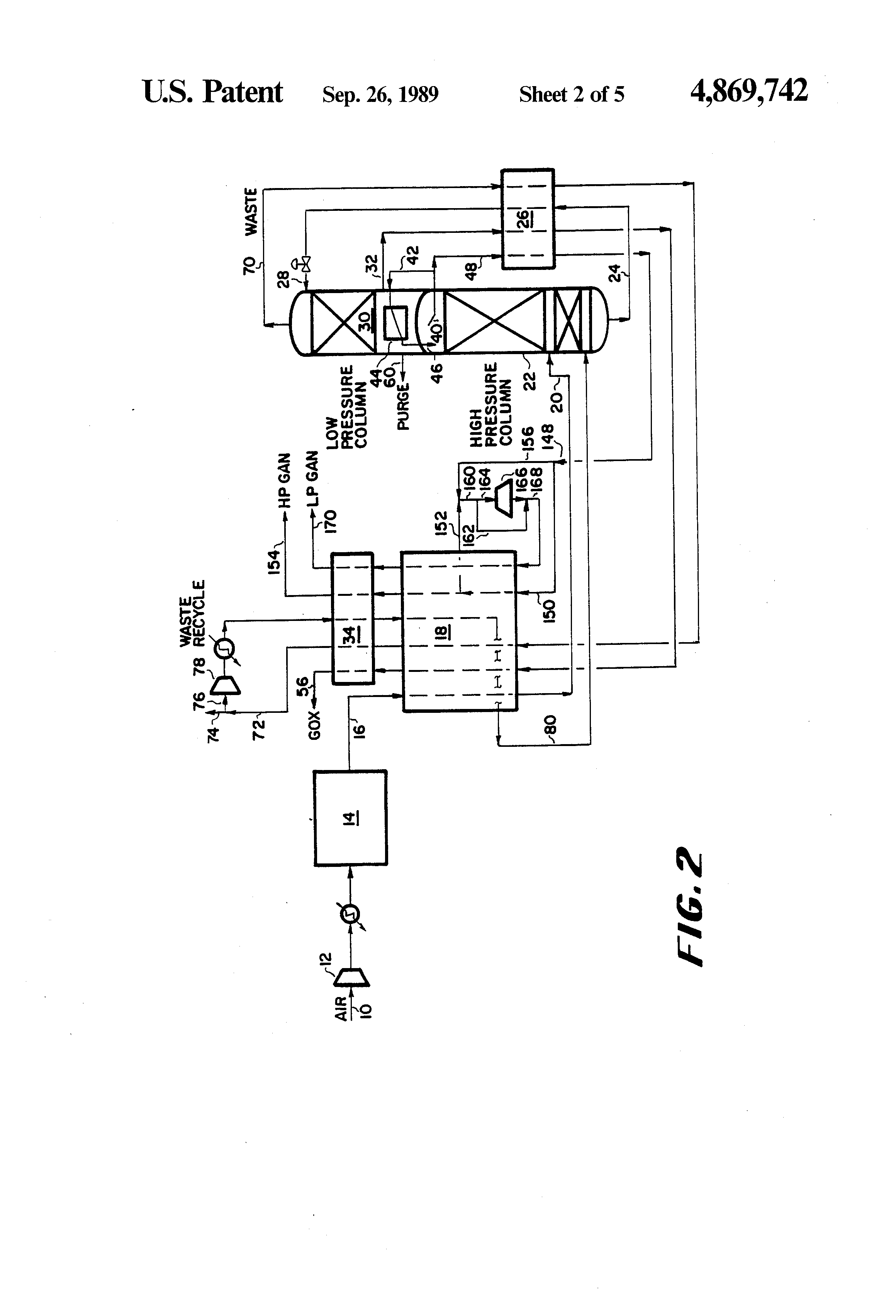The present invention is an improved process for the production of nitrogen and oxygen that uses a double distillation column arrangement. The improvement to the process is the recycling of at least a portion of the oxygen-enriched waste stream to the bottom of the high pressure column. As a result of this improvement, the process is capable of making a nitrogen product with high purity (e.g., 5 ppm oxygen product) at high pressures (e.g., 40 to 150 psia) while simultaneously producing high purity oxygen (e.g., 99.6% oxygen). Nitrogen is produced only from the high pressure column.
