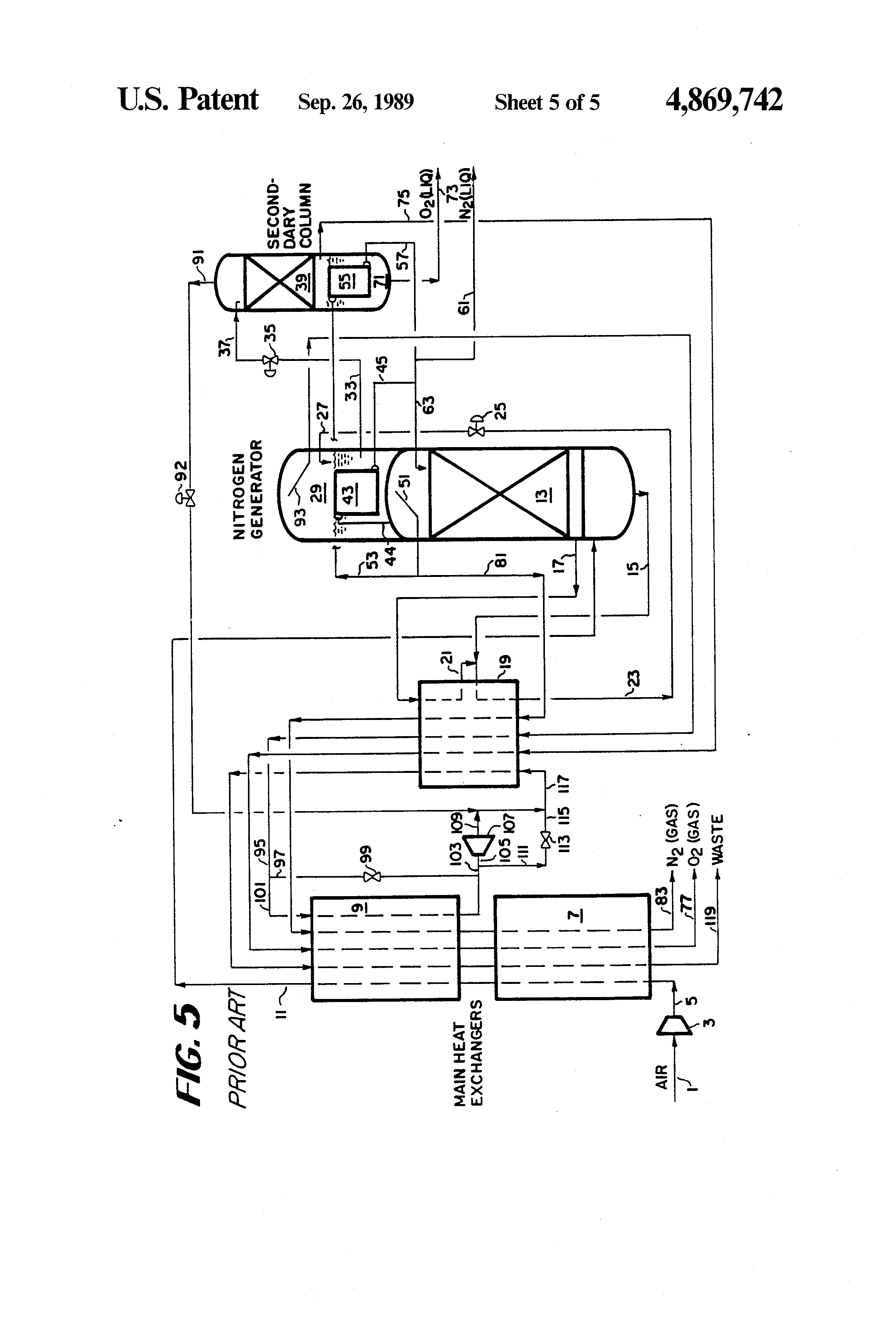 The present invention relates to a process for the separation of air into its constituent components by cryogenic distillation. Numerous process for the separation of air into its constituent components are known in the art, among these are the following: U.S. Pat. No. 3,210,951 discloses a fractionation cycle employing first and second fractionating zones operating under different pressures and including two reboiler/condensers. Both of the reboiler/condensers are interconnected with the stages of fractionation in such a manner as to effect the required reboil and reflux production with minimum pressure differential between the stages of rectification and also decreased the irreversibility of the overall fractionation process thereby obtaining the desired separation with the high pressure stage operating under substantially reduced pressure. U.S. Pat. No. 3,277,655 discloses an improvement to the fractionation process taught in U.S. Pat. No. 3,210,951. In this process, the heat exchange occurring in one of the two reboiler/condensers between the bottoms liquid from the lower pressure column and the gaseous material from the high pressure column results in complete vaporization of the liquid from the low pressure column thereby satisfying the reboiler requirements of the low pressure column. Additionally, when the liquefied gaseous material from the high pressure column is introduced into the lower pressure column it improves the reflux ratio in the upper portion of the low pressure column which increases the separation efficiency and makes it possible to lower the pressure of the gaseous mixture entering the cycle. U.S. Pat. No. 3,327,489 discloses another improvement to U.S. Pat. No. 3,210,951 to lower the pressure in the high pressure fractionator. In the process, the pressure reduction is obtained along with the associated power reduction by establishing a heat exchange between gaseous material, which may comprise the feed mixture, and a liquid component collecting in the bottom of the low pressure fractionator, with the liquid component being under different pressure. U.S. Pat. No. 3,754,406 discloses a process for the production of low purity oxygen, in which a low pressure stream of incoming air is cooled against outgoing gas streams and fed into a high pressure distillation column. A high pressure stream of incoming air is cooled against outgoing gas streams, partially condensed against boiling oxygen product in a product vaporizer, and separated into gas and liquid streams. The liquid stream being subcooled and expanded into a low pressure fractionating column. The gas stream is reheated and expanded to provide process refrigeration and is introduced into the low pressure fractionating column. Crude liquid oxygen from the bottom of the high pressure column is cooled and introduced into the low pressure column after being used to liquefy some of the nitrogen from the high pressure column in an external reboiler condenser. Liquid oxygen product from the low pressure column is pumped to a higher pressure before being passed to the subcooler and the product vaporizer. The remainder of the high pressure nitrogen is liquefied in a second external reboiler/condenser and is used as reflux for the two columns. A waste nitrogen stream is removed from the low pressure column. U.S. Pat. No. 4,222,756 discloses a process in which a two pressure distillation column is used in which both pressurized column sections are refluxed with a nitrogen-enriched stream. The low pressure column is fed by an oxygen-enriched stream from the high pressure column which is expanded to reduce its pressure and temperature. U.S. Pat. No. 4,453,957 discloses a cryogenic process to efficiently produce large quanties of nitrogen at elevated pressure by use of a double column and multiple condenser-reboilers. U.S. Pat. No. 4,464,188 discloses a process and apparatus for the separation of air by cryogenic distillation in a rectification column using two nitrogen recycle streams and a sidestream of the feed air stream to reboil the column. One of the nitrogen recycle streams is expanded to provide refrigeration and to provide power to compress the feed air sidestream. U.S. Pat. No. 4,617,036 discloses a process for the cryogenic distillation of air to recover nitrogen in large quantities and at relatively high pressure, wherein a portion of the nitrogen reflux for the distillation is achieved by heat exchanging nitrogen gas in a side reboiler against waste oxygen at reduced pressure. U.S. Pat. No. 4,702,757 discloses a process utilizing high and low pressure distillation columns for the production of an oxygen-enriched air product. Feed air is fed to the main heat exchangers at two pressures. The high pressure feed air from the main exchanger is used to supply refrigeration, by expanding a portion of the high pressure air prior to introducing that portion into an intermediate location in the low pressure column, and to vaporize the oxygen-enriched air product prior to using the stream as reflux for the high pressure column. The low pressure feed air from the main heat exchangers is partially condensed to supply reboiler duty to a low pressure column and is then fed to a high pressure column. The high pressure column condenser is used to reboil an intermediate liquid in the low pressure column. U.S. Pat. No. 4,704,147 discloses a process for the production of an oxygen-enriched air product, feed air is fed to the main heat exchangers at two pressures. The high pressure feed air from the main exchanger is partially condensed to vaporize the oxygen-enriched air product. This partially condensed feed air is separated with the vapor phase being warmed and expanded to supply refrigeration and subsequently being fed to the low pressure fractionation section, and the liquid phase being used to reflux both the high pressure and low pressure fractionation sections of a double distillation column. The low pressure feed air from 