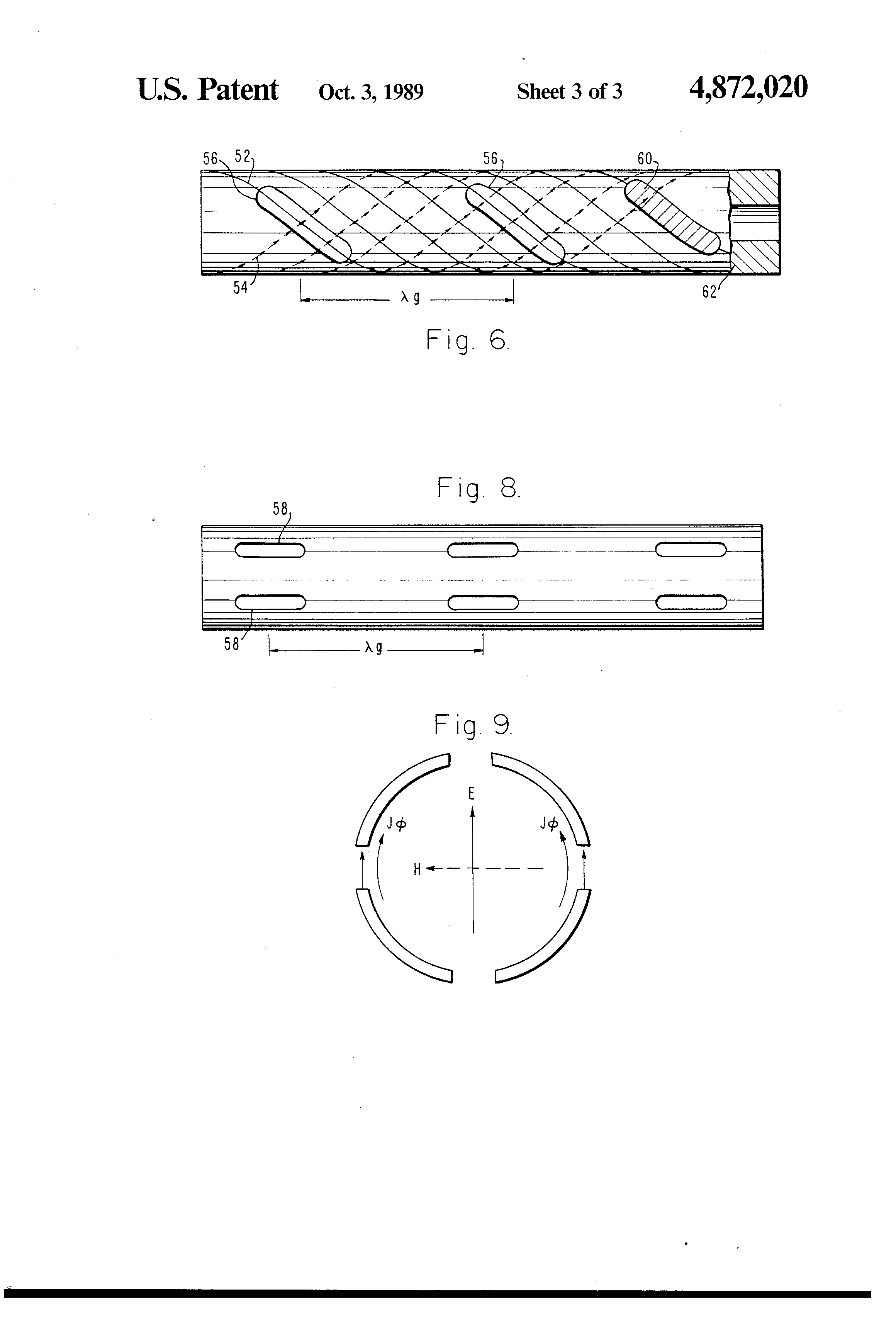 This is a division of application Ser. No. 07/006,533 filed Jan. 23, 1987, now U.S. Pat. No. 4,825,219. The invention relates generally to the field of antennas, and more particularly, to slotted waveguide antennas. A relatively large amount of research has been conducted on slotted, rectangular waveguide antennas and frequent reports have been made in the literature. For instance, see Johnson and Jasik, Antenna Engineering Handbook, 2ed., McGraw-Hill 1984, chapter 9, and S. Silver, Microwave Antenna Theory and Design, MIT Radiation Laboratory Series, pp. 287-301. Many of these antennas use probes to excite the slots. As is well known, probes have disadvantages including the potential for arcing at high power levels and difficulty in manufacture and assembly. There has also been a moderate amount of research and reporting on slotted coaxial waveguide antennas operating in the fundamental TEM mode and on circular waveguides operating in the TM01 mode. See S. Silver, MIT Radiation Laboratory Series, Vol. 12, Microwave Antenna Theory and Design pp. 305-309, 325, and 328 and in Johnson and Jasik, Antenna Engineering Handbook, 2ed., pp. 28-15. These designs have fixed linear polarization and do not have azimuthal pattern control. Also see Cornbleet, "The Helical Slot Antenna," IEE Third International conference on Antennas and Propagation, ICAP 1983, Part I. Prior coaxial line slot antennas typically operated in the TEM mode in coaxial line or in the TM01 mode in circular waveguide with the slots coupled by associated probes. The antenna had fixed transverse linear polarization. In these types of antennas, the slots are parallel to the longitudinal current flow lines of the TEM or TM01 modes, hence they would not radiate without probes that project into the waveguide. Very little has been reported about slotted circular waveguide antennas without probe excitation except for long continuous slots to form a "leaky wave antenna" as reported in J. N. Hines, V. H. Rumsey, and C. H. Walter, "Traveling-Wave Slot Antennas," Proc. IRE, Vol. 41, 1953, p. 1629, FIG. 11. Also see J. S. Ajioka and G. M. Coleman, U.S. Pat. No. 2,818,565. A very wide, continuous longitudinal slot was used in circular waveguide and operation occurred in the TM01 mode. Narrow longitudinal slots would not radiate because they were parallel to the current flow lines (TM modes have longitudinal currents only). Very wide slots, where the width was on the order of the radius of the waveguide or wider, perturbed the guided wave enough to cause leakage from the waveguide. All of the above-mentioned techniques have the disadvantage of fixed polarization transverse to the array. The discrete slot array technique has the further disadvantage of requiring the use of costly, high power limiting electric probes which are used to excite the slots. The continuous slot technique has the further disadvantage of radiation at neither broadside nor at endfire but at somewhere in between. The beam direction is generally determined by sin θ=λ/λg. Thus, it would be an advance in the art to provide an antenna which may radiate at relatively high power levels, which does not use coupling probes, which has controllable polarization, and which allows azimuthal pattern control. In view of the above, it would also represent an advance in the art to provide a slotted circular or coaxial waveguide antenna having controllable polarization and azimuthal pattern control. It is an object of the invention to provide a new and improved slotted, circular or coaxial waveguide antenna. It is also an object of the invention to provide a circular or coaxial slotted waveguide antenna having controllable azimuthal patterns. It is also an object of the invention to provide a slotted, circular or coaxial antenna that takes advantage of helical current flow lines for circumferential TE modes with circumferential variation greater than zero. It is also an object of the invention to provide a slotted, circular or coaxial antenna which can provide beams from broadside to endfire with arbitrary or controllable polarization. These and other objects and advantages are attained by the invention wherein there is provided a circular or coaxial waveguide having a slot shaped such that it interrupts the current flow lines of either the right hand or left hand circulating mode (RC and LC respectively) residing in the waveguide, and having a control means to control the relative magnitude and phase between the two circulating waves. By this technique, arbitrary polarization may be radiated. In one embodiment, the control means includes an ortho-polrization mode transducer and a quarter wave plate, circular polarizer feeding the slotted waveguide. The slots formed in the waveguide to interrupt the RC and the LC are not necessarily perpendicular to one another but are independently positioned so that any polarization can be generated by a particular combination. The slots have nominal λg spacing for broadside radiation. By dielectrically loading the waveguide to make λg in the loaded waveguide equal to λ-free space, endfire radiation can be achieved. The positions of the slots in the waveguide wall are selected in accordance with the theory that for TE modes in circular waveguide with circumferential variation of e±jmφ, purely helical current flow lines exist in the walls of the waveguide. The slots are located so as to interrupt these current flow lines of the desired mode so that radiation of that mode will occur. By forming a plurality of slots which are disposed at predetermined distances from one another in the waveguide, both the LC and RC modes may be interrupted and so radiate together. By controlling the relative amplitude and phase between the two circulating modes, the azimuthal pattern can be rotated and so moderately changed in directivity. For a more detailed description of the invention, reference is now made to the following description of the preferred embodimen