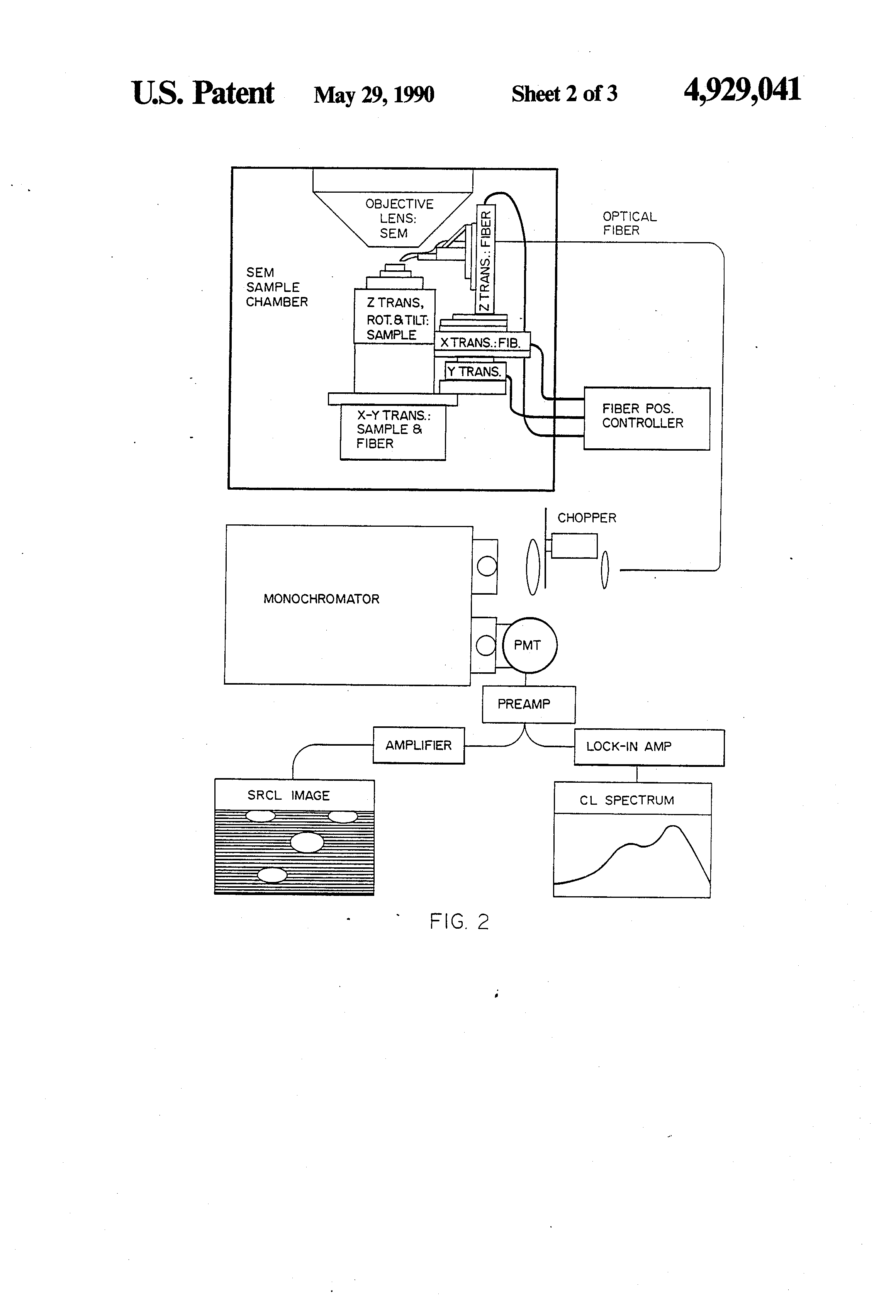 1. An improved cathodoluminescence light collection system for use in scanning electron microscopes of the type using a scanning electron beam directed through an objective lens into a sample chamber and onto a sample within the chamber; the improvement comprising: an optical fiber having a light entry aperture positioned between said sample and said objective lens for collecting at least a portion of the cathodoluminescence light emitted by said sample in response to said electron beam; and means for precisely controlling the position of said aperture relative to said sample from a location outside said chamber. 2. The improvement recited in claim 1 wherein said fiber is contained within a protective sheath along at least a portion thereof. 3. The improvement recited in claim 1 wherein said position controlling means comprises three mutually orthogonal translators within said chamber and a remote control associated with each such translator and located outside of said chamber. 4. The improvement recited in claim 1 wherein said fiber is positioned within said chamber to preclude interference with said electron beam. 5. The improvement recited in claim 1 wherein said fiber is connected to means for generating a spectrally resolved image of the cathodoluminescence light collected. 6. The improvement recited in claim 1 wherein said fiber is connected to means for generating a spectral graph of the cathodoluminescence light collected. 7. The improvement recited in claim 1 wherein said fiber has a core diameter of 200 micrometers and a numerical aperture of 0.2. 8. The improvement recited in claim 1 wherein said aperture is positioned about 0.5 millimeters from said sample. 9. The improvement recited in claim 2 wherein said protective sheath comprises about 0.01 inch wall thickness stainless steel tubing having about a 1/16 inch diameter. 10. The improvement recited in claim 1 wherein the distance between said sample and said objective lens is about 9 millimeters. 11. An improved cathodoluminescence light collection system for use in electron microscope for collecting light emitted by a sample in response to incident electrical energy within a chamber; the improvement comprising: an optical fiber having a light entry aperture positioned adjacent the sample; and means for precisely controlling the position of said aperture relative to said sample from a location outside said chamber. 12. The improvement recited in claim 11 wherein said fiber is contained within a protective sheath along at least a portion thereof. 13. The improvement recited in claim 11 wherein said position controlling means comprises three mutually orthogonal translators within said chamber and a remote control associated with each such translator and located outside of said chamber. 14. The improvement recited in claim 11 wherein said fiber is positioned within said chamber to preclude interference with said electron beam. 15. The improvement recited in claim 11 wherein said fiber is connected to means for generating a spectrally resolved image of the cathodoluminescence light collected. 16. The improvement recited in claim 11 wherein said fiber is connected to means for generating a spectral graph of the cathodoluminescence light collected. 17. The improvement recited in claim 11 wherein said fiber has a core diameter of 200 micrometers and a numerical aperture of 0.2. 18. The improvement recited in claim 11 wherein said aperture is positioned about 0.5 millimeters from said sample. 19. The improvement recited in claim 12 wherein said protective sheath comprises about 0.01 inch wall thickness stainless steel tubing having about a 1/16 inch diameter.