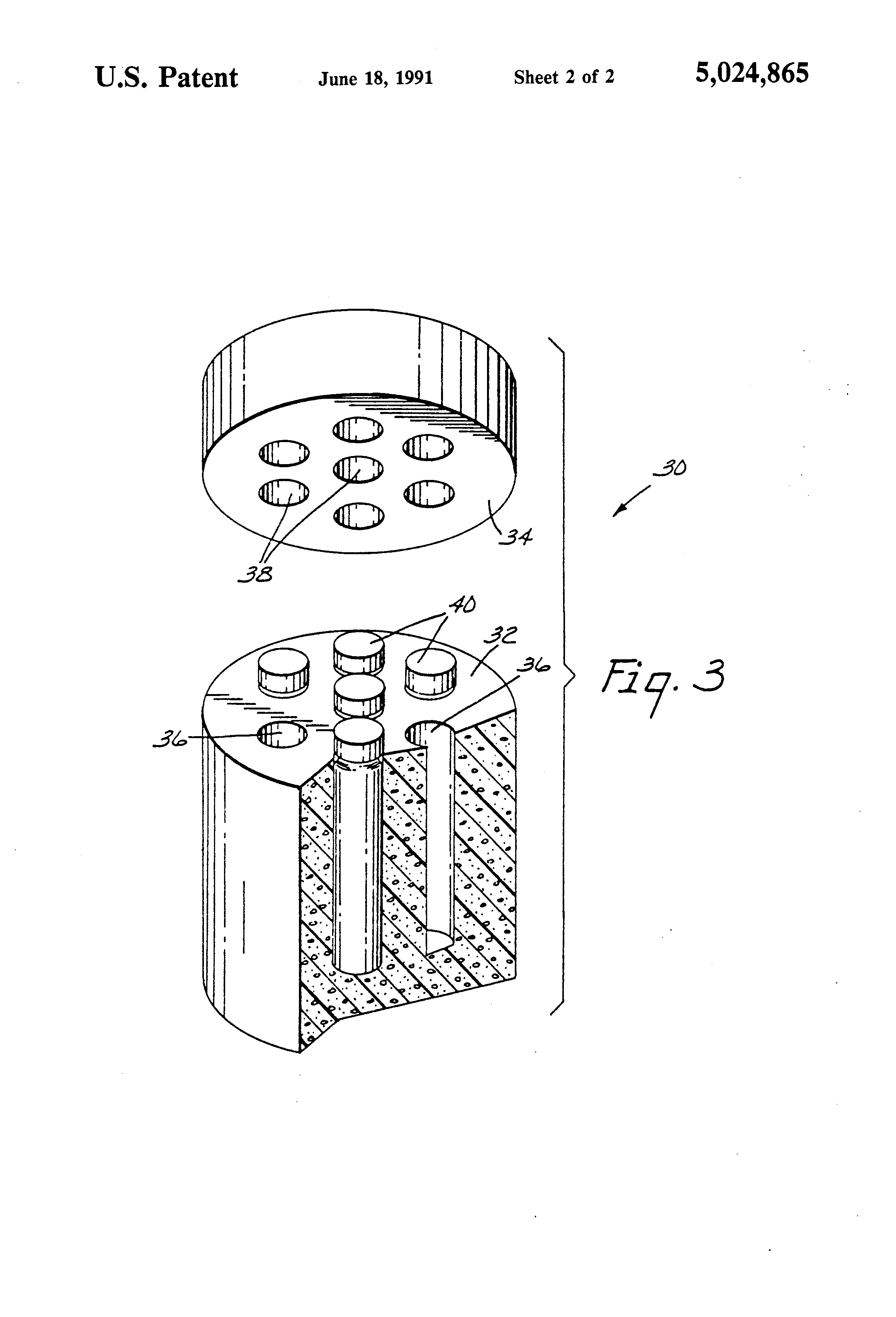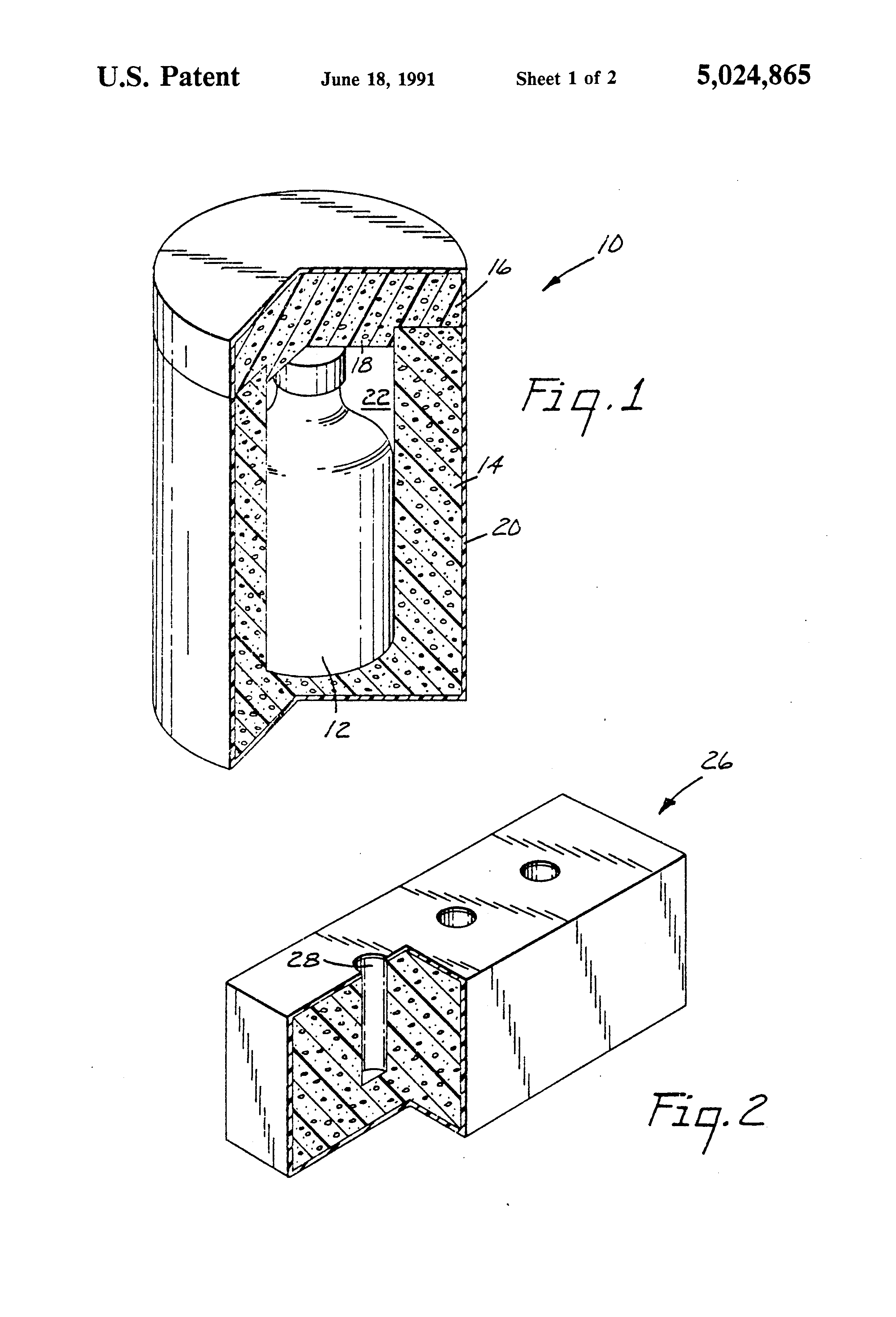 This is a continuation of application Ser No. 07/335,202 filed Apr. 7, 1989 . 1. Field of the Invention The present invention relates to a container which is useful for shipping and storing hazardous fluid materials. 2. Background Information The shipment of hazardous fluid materials requires the use of a shipping container or package which will protect the vessel holding the material from shock which can cause breakage as well as provide for containment or control of the fluid material should the vessel be broken. The shock protection and containment requirements are generally incompatible in that materials which provide good shock protection typically exhibit poor fluid containment or absorption properties and materials having good fluid containment or absorption properties exhibit poor shock protection properties. Hazardous fluid material shipping containers which offer both shock and containment protection which have evolved are a combination of a more rigid container which provides shock protection that is filled with an absorbent material. This combined structure results in a shipping package that is very large relative to the volume of hazardous material being shipped in the package. Simon U.S Pat. No. 4,560,069 discloses a package assembly for transporting hazardous materials including a bottle containing the hazardous material disposed within a metal can wherein the bottle is surrounded on all sides by individual upper, lower and side absorbent non-resilient and frangible synthetic foam elements. The foam elements provide cushioning for the bottle and absorbency in the case of spillage. The individual foam elements are maintained out of contact with each other by means of a fiberboard spacers. The spacers are disposed to separate the upper and lower ends of the bottle from the resin foam and to protect the frangible foam from disintegration due to abrasion by the bottle. The metal can can be suspended within an outer corrugated fiberboard box by means of a fiberboard insert element for the outer box. The fiberboard insert element supports the can out of contact with the outer fiberboard box and provides a protecting buffer zone between the can and the walls of the outer fiberboard box for protection of the can. Haigh et al. U.S Pat. No. 3,999,653 discloses a package containing a hazardous liquid which comprises a container which is generally impermeable to a hazardous liquid contained therein, the container being subject to discharge of its contents when subjected to impact. The container is disposed within a first jacket of a liquid permeable material of sufficient strength to contain fragments of the container on rupture thereof. A second jacket is provided over the first jacket, the second jacket having at least an inner wall and outer wall, the inner wall being liquid permeable, a hazardous liquid swellable body contained between the inner wall and outer wall and being generally co-extensive with the inner wall and outer wall, and a third jacket of hazardous liquid vapor imperious membrane. Kreutz et al. U.S. Pat. No. 4,213,528 discloses a package for an acid container, such as an acid containing ampule or bottle, formed of an acid resistant envelope and a separate removable absorbent shield for enclosing the acid container, with the absorbent shield including a material to neutralize acid whereby any acid released from the container is absorbed and neutralized by the absorbent shield. The absorbent shield is generally porous, yet sufficiently absorbent to allow essentially instantaneous absorption of acidic liquids of high, medium and low viscosities. Simon et al. U.S. Patent No. Re 24,767 discloses a packaging container that provides uniform thermal, shock, impact, vibration, inertia and fluid impervious insulation for a fragile or delicate object or material. The object or material is completely encased in a yielding, flexible and resilient cellular or foamaceous sheath of selected thickness that is effective as a protection against shock, impact, vibration, inertia effects, etc. as well as being a good thermal insulating blanket, the sheath cradling and supporting the object or material, and a fluid-tight or impervious shell to protect the object or material against deterioration by temperature changes or moisture. Slaughter U.S. Pat. No. 2,929,425 discloses a protective pouch comprising an elongated cushioning strip having a series of pockets into which parts to be packaged may be inserted. The pouch is so constructed that one or more of the longitudinal edges of the cushioning strip may be folded over the pockets to cover them, and then the pouch is either rolled up or folded up for insertion into a shipping container such as a metal can, a wooden box or a carton. Crane et al. U.S. Pat. No. 2,941,708 discloses a molded pulp set-up insulating container in which six integrally joined sections have rims disposed thereon to give locking contact where free section edges meet. The container is molded so as to have the minimum amount of pulp in direct contact with the goods held in the container to minimize heat transfer through the pulp. The container has sufficient rigidity to support the goods within the container and to also entrap a blanket of insulating air around the goods. Heffler et al U.S. Pat. No. 3,309,893 discloses an insulated shipping container which has an elongated body, quadrilateral in cross section, formed of a rigid, inflexible polyurethane foam, having a heat-conductivity factor in the range of 0.11 to 0.20 and integrally provided with a cavity of circular cross section opening at one end of the body and being closed at its other end and a closure for the cavity being of cylindrical form and having a diameter greater than that of the cavity and formed of resilient, flexible, and porous polyurethane foam for sealing engagement within the open end of the cavity for forming a tight joint with the walls thereof while permitting the escape of gases from withi