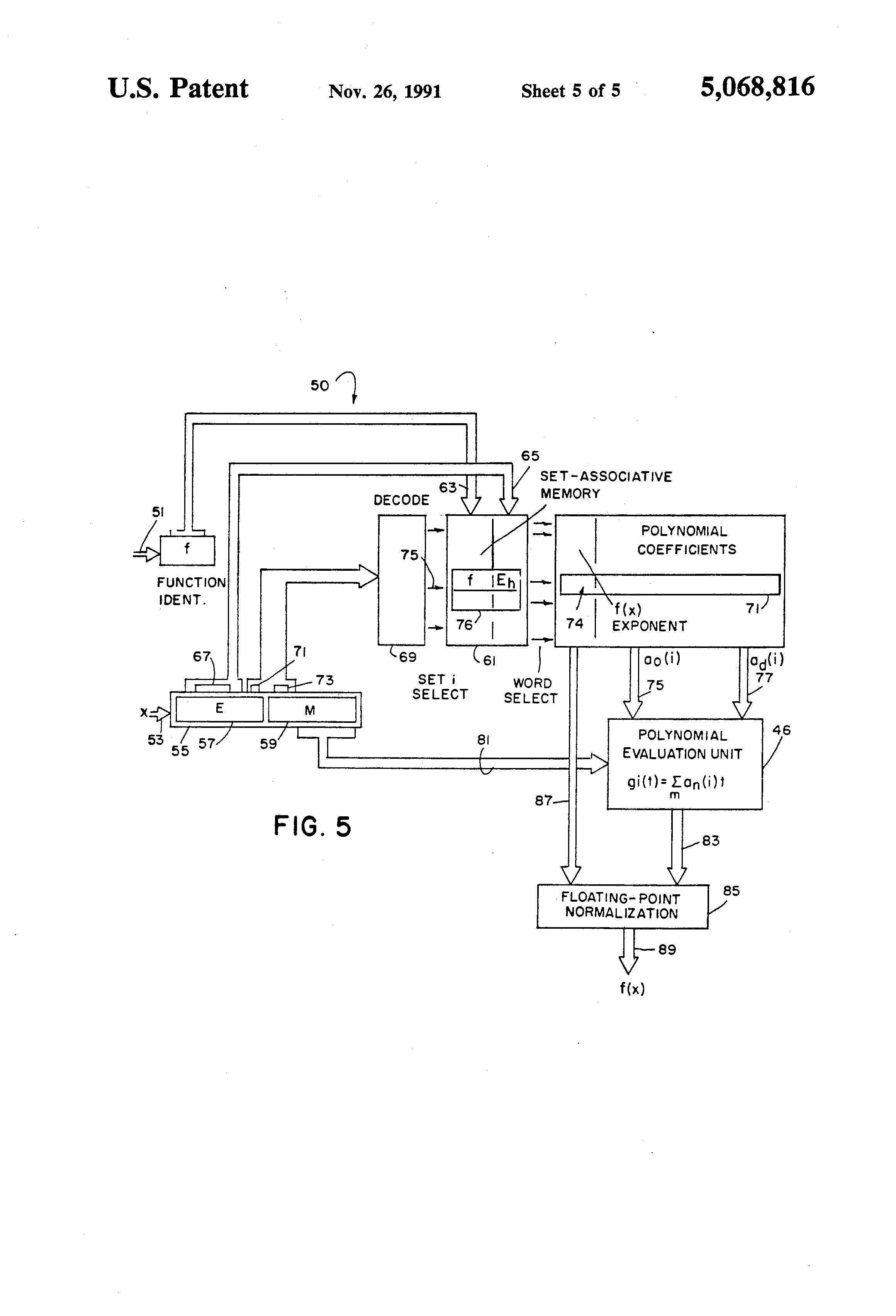 Several computer applications--digital signal processing in particular--require the repeated evaluation of a few specific functions. Usually, function values are obtained by computing the terms of a series to the required degree of precision. But this may be unacceptably slow, especially when there are real-time constraints. Alternative solutions are either table-lookups or special-purpose arithmetic units. But the table-lookup approach is useful only for limited-precision applications, since the table size grows exponentially with the argument precision, and special-purpose hardware designed for each required function may be expensive and inflexible. A number of previous works have reported on the design of special-purpose hardware for the evaluation of particular functions. The base-two logarithm and exponential have been the functions most considered, because of the usefulness of the logarithmic transformation in multiplication, division, and exponentiation. The work of Mitchell is a fundamental exposition of the idea of implementing the log function in hardware. Any positive number y can be written in the form y=2k x, where k is an integer and x is between one and two. Mitchell proposes using the straight line x-1 as an approximation to log2 x for 1≦x≦2. But the straight-line approximation has a maximum absolute error of 0.086 in the interval. This can lead to an error of 11.1 percent for multiplication implemented by logarithms. Combet et al. propose using several straight-line segments for the approximation of log2 x. The coefficients of the linear segments are selected for efficient implementation in hardware as well as reduction of the maximum error. The study results in a hardware design that uses four segments, reducing the maximum error to 0.008. Hall, Lynch, and Dwyer also propose the piecewise linear approximation to the logarithm, as well as to the exponential. Their analysis is based on the minimization of the squared error. Numerical results are shown for approximations by up to eight segments. The maximum error of the least-squares linear approximation to log2 x is shown to be 0.065 for one segment, and 0.0062 for four segments (compare to the cases above). For eight segments, the error is 0.00167 - approximately a fourfold reduction over the four-segment case. The use of the log-exp transformation is shown for a digital filter, requiring 6-bit precision. A work by Marino considers the use of two second-degree polynomial segments to approximate log2 x. The computation of x2 is approximated in order to reduce it to adding and shifting operations. A maximum absolute error of 0.0040 is achieved for log2 x. Brubaker and Becker analyze the evaluation of logarithms and exponentials by ROM table-lookup without interpolation. They consider multiplication by direct table-lookup and by the addition of logarithms. Their highest precision example is a multiplication with an error of 0.1 percent, in which the operands are 11 bits and the product 10 bits. In this case, the memory required for multiplication via logarithms is smaller by a factor of 50 than that required for direct table-lookup. Several studies have shown the effectiveness of the logarithm form of number representation, both for fast and significant computation, and for efficient use of storage. But the practical usefulness of logarithmic representation schemes depends critically on efficient conversions through the logarithm and exponential functions. A recent work by Lo and Aoki shows how these functions can be evaluated quickly through the use of a programmable logic array (PLA). Their scheme is to use the single-segment linear approximation for log2 x for 1≦x≦2, but then to add error-correcting values obtained from a PLA. The error corrections, truncated to the precision required of the result, are found to be constant in intervals of x. Economy in the required PLA size is obtained by encoding it to provide corrections for each group of x values. The speed of this technique is significant: the result is obtained after only two logic levels in the PLA, followed by one addition. The same authors have also demonstrated iterative techniques for the evaluation of the logarithm. These methods are implemented with a smaller hardware investment, but are correspondingly slower. This invention provides a function evaluator which uses an interpolating memory for evaluating functions. An argument is expressed in digital bits. High order bits are used to address a memory for selecting coefficients. Low order bits are used in combinational logic to supply powers which multiply the coefficients. An adder sums the products of the multipliers, and the summation is the function evaluation. Floating point arguments with exponents and mantissas in digital form are used with the system. Low order bits of the exponent or high order bits of the mantissa or both are supplied to the decoder of a set-associative memory to select a set. An associative search is made by a function representation and high order bits of the exponent. A memory word selected in the search contains an exponent and coefficients. The coefficients are supplied to an evaluator which is similar to that previously described, and the summation from that evaluator and the exponent are supplied to a normalizer. The output of the normalizer is the function evaluation. The invention is an interpolating memory, a digital electronic device, capable of quickly evaluating mathematical functions. In its operation, it evaluates a selected polynomial approximation to the desired function. The hardware consists of: a) A memory bank containing the coefficients of the approximating polynomials, which is addressed by k bits of the argument x; b) Combinational logic for computing the values t2, t3, . . . , td given the variable t; c) A set of parallel multipliers for computing the terms of the polynomial; and d) An adder to sum the terms of the polynomial. A second embodiment acc