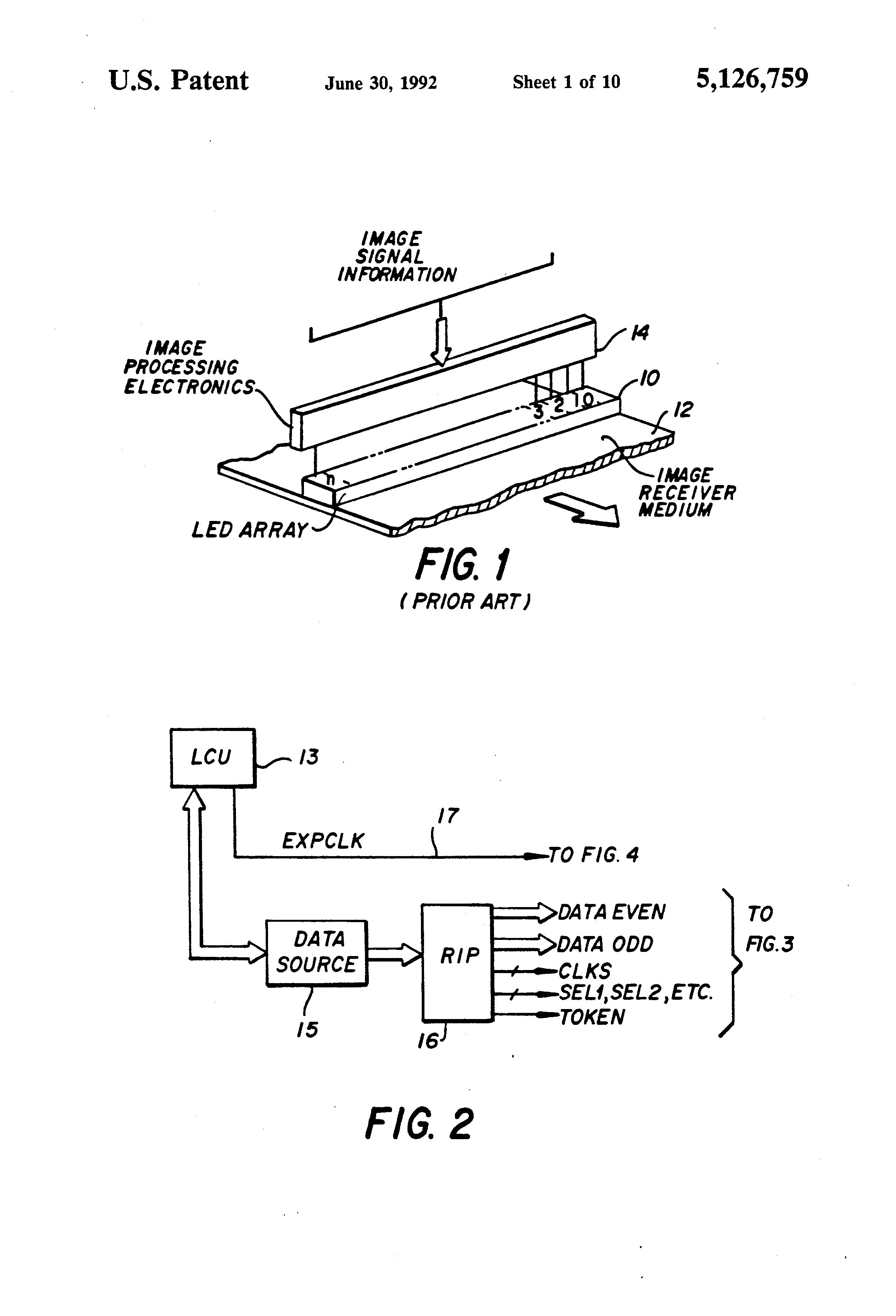 1. A non-impact printer apparatus comprising: a recording head having a plurality of recording elements for recording on a recording medium; driving means for selectively driving said plurality of recording elements in accordance with respective image data signals; data bus means for carrying multibit image data signals and for carrying on one line that is also used for carrying image data signals, a multibit digital signal used for regulating current; said driving means including a plurality of data register means with respective data register means being associated with each recording element for storing said image data signals; means for commonly connecting said data bus means to said plurality of data register means; means for generating a token bit signal; a multistage shift register means for outputting sequentially at respective stages the token bit signal for sequentially selecting a respective data register means for accepting image data signals; said driving means further including current regulating means for regulating a level of electrical current to each recording element, the current regulating means including means for adjusting a level of electrical current to each recording element in response to the multibit digital signal used for regulating current, and wherein the current regulating means further includes first register means including a plurality of registers for storing a multibit digital signal related to a level of current control, second register means for storing and shifting a token bit signal and means responsive to a token bit signal in said second register means for latching in an appropriate register of said first register means a digital signal found on said data bus means. 2. The printer apparatus of claim 1 and wherein the driving means is incorporated within an integrated circuit driver chip, and wherein at least two of such driver chips are provided on the printer apparatus and further wherein a token bit line couples said at least two driver chips to each other so that respective token bit signals latch, in appropriate registers of said driver chips, digital signals related to current control. 3. The apparatus of claim 1 and wherein said data bus means includes a plurality of independent data lines, each carrying image data signals. 4. The apparatus of claim 3 and wherein said driving means includes means responsive to signals in said respective data register means for driving a respective recording element for a time period related to said signals in said respective data register means. 5. The apparatus of claim 4 and wherein the recording elements are light-emitting diodes. 6. A non-impact printer apparatus comprising: a recording head having a plurality of recording elements for recording on a recording medium; driving means for selectively driving said plurality of recording elements in accordance with respective image data signals, said driving means including a plurality of data register means with respective data register means associated with each recording element for storing said image data signals; data bus means for carrying image data signals; means for commonly connecting said data bus means to said plurality of data register means; means for generating a token but signal; a multistage shift register means for outputting sequentially at respective stages the token bit signal for sequentially selecting a respective data register means for accepting image data signals; said driving means further including current regulating means for regulating a level of electrical current to each recording element, the current regulating means including means for adjusting a level of electrical current to each recording element in response to a multibit digital signal; and wherein the current regulating means further includes first register means including a plurality of registers for storing digital signals related to a level of current control, second register means for storing and shifting a token bit signal, and means responsive to a token bit signal in said second register means for latching in an appropriate register of said first register means a bit of the multibit digital signal. 7. The apparatus of claim 6 and wherein said data bus means comprises a plurality of independent data lines each carrying image data signals and said multibit digital signal for current regulation is carried on at least one of said data lines. 8. The apparatus of claim 6 or 7 and wherein said driving means includes means responsive to the signals in said respective data register means for driving a respective recording element for a time period related to said signals in said respective data register means. 9. The apparatus of claim 8 and wherein the recording elements are light-emitting diodes. 10. A non-impact printer apparatus comprising: a recording head having a plurality of recording elements for recording on a recording medium; driving means for selectively driving said plurality of recording elements in accordance with respective image data signals; image data bus means for carrying image data signals related to an exposure duration; said driving means including respective data register means associated with each other recording element for storing said image data signals; means for connecting said data bus means to said data register means; said driving means further including current regulating means for regulating a level of electrical current to each recording element the current regulating means including means for regulating a level of electrical current to each recording element in response to a multibit digital signal; and means for generating, on the image data bus means, the multibit digital signal used for regulating current; and wherein the current regulating means further includes first register means including a plurality of registers for storing a multibit digital signal related to a level of current control, second register means for storing an