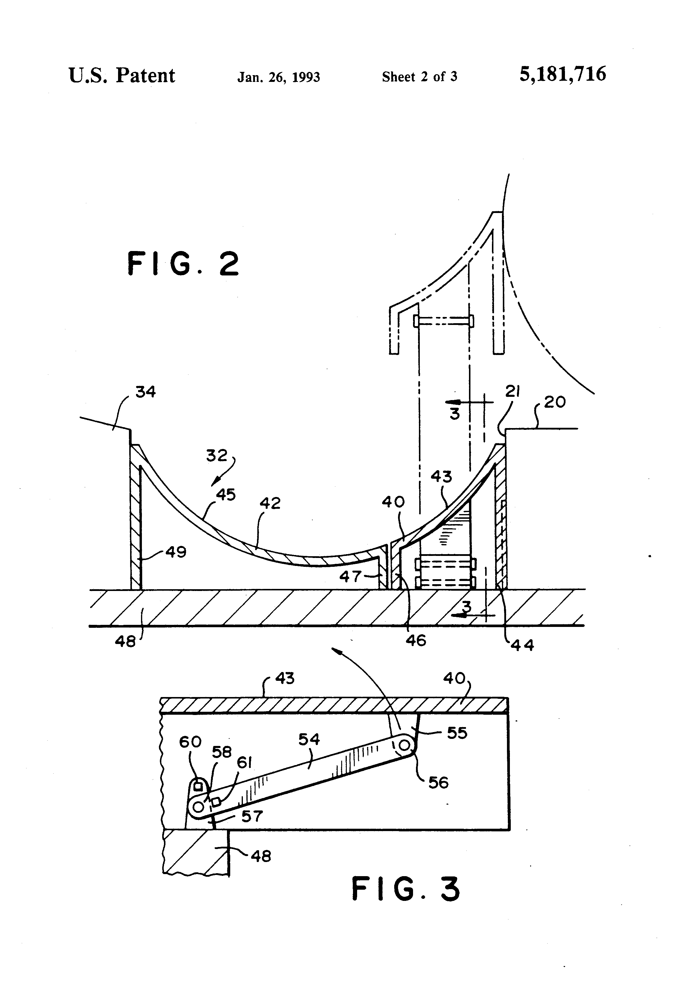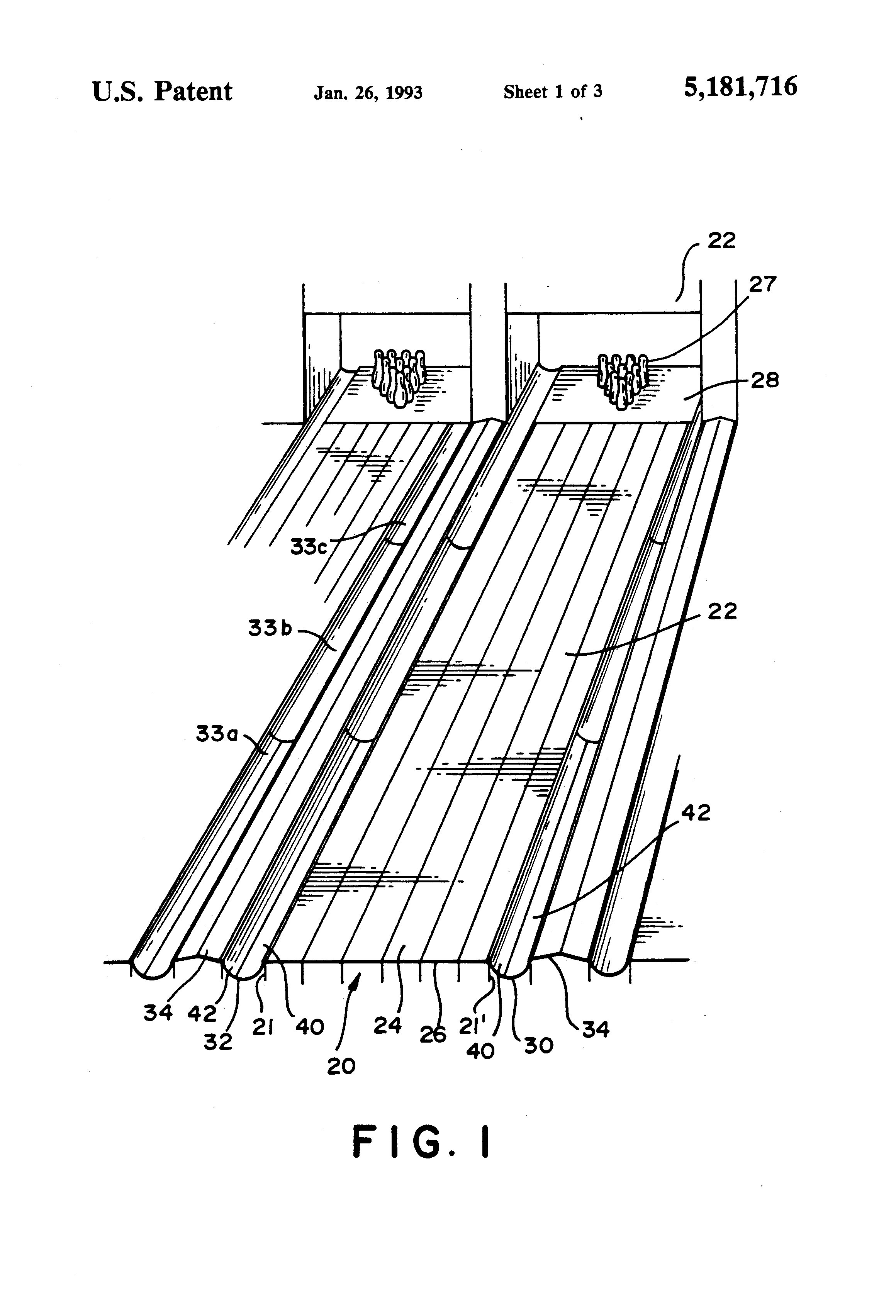 The second longitudinally extending portion 42 also defines an arc-shaped concave surface 45 which, in the preferred embodiment, forms the outer two-thirds of gutter 32. The portion 45 also includes a pair of downwardly extending parallel projections 47, 49. The projections 47, 49 are fixed to the cross member 48 in a customary manner with a first of the projections 47 adjacent to and perhaps abutting projection 46. The second projection 49 is adjacent to and abutting capping member 34 which separates a pair of alleys.