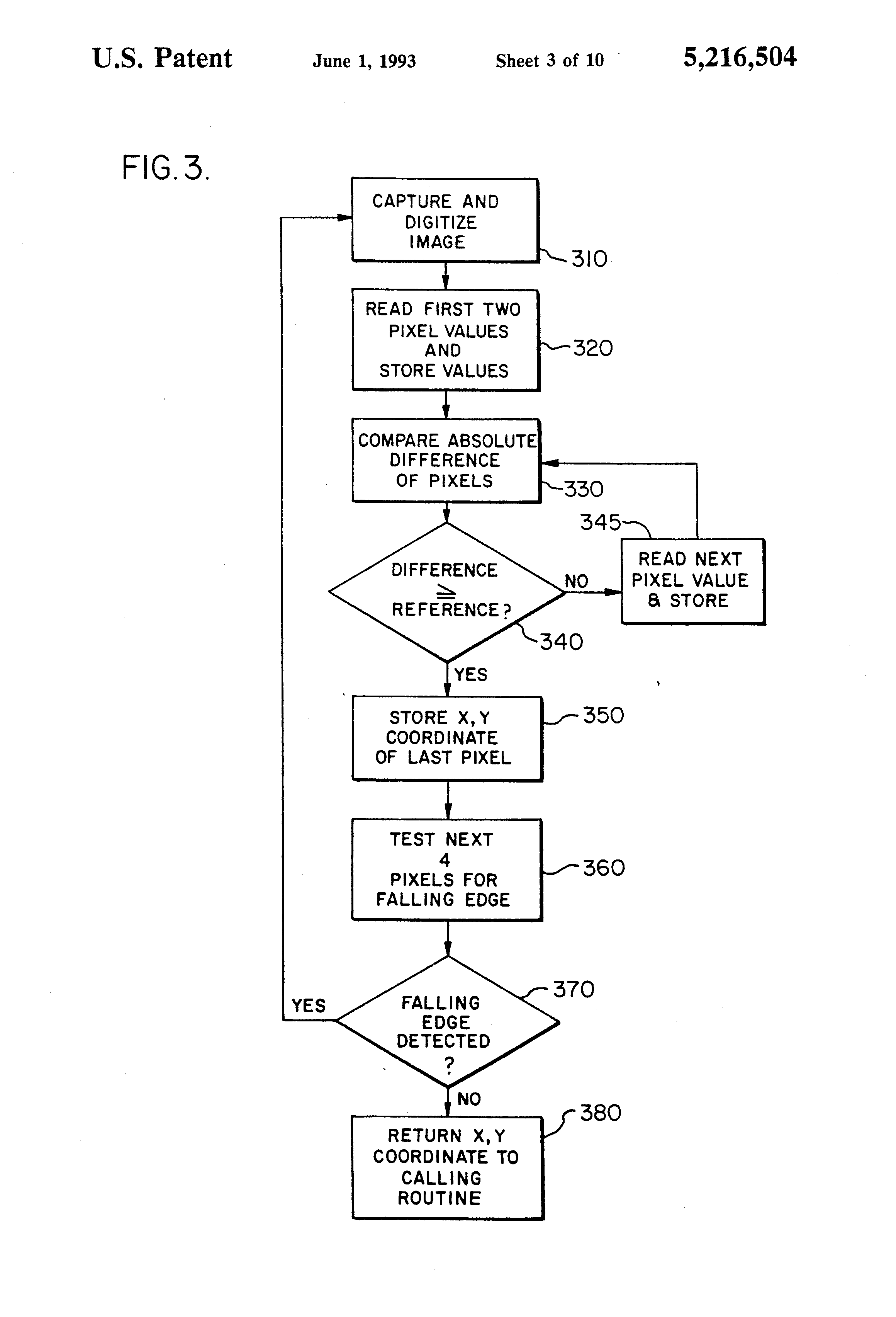 Next, at step 360, filtering for noise is applied to the possible edge. The next four pixels along the present axis and in the present measurement direction are measured to determine whether a falling edge, i.e., a pixel having a less-than-reference value, is detected. If, at step 370, a falling edge is detected, then the determination is discarded and a new capture and measure cycle is initiated, at step 310. Otherwise, if no new edge is detected, then, at step 380, the original edge is determined to be valid, and the x,y coordinates thereof are returned as stored in step 350.