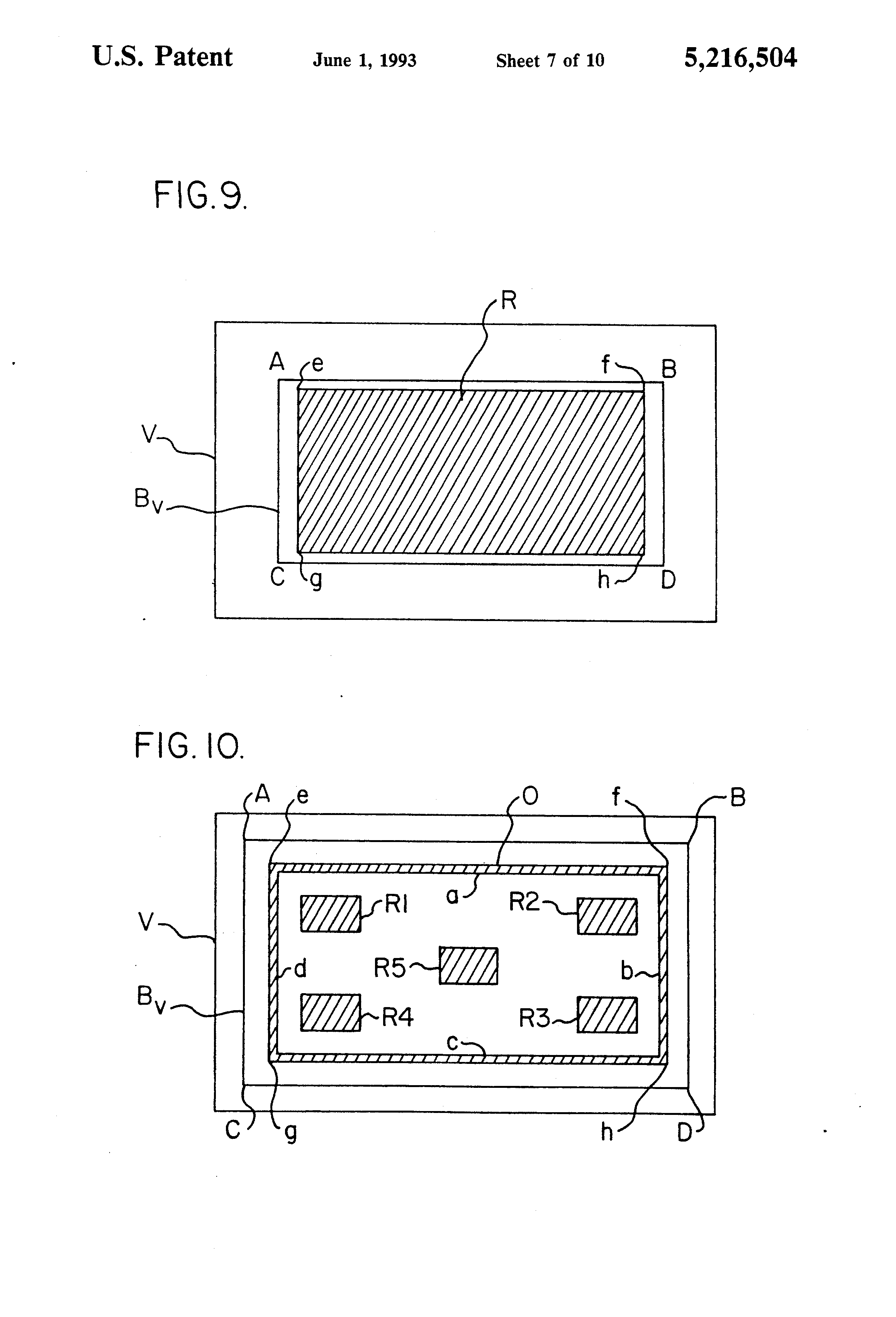 Because the pattern displayed on the monitor CRT 101 can appear within a wide range of locations (in an unadjusted monitor) inside the confines of the virtual bezel Bv, the calibration computer 104 attempts to identify boxes and lines within the video array V of the captured image displayed on the monitor, wherever, on the CRT 101, they occur.
