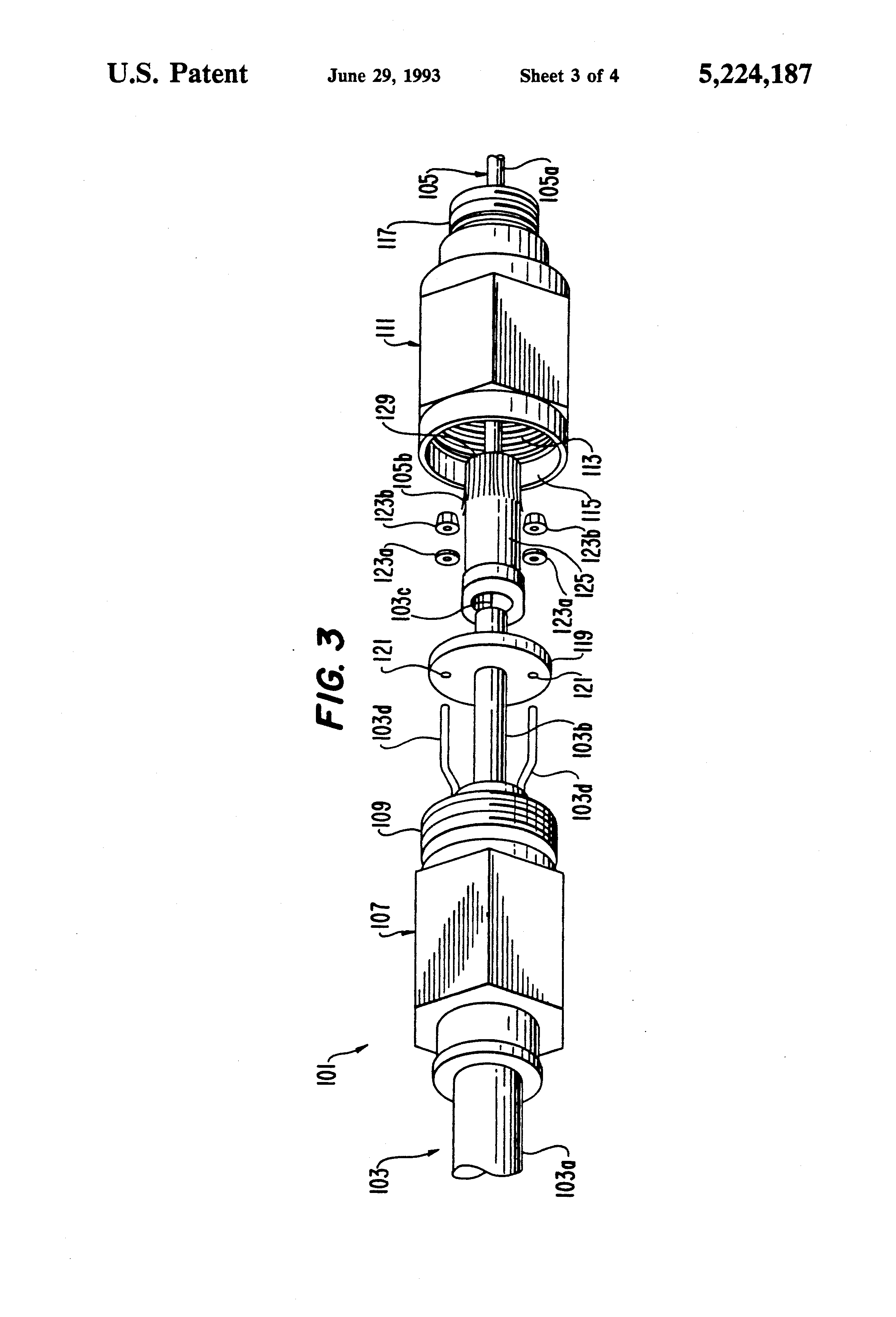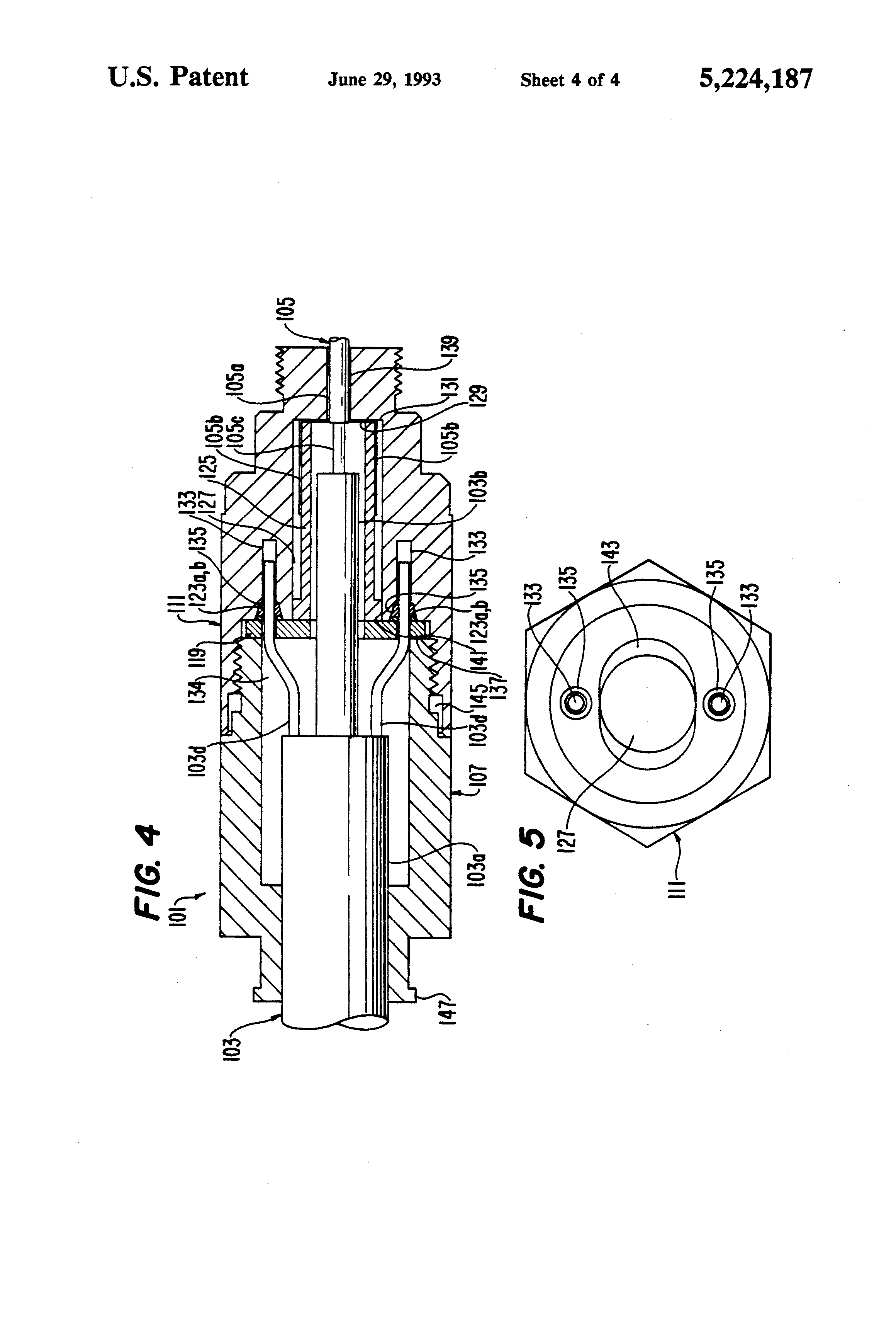 This invention relates to fiber optic cable connectors for coupling a fiber optic cable to related equipment and strain relieving the optical fibers of the cable. More specifically, the invention relates to connectors particularly suited for securing a fiber optic cable to a conventional CATV equipment housing and passing in a strained relieved condition the optical fibers of the cable into the housing for connection to electro-optical componentry. The use of optical fibers for transmission of CATV signals has numerous advantages over conventional radio frequency (RF) signal transmission through coaxial cable. For example, optical fibers intrinsically have more information carrying capacity than do coaxial cables. In addition, there is less signal attenuation in optical fibers than in coaxial cables adapted for carrying RF signals. Consequently, optical fibers can span much longer distances between signal amplifiers than is possible with coaxial cables. Further, the dielectric nature of optical fiber eliminates any problem with electrical shorting. Finally, optical fiber is immune to ambient electromagnetic interference (EMI) and generates no EMI of its own. Accordingly, fiber optic technology is, more and more, replacing RF technology in the CATV industry. Conversion to fiber optic technology in the CATV industry is hampered by the significant expense involved with replacing existing RF signal transmission equipment, e.g., coaxial cables, amplifiers and splitters, with fiber optic cables and equipment. As the industry converts to optical fiber technology, it is desirable to utilize existing RF signal equipment to the greatest extent possible to reduce costs. Accordingly, the industry trend is to utilize optical fiber cable for transmitting CATV signals from a centrally located station (headend) over large distances to a number of sub-stations (remote hubs) which may, e.g., be located in various cities. At the remote hubs, the optical signals are reconverted back into RF signals, amplified and split off to relatively short coaxial feeder lines, typically using an optoelectronic bridger amplifier (OEBA). This way, the advantages of optical fiber signal transmission are realized without the expense of replacing the vast networks of coaxial cable and related equipment which bring the CATV signal to individual receiving locations, e.g., residences. In interest of efficiency, it is desirable to adapt existing CATV equipment housings, e.g., junction boxes, trunk housings and the like, for housing and protecting fiber optic componentry (e.g., OEBA's, amplifiers, splitters, etc.) to which the optic fibers are fed. In such arrangements, it is necessary to secure the end of the fiber optic cable to the equipment housing in such a manner that one or more optical fibers of the cable can pass into the housing and be connected to components therein in a strain-relieved condition. Conventionally, this has been achieved by clamping a strength member of the cable, e.g., Kevlar strands or metal wires, to a floor of the housing such that forces imparted to the cable, e.g., due to the weight of the cable and thermal expansions and contractions thereof, are conveyed to the housing rather than the fragile optical fibers. A problem with this approach for providing strain-relief is that space within the housing must be utilized for securing the cable. Hence, the amount of space available for electro-optical componentry is reduced. Hopper U.S. Pat. No. 5,074,636 describes a fiber optic cable entry connector which, by securing the cable within the connector exterior of a trunk housing, addresses the above-described problem. This connector is threadably securable in an aperture of the trunk housing and provides strain-relief by grasping a strength member of the fiber optic cable with a screw-actuated clamp positioned within the connector body. The following patents describe other fiber optic cable connectors which capture a strength member of the fiber optic cable in order to provide strain-relief: Corke et al. U.S. Pat. No. 4,948,222; Betzler et al. U.S. Pat. No. 4,815,810; Honma et al. U.S. Pat. No. 4,815,808; Kashimura et al. U.S. Pat. No. 4,730,890; Ejiri et al. U.S. Pat. No. 4,708,427; Ohta et al. U.S. Pat. No. 4,576,437; Borsuk U.S. Pat. No. 4,447,120; and Lumpp et al. U.S. Pat. No. 4,247,163. Due possibly to such factors as incompatibility with existing CATV equipment, expense, difficulty of installation, size and insufficient strain-relieving strength, the connector designs disclosed in the above patents have not achieved widespread acceptance and usage in the CATV industry. Rather, the industry has continued to rely primarily upon the above-described method of providing strain-relief by securing the fiber optic cable to the floor of the equipment housing, with its attendant disadvantage of taking up space within the housing. There thus exists a need for a fiber optic cable connector which can reliably secure a fiber optic cable to a conventional CATV equipment housing and thereby strain-relieve the optical fibers without taking up housing space, which is inexpensive to manufacture, compact, and can be easily installed. Conventionally, the individual optical fibers of the cable extending from the connector into the equipment housing for connection to an OEBA or other components are enclosed by a protective "fan-out" tube. Such a tube typically comprises an outer polymeric skin, Kevlar strands acting as a strength member and an inner plastic core for housing and cushioning the individual fibers. None of the above patents addresses the need to strain-relieve the optical fibers from tensile forces imparted to such protective tubing. Conventional practice has been to secure the fan-out tubing to the housing by clamping it to an inner wall portion thereof. This approach also undesirably takes up space within the housing. There is therefore a need for a connector which provides complete strain-relief to the opti