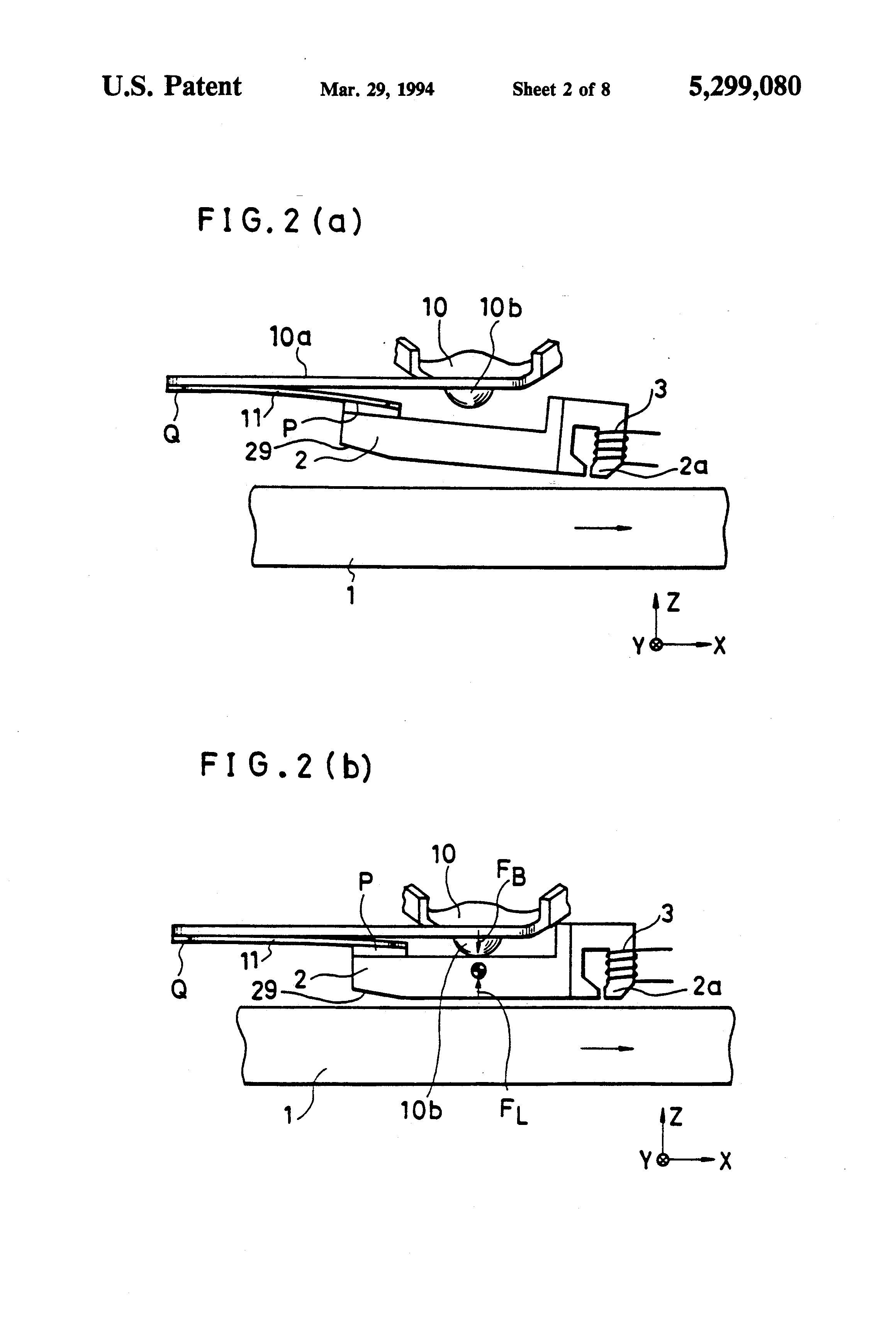 A slider connected to a floating head assembly having a magnetic head at a tail or air flow-out end is controlled by a load beam at a position of air flow-in end via a gimbal. When the slider is brought close to a disk-shaped revolving recording medium, its posture is such that the gap at the flow-in end is wider than that at the flow-out end. An air film is rapidly formed starting from the flow-out end to provide stability and cushioning effects between the slider and the disk-shaped revolving recording medium. As a result, a soft landing due to the laminar air flow is automatically achieved.