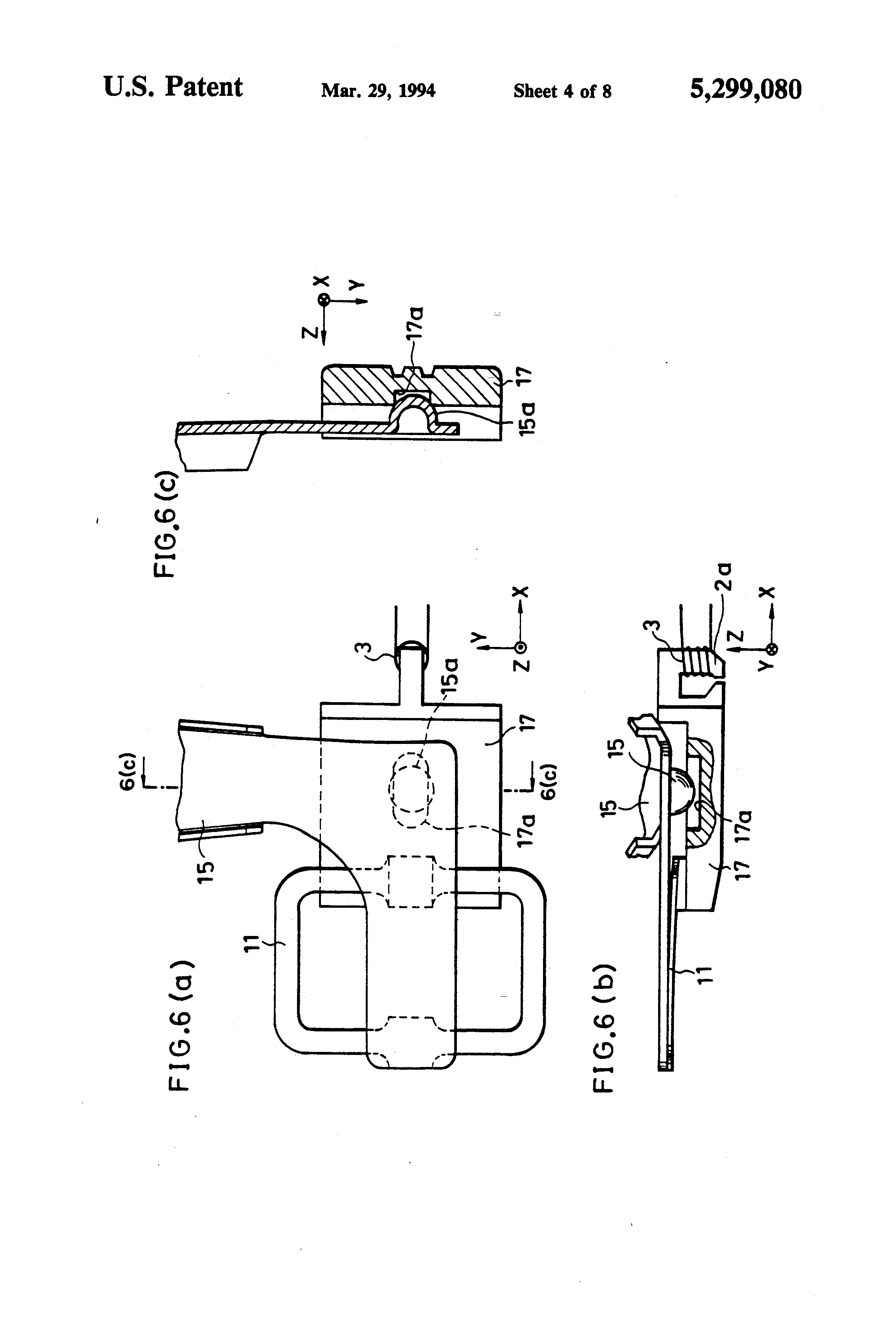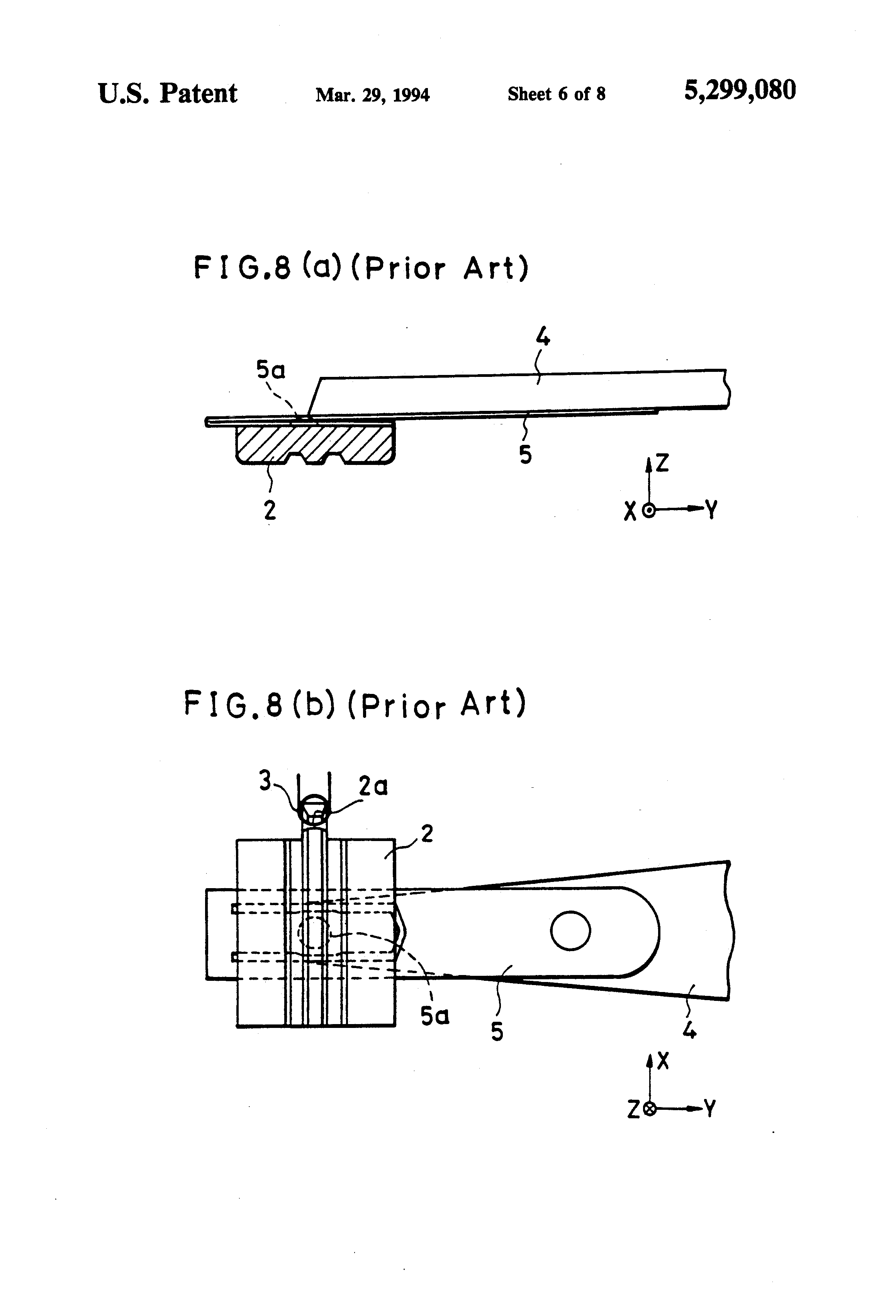 This is a continuation of U.S. application Ser. No. 07/645,185, filed on Dec. 27, 1990, now abandoned. 1. Field of the Invention The present invention relates to a floating head which is to be used in media-changeable type information recording/reproducing of magnetic disk apparatus or optical disk apparatus. Such apparatus is employed in peripheral memory apparatus of electronic computer or various information recording/reproducing apparatuses and performs information recording and reproduction keeping a given narrow relative distance with respect to a recording medium by utilizing the floating force caused by air flow. 2. Description of the Prior Art In recent years, high density and large capacity non-volatile memories are demanded, and rigid magnetic disk apparatuses such as external magnetic apparatuses of electronic computers are widely used. However, since in an ordinary rigid magnetic disk, its medium is not changeable, there is an inconvenience in that the cost per single information unit is high. Although apparatuses of medium changeable type are also available, their floating heads are in the form of Watrous type used with ordinary rigid magnetic disks, and are therefore not suited for a soft landing. And as for a large capacity external memory apparatus whose medium is expected to be changeable, opto-magnetic disks are recently attracting attention. For the opto-magnetic disks, although achieving a stable soft landing of floating head onto the recording medium is important, the magnitude of axial deflection which causes swaying of the surface of the medium is as much as two-orders larger as the magnitude of rigid magnetic disks, leaving many problems to be overcome. FIG. 7 is a perspective view of one example of a conventional Watrous type floating head disclosed in Tokkai Sho 64-84486, wherein the X-Y-Z coordinate is set as shown in the figure. FIG. 8(a) is a partial cross-sectional view showing its principal part seen from the positive X-axis, FIG. 8(b) is a bottom view of the principal part seen from the negative Z-axis, and FIG's. 8(c) and (d) are side views seen from the negative Y-axis. In these drawings, a changeable disk type recording medium 1, which is shown as a cutout piece thereof and can be such as a magnetic disk or an optical disk, has a magnetic recording film in the vicinity of its surface. A multiple number of concentric or spiral recording tracks are formed on the recording film with their center at a revolution center, which is not shown in the drawing. A slider 2 has a magnetic head made of a high magnetic permeability material for performing the recording with its magnetic flux Φ and reproduction of information to or from the disk-shaped recording medium 1. The slider 2 is held keeping a freedom of sliding in the radial direction under known control. The surface of the slider 2 facing the recording medium 1 is formed sufficiently smooth so as to form an air film between this surface and the disk-shaped recording medium 1. Here, for the convenience of illustration, an end part of the negative X-axis direction of the slider 2 is termed to be a flow-in end, whereas an end part of the positive X-axis direction is termed to be a flow-out end. At the flow-out end of the slider 2, a pole 2a having its longer dimension in the Z-axis direction and forming a magnetic gap m thereon is provided. On the pole 2a, a coil 3 is wound. The slider 2 is held by a load beam 4 made of a metal, such as a stainless steel sheet. On the load beam 4, an elastic part 4a, a flat-shaped fixing part 4b for holding a stem part of the elastic part 4a, and a rigid part 4c are provided. Along the rigid part 4c, a bending process is applied for giving a sufficient rigidity thereon. Since the elastic part 4a is formed wide in the X-direction and sufficiently thin in the Z direction, only the vertical motion in the Z direction is permitted for its tip part due to a moment present around the X-axis. A pair of holes are provided on the fixing part 4b, and the load beam is connected to a head travel mechanism not shown in the figure with screw bolts through the above holes. Movement of the head travel mechanism is permitted only in the direction parallel to the Y-axis, and thereby the head part of the slider 2 is made to be transferable in the radial direction of the disk-shaped recording medium 1. Such movement is called "seek action". Hereupon, the end part of the load beam 4 in the negative Y-direction is called a tip. The load beam 4 and the slider 2 are abutted to a gimbal 5 at the tip of the load beam 4. On the gimbal 5, a convex surface 5a of a partial sphere, the convex being toward the positive Z-direction (upward direction), is formed at the vicinity of the center of gravity of the slider 2. Thereby the bottom surface of the tip of the load beam 4 and the gimbal 5 touch each other at the convex surface 5a. The gimbal 5 holds the slider 2 in a manner that its rotations with respect to the load beam 4 around the X-axis as well as the Y-axis can be kept free. Thus, the instantaneous rotation center under the above condition becomes a center of the above-mentioned contact between the convex surface 5 and the load beam 4. The gimbal 5 is made of a material which is thinner compared with that of the beam 4, and a spring constant around the Y-axis is selected to be approximately 1/20 of that of the elastic part 4a of the load beam 4. Next, an explanation is given on the action of the conventional floating head constituted as described above. Now, it is assumed that, immediately after an exchanging of a disk-shaped recording medium 1 the disk-shaped recording medium 1 already keeps its revolution, and the slider 2 keeps a sufficiently large distance from the disk-shaped recording medium 1. Under this situation, in the vicinity of the slider 2, the disk-shaped recording medium 1 can be considered in a 2-dimensional model wherein it is provided to keep its movement only in the positive X-dire