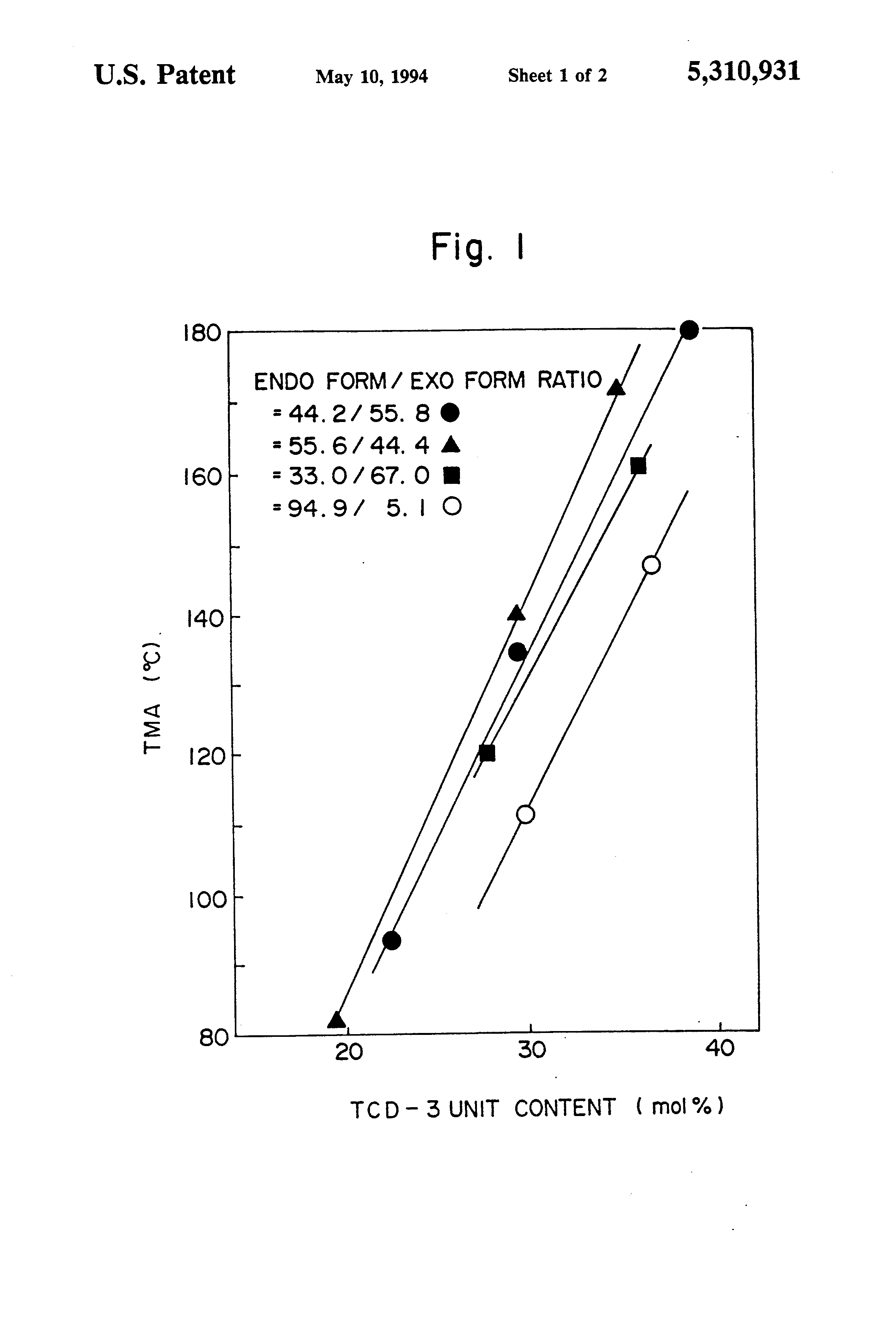 This is a division of application Ser. No. 07/565,143, filed Aug. 10, 1990, now U.S. Pat. No. 5,106,931, issued Apr. 21, 1992. This invention relates to isomerization of a cycloolefin such as tetracyclododecene or pentacyclopentadecene from an endo form to an exo form and to copolymerization of a cycloolefin and ethylene. The present applicants found that cycloolefin random copolymers obtained by copolymerization of ethylene and tetracyclododecenes are synthetic resins having excellent transparency and well-balanced properties such as heat resistance, thermal aging resistance, chemical resistance, solvent resistance, dielectric properties, mechanical properties and that such cycloolefin random copolymers exhibit excellent performance in the field of optical materials such as optical memory disks and fibers. Therefore, the present applicants already proposed such random copolymers in Japanese Laid-Open Patent Publications Nos. 168708/1985, 98780/1986, 115912/1986, 115916/1986, 120816/1986, and 252407/1987. Tetracyclododecenes used for production of such random copolymers are prepared by a Diels-Alder reaction between corresponding norbornenes and cyclopentadienes. In this Diels-Alder reaction, cis addition dominantly proceeds. For example, in a reaction between cyclopentadiene (a) and norbornene (b), tetracyclododecene having an endo form (c) is mainly formed as shown in the following reaction formula. The following formula is rarely formed. It is also known that cycloolefin random copolymers produced by copolymerizing tetracyclododecenes mainly having an endo form prepared by the above Diels-Alder reaction with ethylene exhibit excellent heat resistance and mechanical strength. International Laid-Open Publication No. W089/01950 describes that cycloolefin random copolymers obtained by copolymerization of ethylene with pentacyclopentadecenes (cycloolefins) have excellent transparency and are excellent not only in optical properties such as optical uniformity and small birefringence but also in other properties such as heat resistance, chemical resistance, dimensional stability and mechanical properties. Pentacyclopentadecenes used as a cycloolefin for production of such random copolymers are also prepared by a Diels-Alder reaction between corresponding dihydrodicyclopentadienes (partially hydrogenated products of dicyclopentadienes) and cyclopentadienes. For example, in a reaction between cyclopentadiene (a) and dihydrodicyclopentadiene (e), pentacyclopentadecene having an endo form (f) is mainly formed as shown in the following reaction formula in the same manner as the preparation of tetracyclododecene. The present applicant have made a diligent study to further improve heat resistance and mechanical strength of the above random copolymer of a cycloolefin and ethylene, and found that when an isomer mixture containing a larger amount of a cycloolefin having an exo form (sometimes called "exo-form cycloolefin" hereinbelow) is used as a cycloolefin, the resultant random copolymer has remarkably improved heat resistance and mechanical strength. The present applicant have also found an industrially advantageous process for isomerization for the production of such an isomer mixture containing a large amount of an exo form cycloolefin. It is an object of this invention to provide a process for the isomerization of a cycloolefin having an endo form (sometimes called "endo-form cycloolefin" hereinbelow) to a cycloolefin having an exo form. It is another object of this invention to provide a process for the production of an isomer mixture rich with a cycloolefin having an exo form from an isomer mixture poor with such a cycloolefin having an exo form under an isomerization reaction. It is further another object of this invention to provide a compositionally novel isomer mixture containing up to 80 mol % of an endo-form cycloolefin and at least 20 mol % of an exo-form cycloolefin. It is still further another object of this invention to provide a random copolymer produced from the above compositionally novel isomer mixture and ethylene and having excellent heat resistance and mechanical strength, and a process for the production of such a random copolymer. The other objects and advantages of this invention will be apparent from the following description. The above objects and advantages of this invention are achieved first by a process for the isomerization of a cycloolefin from an endo form to an exo form which comprises isomerizing an endo-form cycloolefin of the following formula (I) that m and n cannot be simultaneously zero, in the presence of a solid acid catalyst to convert its endo form into the corresponding exo form. FIG. 1 shows a relationship between a content (mol %) of tetracyclododecene-3 in each of ethylenetetracyclododecene-3 copolymers obtained by copolymerization of ethylene with each of four tetracyclododecene-3 isomer mixtures having a different endo-form cycloolefin/exo-form cycloolefin ratio and a TMA softening temperature of each of the copolymers. FIG. 2 shows a relationship between a content (mol %) of tetracyclododecene in the above ethylene/tetracyclododecene-3 copolymers and flexural modulus thereof. The starting material used in this invention is a cycloolefin having an endo form, and represented by the foregoing formula (I). In the formula (I), each of R1 to R14, independently from each other, is a hydrogen atom, a halogen atom or a hydrocarbon group. Preferred examples of the halogen atom are fluorine, chlorine and bromine. Preferred examples of the hydrocarbon group are lower alkyl groups such as methyl, ethyl, n-propyl, iso-propyl, n-butyl, sec-butyl, iso-butyl and tert-butyl groups. Further, in the formula (I), each of R15 to R18, independently from each other, is a hydrogen atom, a halogen atom or a hydrocarbon group. Examples of the halogen atom are as specified above. Preferred examples of the hydrocarbon group are alkyl groups such as methyl, ethyl, propyl, iso