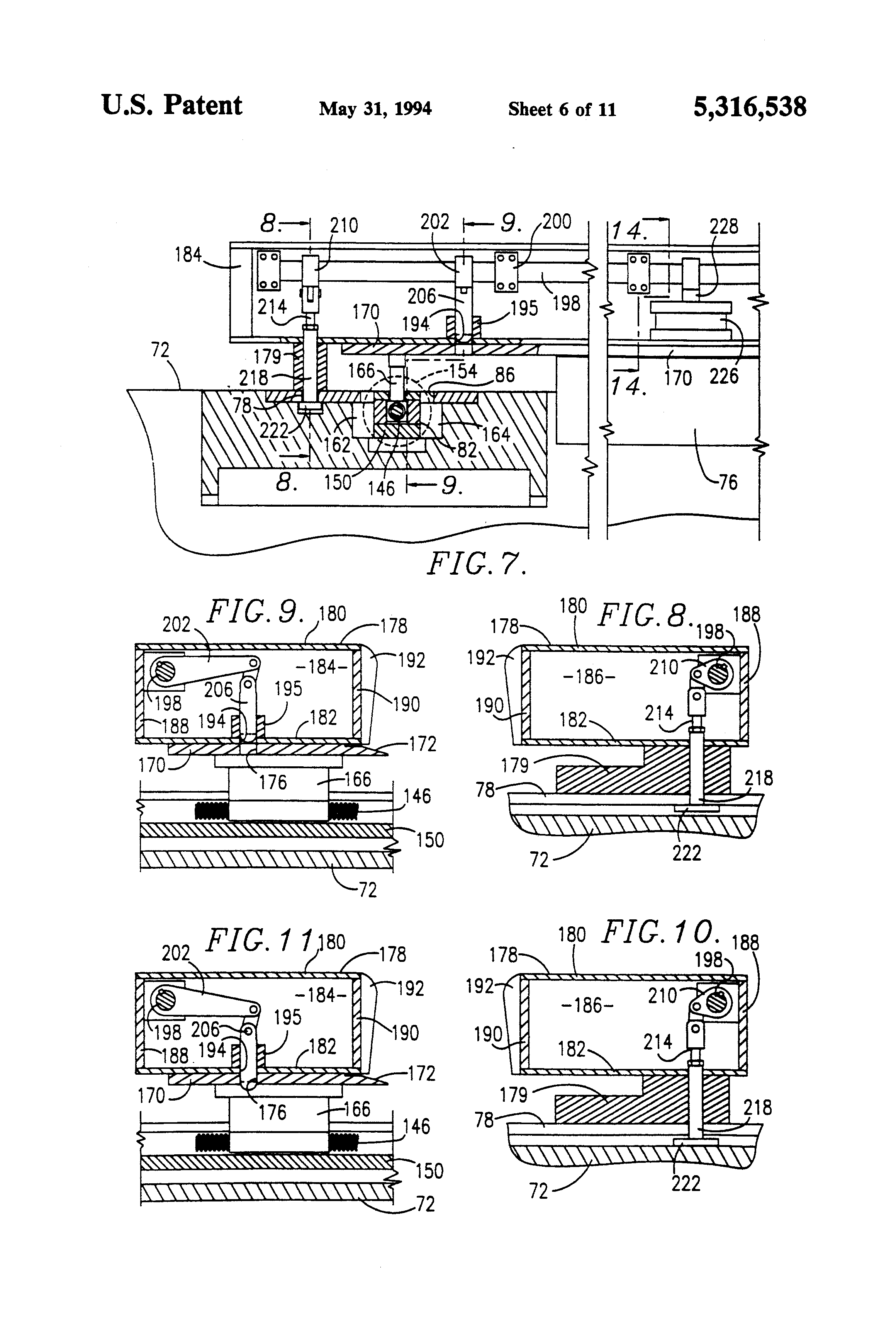 1. A scoring/slotting assembly comprising: first and second elongated rotatable shafts connected by a drive assembly providing means for rotating said shafts at fixed relative angular velocities, said first shaft carrying a scoring wheel assembly including a first ring gear presenting outboard teeth, said first ring gear presenting an inner face and an opposed outer face with first gear teeth extending between the first ring gear inner and outer faces, said second shaft carrying a slotting wheel assembly including a pull ring coupled with an adjustable blade, means for mounting said pull ring and for allowing rotation of said pull ring and adjustable blade around said shaft, and a second ring gear presenting outboard teeth, said second ring gear being coupled with said pull ring for rotation therewith, said second ring gear presenting an inner face and an opposed outer face, with second gear teeth extending between said second ring gear inner and outer faces; said first and second gear teeth being located in opposition to each other on said first and second shafts, a rotatable transfer gear mounted in direct simultaneous meshing engagement with said first and second gear teeth of said first and second ring gears; and a first compensator mechanism coupled with said first shaft and means for interrupting said fixed relative angular velocities to cause said transfer gear to rotate said second ring gear and adjustable blade into a new angular relationship with said second shaft. 2. The slotting/scoring assembly of claim 1, said slotting wheel assembly further including a fixed blade. 3. The slotting/scoring assembly of claim 2, including a second compensator mechanism coupled with second first shaft and operable to interrupt said fixed relative angular velocities by rotating said second shaft and fixed blade into a new angular relationship with said adjustable blade. 4. The slotting/scoring assembly of claim 3, said fixed relative angular velocity including each shaft rotating in unison at the same angular velocity.