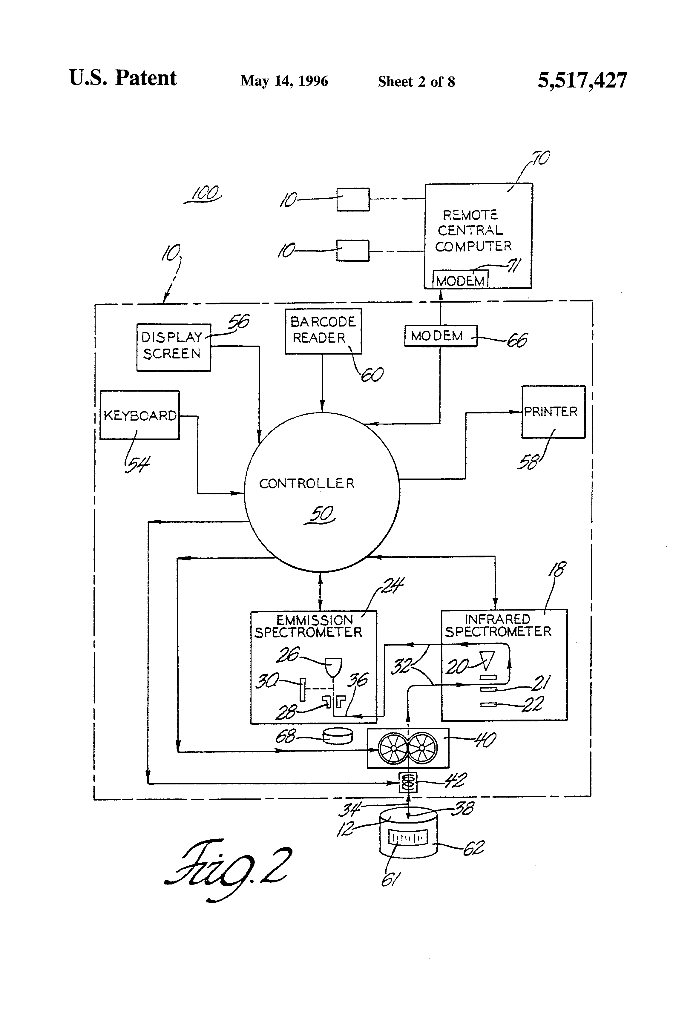 This is a divisional of copending application Ser. No. 08/220,274 filed on Mar. 30, 1994. The invention relates to the analysis of an oil sample to determine metal additive content and other organic content, and more particularly, to a self-contained analyzer for on-site use and analysis. Oil is generally utilized to lubricate moving parts in mechanical systems, such as engines, transmissions, and hydraulics in vehicles. Contaminants are not originally present in the oil but are by-products of wear and corrosion in these systems. Metal particulates are formed through abrasion or chemical corrosion and cause further deterioration of internal parts. Normal operation causes oxidation, nitration, and sulfation, but the introduction of additional elements or compounds into the oil accelerates the accumulation of metal particles from abrasion and corrosion. The lubricant filters are designed to remove larger size particulates from oil. However, this leaves the majority of smaller contaminants free to further affect the equipment, especially the nonmetallic components such as pump diaphrams, gaskets and seals, fluid lines, etc. Concentrations of water in oil affect systems differently, i.e., some systems are of little concern unless above a certain concentration while other systems may be effected with the slightest trace of water. Small amounts of water come from primarily water vapor in the atmosphere, and larger amounts may be due to water leaks, which could damage equipment. Ethylene glycol is the main component used in anti-freeze products. A significant leak could also damage equipment. Thus, contaminants in oil such as ethylene glycol, fuel, silicon, and soot and other chemicals are also concerns. Oil analysis provides a method of monitoring wear trends on moving parts of virtually any system or mechanical device. This allows identifying changes from normal wear patterns and thereby predicts progressive damage-type failures. The composition of foreign materials in oil can be determined by a variety of techniques, such as infrared spectrometry, optical emission spectrometry, x-ray fluorescence, etc. Accurate oil analysis has been provided mainly in a laboratory setting. A system utilized in a laboratory is disclosed in U.S. Pat. No. 3,526,127, issued to Sarkis on Sep. 1, 1970. Sarkis is a semi-automated oil analysis system for a laboratory which utilizes a metal content testing device, a viscometer and an infrared absorbing device. These testing devices transmit their results to a computer which stores reference limits, compares the tested values to the reference limits, and provides evaluation, reporting and trending of oil for various types of engines. An oil sample is separated into three different containers; one container of oil is read by the metal electrometer to determine the concentration of metals; a second container of oil is measured by the viscometer; and a third container of oil is measured by the infrared analyzer to determine contents of water and glycol, and determine oil degradation. The results are sent to a computer which stores the reference information of viscosity, metal content, and infrared characteristics. It is desirable to have a shop-level or on-site machine that can comprehensively evaluate the condition of an engine, transmission, gear box, or other oil source through the measurement of microscopic wear debris and dissolved contaminants in the equipment's lubricating oil. The invention includes an oil analysis system for analyzing the contents of oil. The system comprises a plurality of isolated and remote oil test assemblies each including an oil spectrometer for automatically testing contents of the oil and for storage of test results from the oil spectrometer with associated identification information of the oil. A plurality of communicators transfer the test results with the associated identification information from the plurality of oil test assemblies. A centralized computer assembly is connected to each of the communicators for receiving the test results with the associated identification information and for evaluating the test results based on the identification information to determine characteristics of the test results from a plurality of the remote oil test assemblies. Other advantages of the present invention will be readily appreciated as the same becomes better understood by reference to the following detailed description when considered in connection with the accompanying drawings wherein: FIG. 1 is a perspective view of the test assembly with internal components indicated in phantom lines; FIG. 2 is a schematic diagram of the analysis system; FIG. 3 is a schematic diagram of the computer controller; FIGS. 4a and 4b are a flow chart of the operation of the computer controller; and FIG. 5a is a table of events stored in the event table memory of the computer controller and FIGS. 5b and 5d are tables of rules stored in the rules memory of the computer controller. A test assembly 10 for testing a sample 12 of oil to determine additives and contents thereof is generally illustrated in FIG. 1. The test assembly 10 allows a sample of oil to be tested to determine wear from analysis of contaminants, additive elements, oxidation, nitration, etc., as subsequently discussed. The test assembly 10 automatically performs non-destructive and destructive testing of the sample, analysis and data evaluation, and diagnoses and reports the results and remedial action required based on the analyzed sample 12. As illustrated in FIG. 2, the test assembly 10 is optionally part of an oil analyzing system 100 which includes and incorporates information from a plurality of test assemblies 10 for trend reporting and general data base information and update. The test assembly 10 may operate independent and separate from the remainder of the oil analyzing system 100. The system 100 is subsequently discussed. The test assembly 10 includes a housing 14 for containing the t
