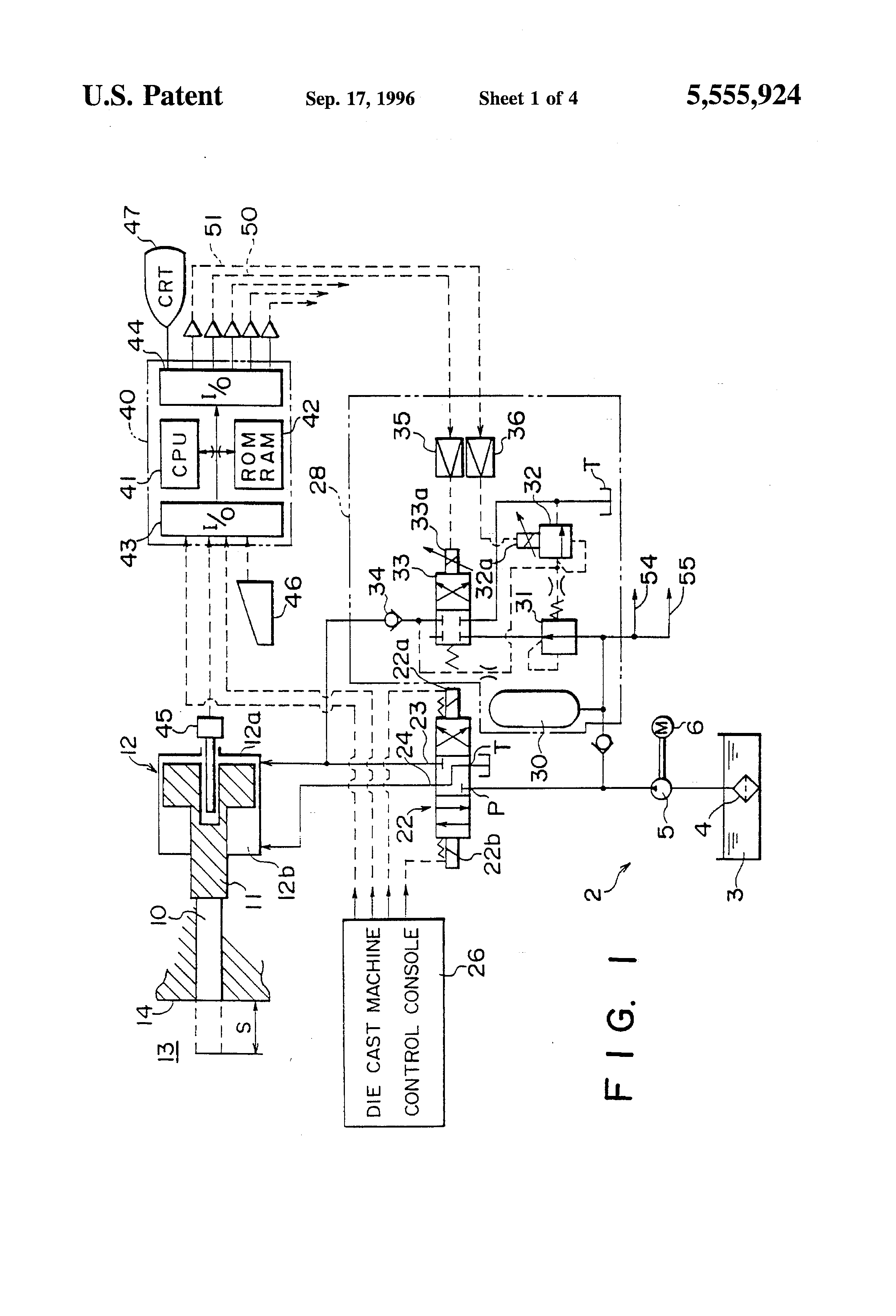 On the other hand, the output circuit 44 is connected to a display unit (e.g., CRT) 47 to display various data representative of progression status of the casting cycle. Further, it is also possible to input various data required to control the squeeze pin 12 through the key board 46 in accordance with instructions displayed on the display unit 47. Further, to the controller 40, the amplifier 35 for the proportional direction flow rate control valve 33 and the amplifier 36 for the proportional relief valve 32 are both connected through signal lines 50 and 51, respectively.
