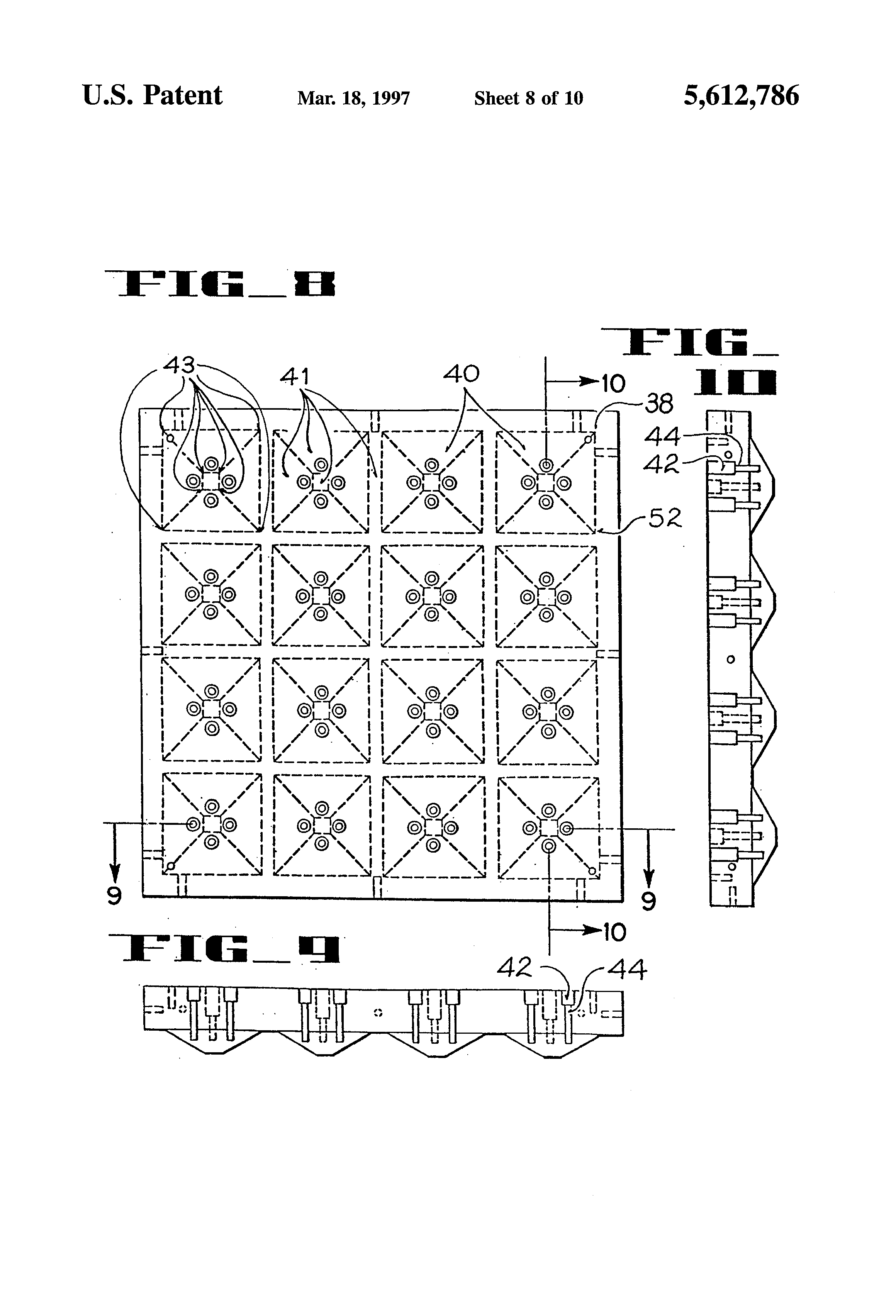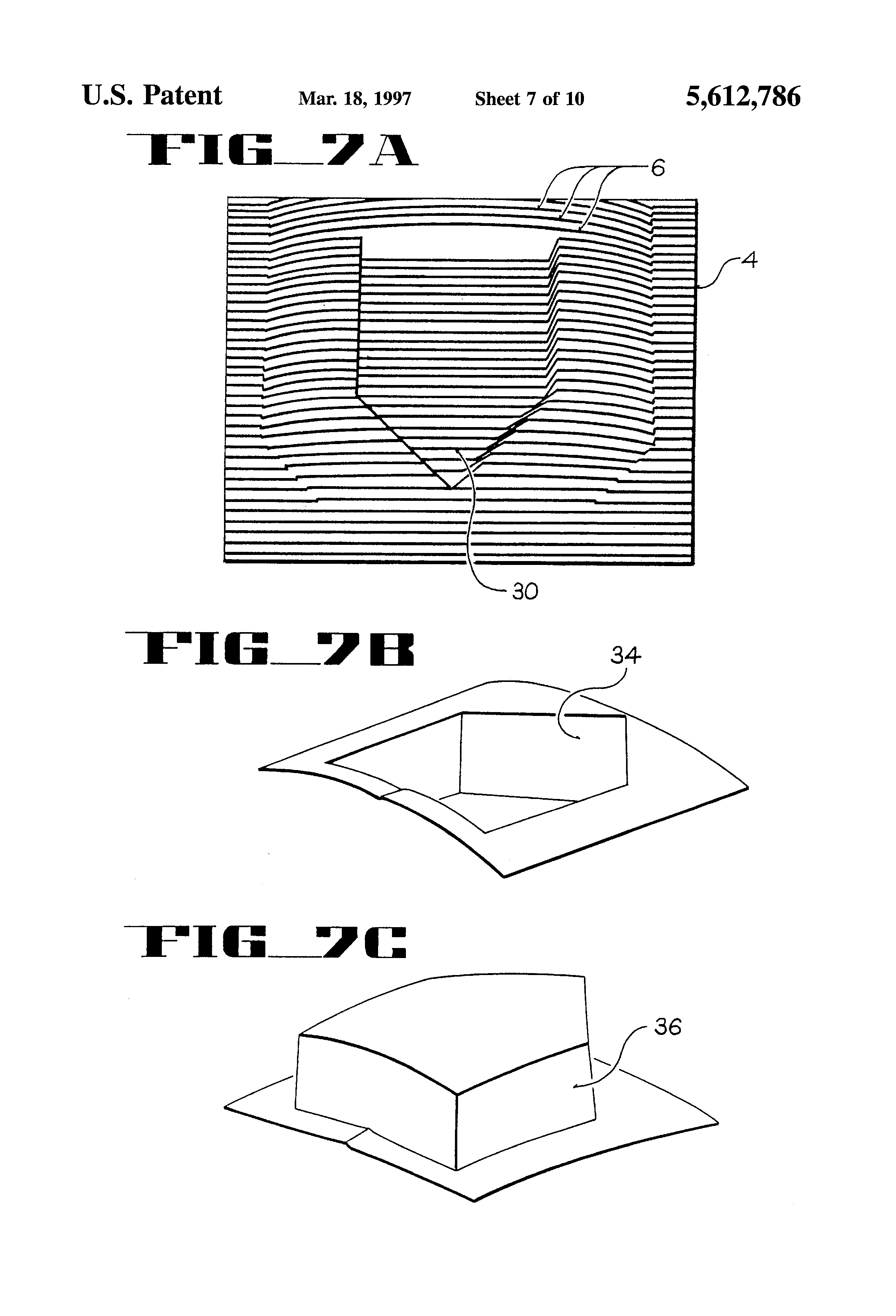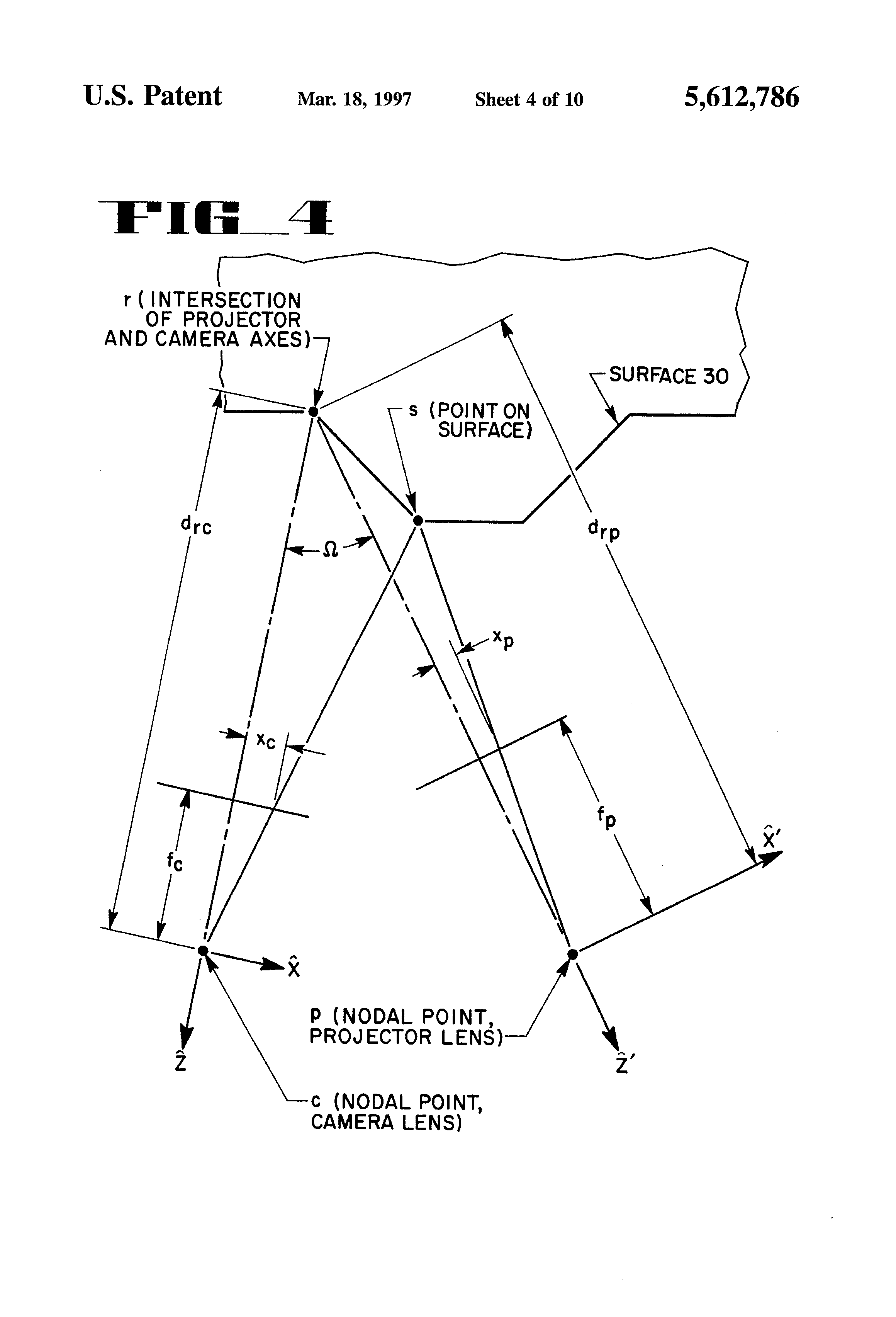 This is a continuation of U.S. patent application Ser. No. 08/249,841 filed on May 26, 1994, now abandoned. 1. Technical Field This invention pertains to the fields of a) optically measuring the contours of three-dimensional objects; and b) calibrating optical systems. 2. Background Art In classical interferometry measurement techniques, measurement dynamic range and accuracy are very limited. High accuracy can be achieved over just a small range of depth. Moire technique measurements are more suited to measuring objects that are nearly two-dimensional, and require high frequency fringes for both projection and reference, making alignment and phase shifting problematic. Photogrammetry measurement techniques are very slow and labor intensive, and provide high accuracy measurement for only a sparse set of points on a surface. The present invention overcomes these disadvantages, by providing high accuracy depth measurements over a large range of depth. Measurement accuracy is assured through a reliable calibration procedure. This calibration procedure does not require tight alignment tolerances or assume ideal alignment. The measurement data for a surface are at very high resolution, to provide a full three-dimensional surface image. Measurements and data processing are done quickly. The projection system can use white light, which does not suffer from coherent light effect problems. Coarse gratings can be used with direct fringe line projection, reducing alignment and optical quality requirements, and minimizing phase shifting motion accuracy requirements. Temporal phase shifting provides high resolution three-dimensional measurements. Spatial phase shifting provides a high-speed (virtually instantaneous) measurement capability with some reduction in resolution. The present invention encompasses a method for optically measuring the contours (30) of a three-dimensional object (4). The method comprises the steps of placing the object (4) into the field of view of an optical system (2, 8); activating the optical system (2, 8) to obtain a set of data giving a phase (xt) at each of a plurality of pixels corresponding to the object (4); unwrapping the phases (xt) by a method of ordered phase unwrapping; and converting the set of unwrapped phases into a set of three-dimensional coordinates (xs, ys, zs) of said object (4) for each of said pixels. The present invention also encompasses a method for calibrating an optical system (2, 8). These and other more detailed and specific objects and features of the present invention are more fully disclosed in the following specification, reference being had to the accompanying drawings, in which: FIG. 1 is a sketch of an optical system using the present invention. FIGS. 2a, 2b, and 2c are a set of three frames of the projection of fringe lines 6 onto a viewed object 4. FIG. 3 is an exploded diagram of a projector 2 suitable for use in the present invention. FIG. 4 is a top view showing the geometry of the optical system 2, 8 of the present invention. FIG. 5 is a sketch of an alternative embodiment of the optical system 2, 8 of the present invention. FIGS. 6a, 6b, and 6c are a set of illustrations showing how the present invention can model a first object 4. FIGS. 7a, 7b, 7c are a set of three illustrations showing how the present Invention can model a second object 4. FIG. 8 is a bottom view of a first embodiment of a test calibration fixture 38 suitable for use in the present invention. FIG. 9 is an end view of the test calibration fixture 38 of FIG. 8. FIG. 10 is a side view of the test calibration fixture 38 of FIG. 8. FIG. 11 is a top view of a second embodiment of a test calibration fixture 46 suitable for use in the present invention. FIG. 12 is a side view of the test calibration fixture 46 depicted in FIG. 11. FIG. 13 is a bottom view of the test calibration fixture 46 depicted in FIG. 11. FIG. 14 is an end view of the test calibration fixture 46 depicted in FIG. 13. FIG. 15 is an end view of the test calibration fixture 46 depicted in FIG. 12. FIG. 16 shows the relation between coordinate systems for the geometry depicted in FIG. 4. With respect to the general embodiment depicted in FIG. 1, projector 2 is any projector capable of illuminating object 4 with a set of fringe lines 6. Projector 2 may use a white light or a monochromatic light source. It may provide continuous, flash, or strobe illumination. The boresight of the light emanating from projector 2 may be perpendicular to object 4 or, as depicted in FIG. 1, may form an other than 90° angle therewith. The fringe lines 6 falling on object 4 are made to have a sinusoidally varying intensity as seen by camera 8; this variation is in the x (horizontal) direction in the preferred embodiment. The lines 6 illustrated in FIG. 1 represent lines of maximum intensity. They are vertically disposed in this embodiment. These lines 6 are 360° apart in phase. One fringe line 6 is identified with a fiducial spot 7 to establish a reference for phase and position calculations during calibration and measurement operational modes. Camera 8 has a field of view encompassing all or part of object 4. Camera 8 may be any electronic camera, such as a CCD, CID, or Vidicon camera or film. The boresight of camera 8 may be perpendicular to object 4, or, as depicted in FIG. 1, may form an other than 90° angle therewith. The image plane of camera 8 is divided into a set of pixels, e.g. 640×480 pixels. Camera 8 may or may not employ frame integration. The image data recorded by camera 8 are fed into computer 10, e.g., a computer workstation containing a display, storage, and user interface, such as a keyboard, trackball, and/or mouse. Electronic controller 12 is coupled between computer 10 and projector 2. The purpose of controller 12 is to synchronize camera 8 with projector 2, e.g., when projector 2 is flashing or strobing, and to move the slide 20 on the translation stage 24 by means of the motor 26 within the project