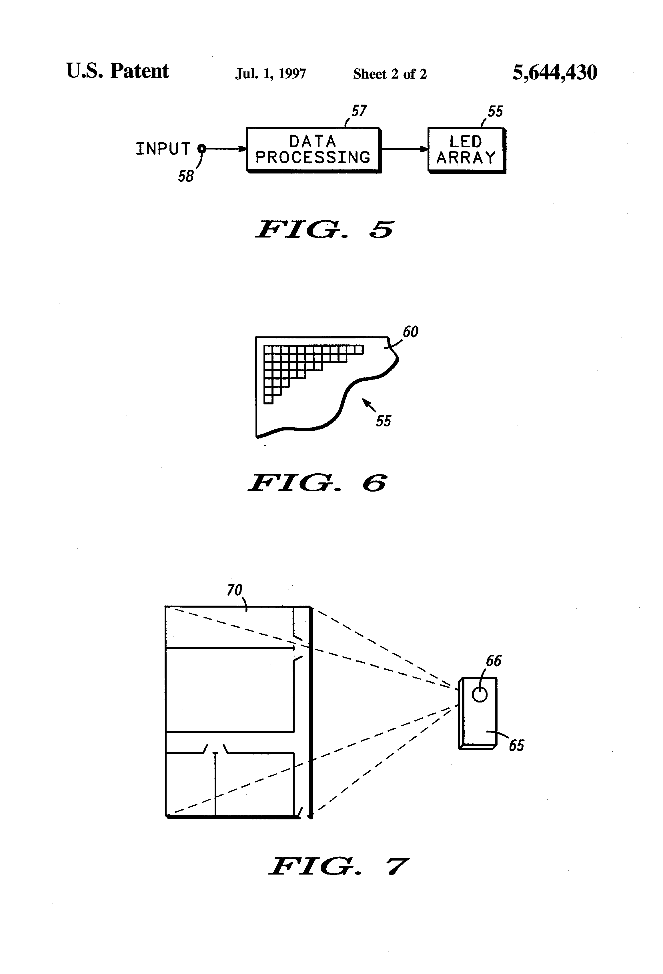 The present invention pertains to optical magnifiers and more specifically to optical magnifiers incorporating a single fold in the optical path. With the advent of the communications era, one of the major markets for optical devices is portable electronics equipment, such as cellular telephones, pagers, two-way radios, data banks, computers and the like. Generally, it is desirable that the optical source devices in this type of equipment are compact with low power, inexpensive and include high quality optics with large angular magnification. However, large angular magnification requires a small focal length, as can be seen from the relationship for angular magnifying power (MP) set forth below. Generally, in the discussion below the optical system is treated as a single lens for convenience in describing the relationships. MP=V(b+f)/[f(b+e)] where: V is a constant, the distance of distinct vision (approximately 10" or 254 mm); b is the distance from the lens to the virtual image; e is the distance from the lens to the eye; and f is the effective focal length. A small effective focal length in turn requires that the optical system have a small F/No., which translates into a fast system in the applications being described. Generally, a fast system is defined as a system with an F/No. less than or equal to approximately 2. As is known in the art, the F/No. is determined by the ratio of the focal length to the diameter of the lens. Thus, as the focal length is reduced and the system is made smaller, it is inherent that a larger area of the lens, or lens system, is used. This use of a larger area of the lens system results in greater aberration in images transmitted through the system and a need for greater aberration correction. As is well understood by those skilled in the art, greater aberration correction means more elements in the system, which in turn means larger size and greater cost. Therefore, a major problem that is inherent in any attempts to produce compact, inexpensive, high quality optics with large angular magnification is aberration correction. Several different attempts have been made to provide optical systems for portable electronic devices, one of which includes all refractive or reflective optics with a single line of pixels and a vibrating mirror. The single line of pixels is sequenced through the rows of a raster and, simultaneously, the vibrating mirror scans the line of pixels to properly position each subsequent row in its proper orientation. The problem with this system is the high accuracy of timing required, the amount of power used and the blurring of the ultimate image by the vibrations of the mirror. Also, this system is extremely fragile and not conveniently adaptable to the rough use normally occurring in portable equipment. The system that is normally used at the present time is one using a large image source and either a direct view image or low magnification optics. The major problem with this system is that it greatly limits the size of the portable electronics on which it is used. Basically, the image must be large enough for an operator to read and/or understand the information being displayed. Thus, for example, if one wanted to display an 8.5" by 11" sheet of paper (a standard letter), the direct view display must be 8.5" by 11" to be easily read. Such a display is clearly too large to be incorporated into most portable communications devices, such as pagers, two-way radios, cellular phones and the like. It would be highly desirable to devise an optical system with the attributes of being compact and inexpensive, and including high quality optics with large angular magnification, while correcting for aberrations. It is a purpose of the present invention to provide a very small, compact and relatively inexpensive optical magnifier. It is another purpose of the present invention to provide a very small, compact and relatively inexpensive optical magnifier which includes high quality optics with relatively large angular magnification. It is still another purpose of the present invention to provide a very small, compact and relatively inexpensive optical magnifier which includes high quality optics with relatively large angular magnification with aberration correction. It is a further purpose of the present invention to provide a, compact and relatively inexpensive optical magnifier which includes high quality optics with relatively large angular magnification with aberration correction, which is small enough to conveniently fit in portable electronic equipment. The above problems and others are substantially solved and the above purposes and others are realized in a single fold optical magnifier including a plurality of optical elements having an inlet with a light outlet directed at an angle to the inlet and a reflecting surface positioned to direct light from the inlet to the outlet. The optical elements define a light path from the inlet to the outlet with a total average optical length of approximately 15 to 35 millimeters. The plurality of optical elements includes at least one aspheric surface to correct for aberration and at least one diffractive optical element positioned in the light path to provide additional aberration correction. The optical elements are constructed to angularly magnify images by at least a power of ten. The above problems and others are substantially solved and the above purposes and others are further realized in image manifestation apparatus for use in small portable electronics equipment. The image manifestation apparatus includes an image generator with a two dimensional array of light emitting devices formed on a single substrate and driver circuits coupled to the light emitting devices and including a data input terminal. The light emitting devices are individually addressable by the driver circuits so as to generate a real image including one of a plurality of lines of alpha-numerics and graphics from data received 