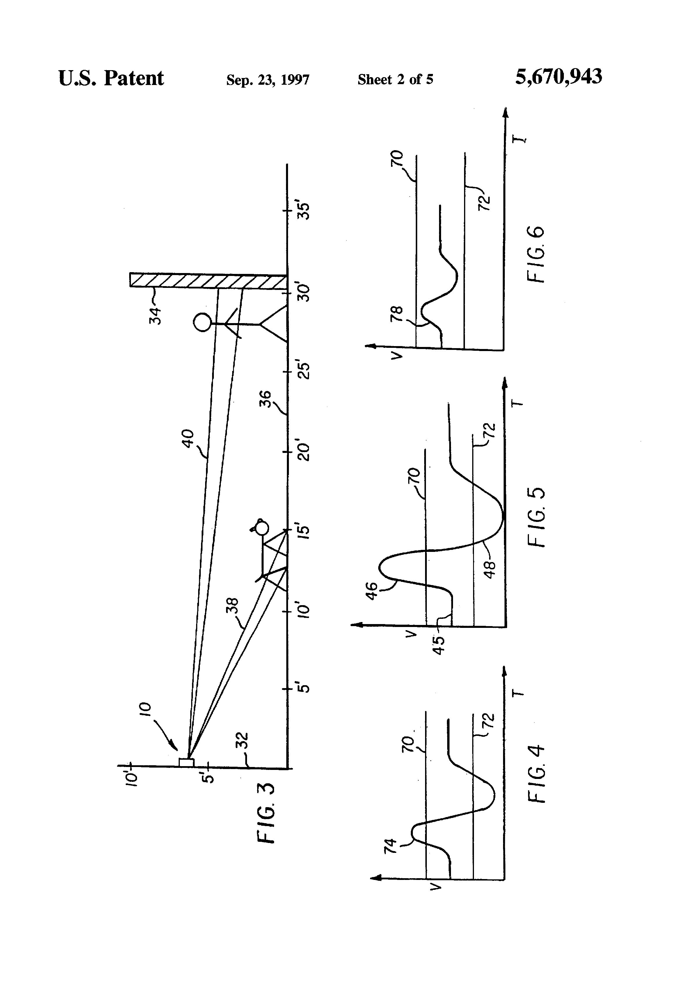 1. An infra-red intruder detector for covering a protected region above a floor plane and triggering an alarm signal in response to detected target temperatures different from background temperature; said detector comprising: optics defining a lower field-of-view intercepting said floor plane in said region and an upper field-of-view extending entirely above said floor plane in said region; and, a control triggering said alarm signal at said target to background temperature differences: a) greater that seven degrees Fahrenheit in said lower field-of-view and b) less than seven degrees Fahrenheit in said upper field-of-view. 2. The invention of claim 1, wherein said control triggers said alarm signal at said respective target to background temperature differences: a) within a range of eight to thirteen degrees Fahrenheit in said lower field-of-view and b) within a range of one to four degrees Fahrenheit in said upper field-of-view. 3. An infra-red intruder detector for covering a protected region above a floor plane; said detector comprising: infra-red sensing means defining a plurality of lower fields-of-view intercepting said floor plane in said region and a plurality of upper fields-of-view extending entirely above said floor plane in said region, said detector having a lower sensitivity to temperature change in said lower fields-of-view compared to said upper fields-of-view; and, control means coupled to said sensing means for detecting infra-red signals from humans in said lower fields-of-view and rejecting infra-red signals from dogs in said lower fields-of-view. 4. A passive infra-red intruder detector for issuing an alarm signal in response to temperature differentials between a background and a moving target; said detector comprising: a sensing element sensitive to infra-red energy; optics focusing infra-red energy onto said sensing element from discrete upper and lower fields-of-view, respectively, said detector having relatively greater sensitivity to said temperature differentials in said upper fields-of-view compared to said lower fields-of-view; and, temperature compensating means for changing said temperature sensitivity as a function of said background temperature in said lower fields-of-view, increasing said sensitivity as said background temperature approaches human skin temperature. 5. The invention of claim 4, wherein said temperature compensating means maintains said temperature sensitivity in said lower field-of-view at least three degrees less than said temperature sensitivity in said upper fields-of-view. 6. A passive infra-red intruder detector comprising: a sensing element sensitive to infra-red energy; infra-red optics defining multiple zones in a region under surveillance and focusing infra-red energy from said zones onto said sensing element, said zones including upper zones and lower zones, and wherein said optics is relatively more efficient transmitting infra-red energy from said upper zones compared to said lower zones. 7. A security device for detecting intruders in a region under surveillance, the region defined by an effective range of the device above a floor plane; said device comprising: a pyroelectric sensor; means defining at least one lower zone intercepting said floor plane within said region and at least one upper zone extending entirely above said floor plane in said region, said means directing infra-red energy from said upper zone onto said sensor with a first efficiency and from said lower zone onto said sensor with a second efficiency less than said first efficiency. 8. The invention of claim 7, wherein said means comprises a first group of lenslets defining said upper zone and a second group of lenslets defining said lower zone, and wherein said lenslets in said upper group have f-numbers lower than said lenses in said lower group. 9. The invention of claim 7, wherein said means includes a filter mechanism causing said pyroelectric sensor to be less responsive to infra-red energy from said lower zone compared to said upper zone. 10. The invention of claim 9, wherein said filter mechanism includes optical densities that are greater in said lower zone compared to said upper zone. 11. The invention of claim 7, further including: a reference source providing a threshold signal establishing detection sensitivity of said device; a temperature sensor providing an output signal proportional to temperature adjacent said sensor; and, an adjusting mechanism setting said threshold signal as a function of temperature to adjust the detection sensitivity of said device. 12. A security device for detecting intruders in a region defined by an effective range of the device above a floor plane; said device comprising: first and second channels producing electrical signals in response to changes in infra-red energy in said region, said first channel defining lower zones intercepting said floor plane within said region and said second channel defining upper zones extending entirely above said floor plane in said region, said first channel being less sensitive to changes in infra-red energy than said second channel. 13. The invention of claim 12, wherein said second channel is twice as sensitive to changes in infra-red energy than said first channel. 14. The invention of claim 13, wherein said first and second channels respectively include means providing gain, and said gain in said second channel is greater than said gain in said first channel. 15. The invention of claim 12, wherein said device includes a filtering mechanism that attenuates the signal in said first channel compared to said second channel. 16. The invention of claim 12, wherein said first and second channels respectively include optical elements transmitting infra-red energy less efficiently in said first channel than in said second channel. 17. An infra-red intruder detector for covering a protected region having a background temperature and a floor plane; said detector comprising: an infra-re