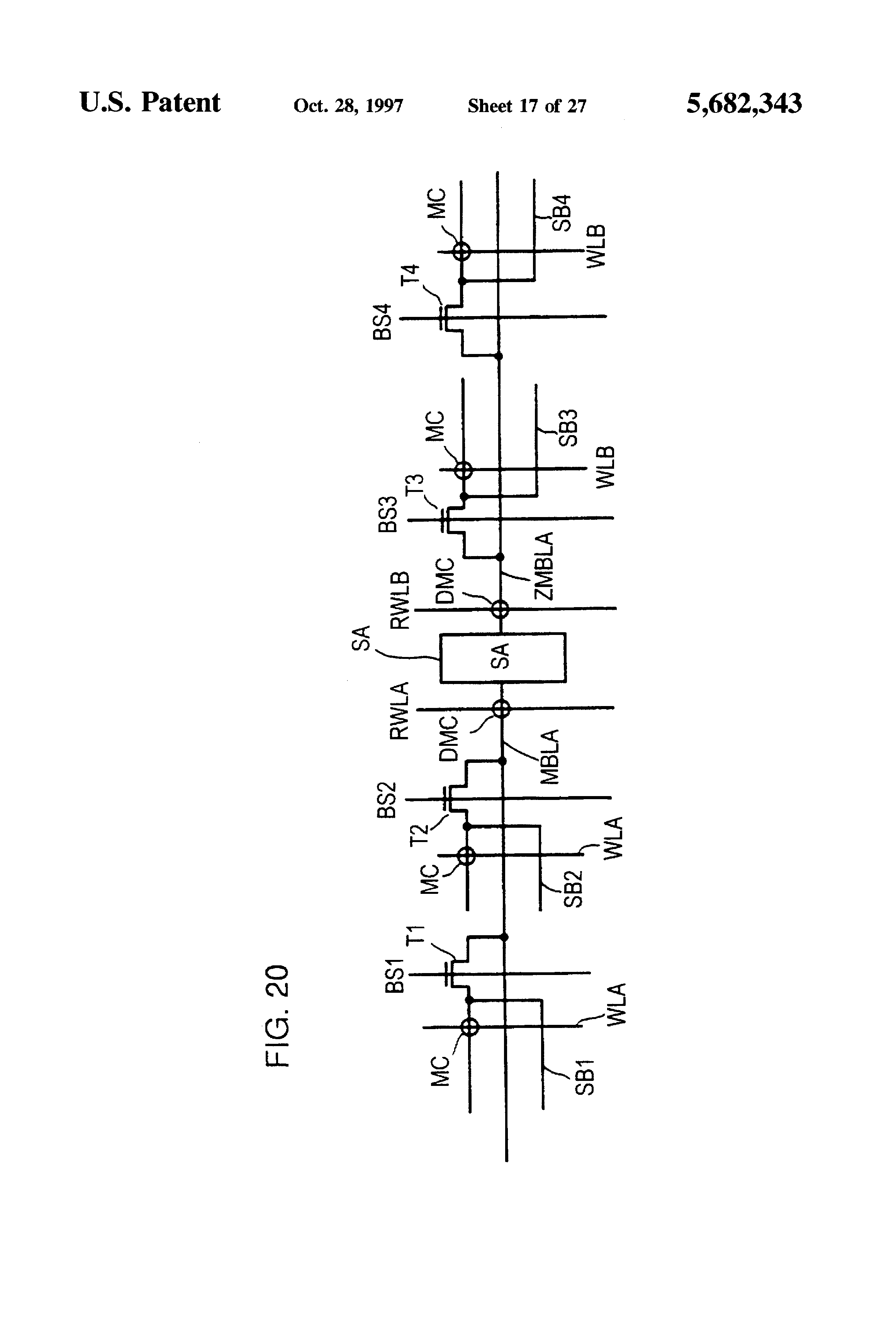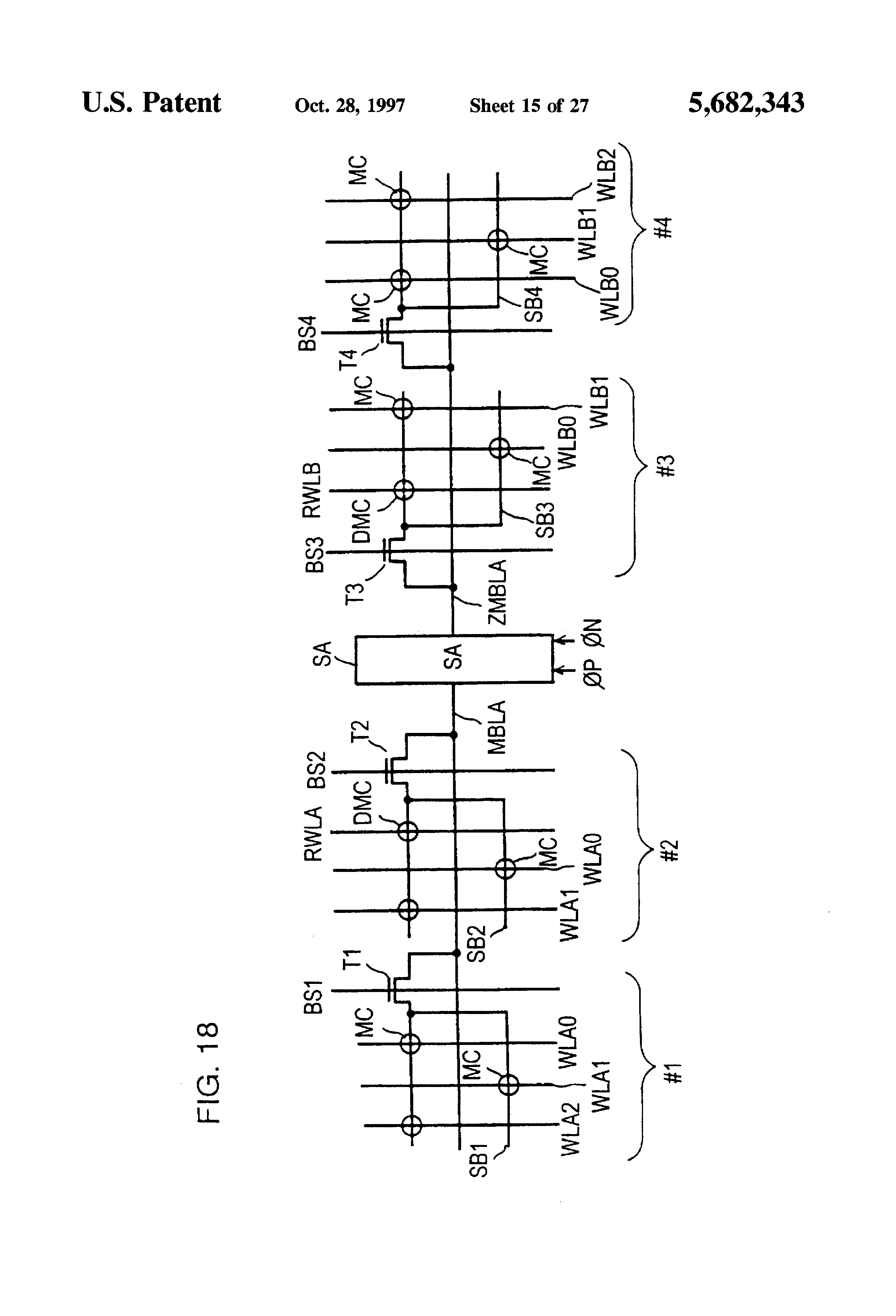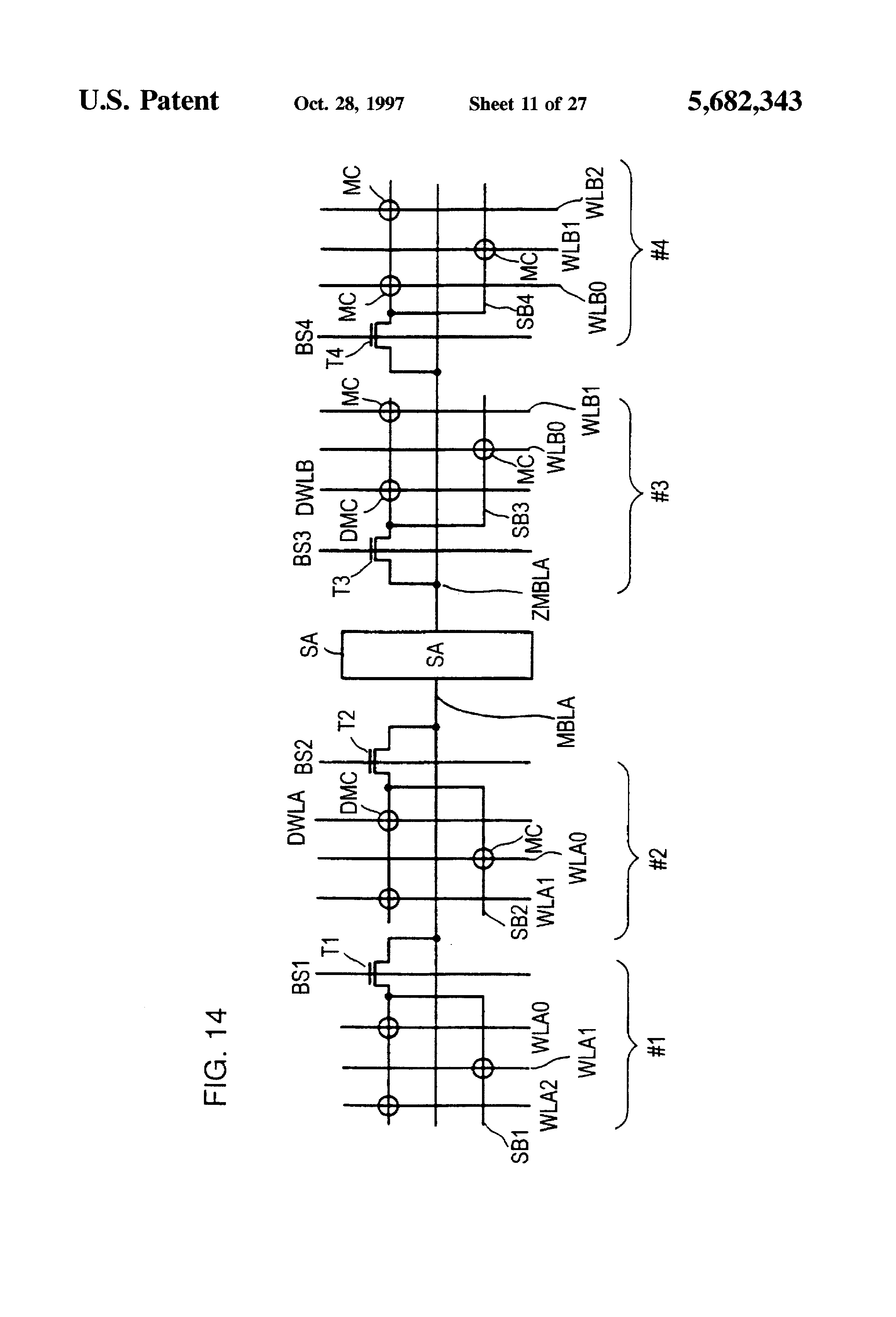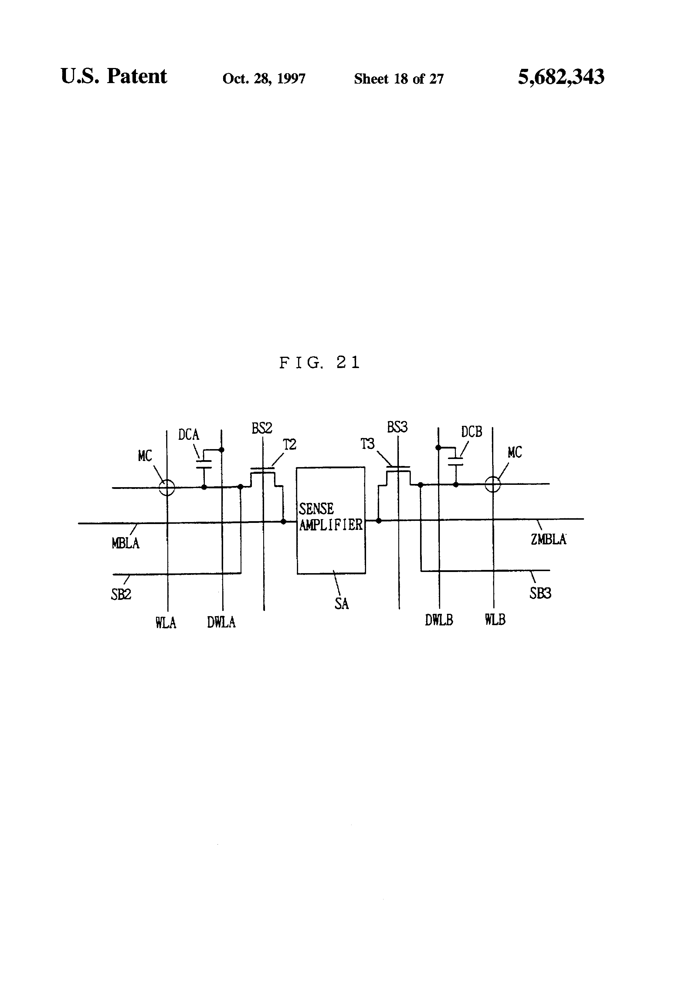 Main bit lines MBL and ZMBL are disposed at opposite sides of a sense amplifier SA. Main bit lines MBL and ZMBL each are provided for paired sub-bit lines SBL1 and SBL2 (or SBL3 and SBL4). Sub-bit line pair SBL1 and SBL2 is connected to main bit line MBL via a block select switch T1. Sub-bit line pair SBL3 and SBL4 is connected to main bit line ZMBL via a block select switch T2. Since one main bit line is provided for two sub-bit lines, a pitch of the main bit lines is twice as large as a pitch of the sub-bit lines, so that conditions on the pitch of main bit lines are remarkably eased, which facilitates layout of elements.