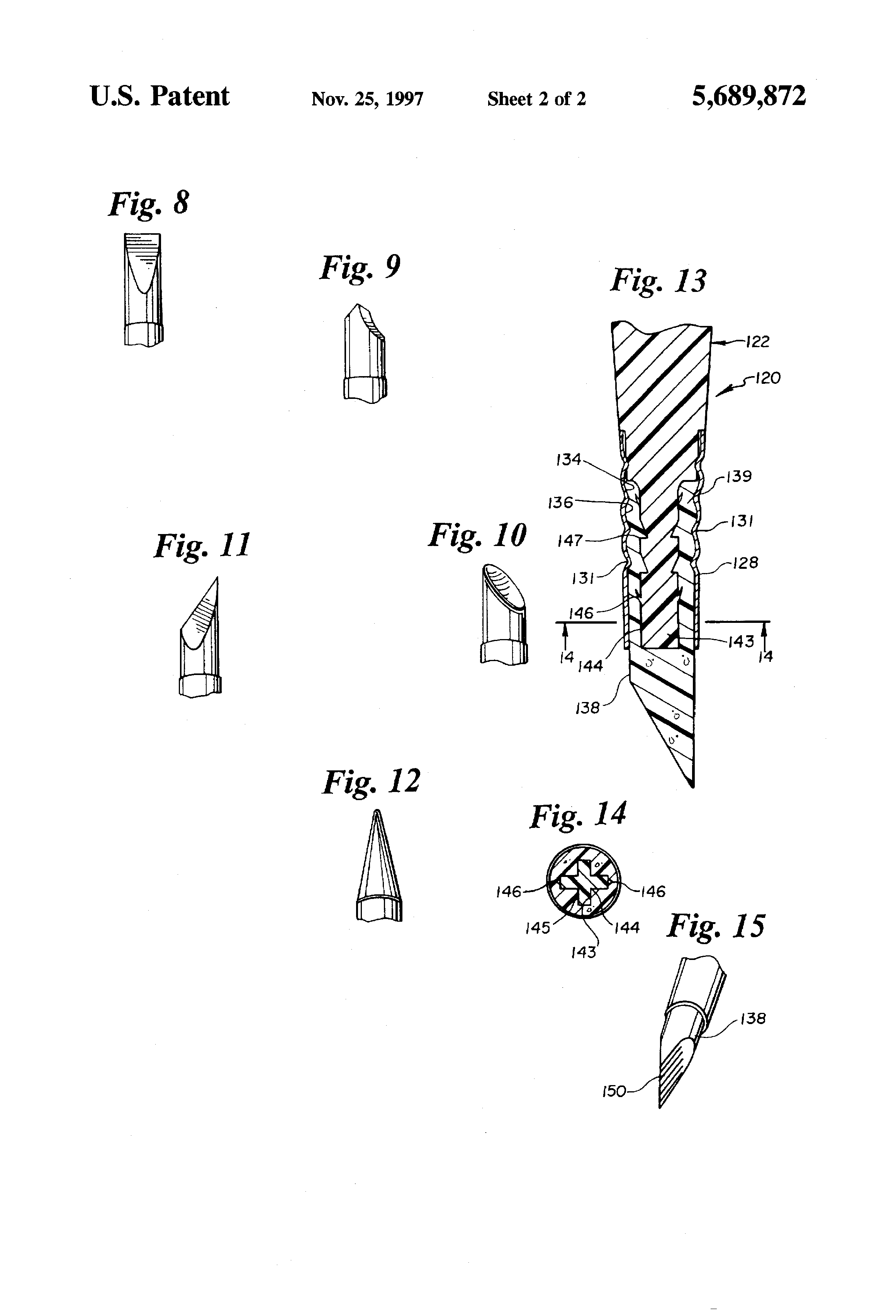 The highly desirable quality of embodiment 120 maybe understood when considered as a permanent assembly with multiple redundant attachment systems between the tip 138 to the handle 122. That is, the tip 138 is held firmly in a number of ways. First, it is locked against the inner surface of the ferrule 128 due to outward expansion, thereby preventing both separation or rotation. Second, barbs 146 and elbows 147 also prevent longitudinal movement subsequent to installation of integral insert 144 and contribute to preventing rotation. Third, the ferrule 128 is crimped to both the handle 122 and the tip 138. Finally, flutes 145 inhibit rotation. The only remaining significant limitation of this permanent device is the structural quality of the material forming the tip 138.