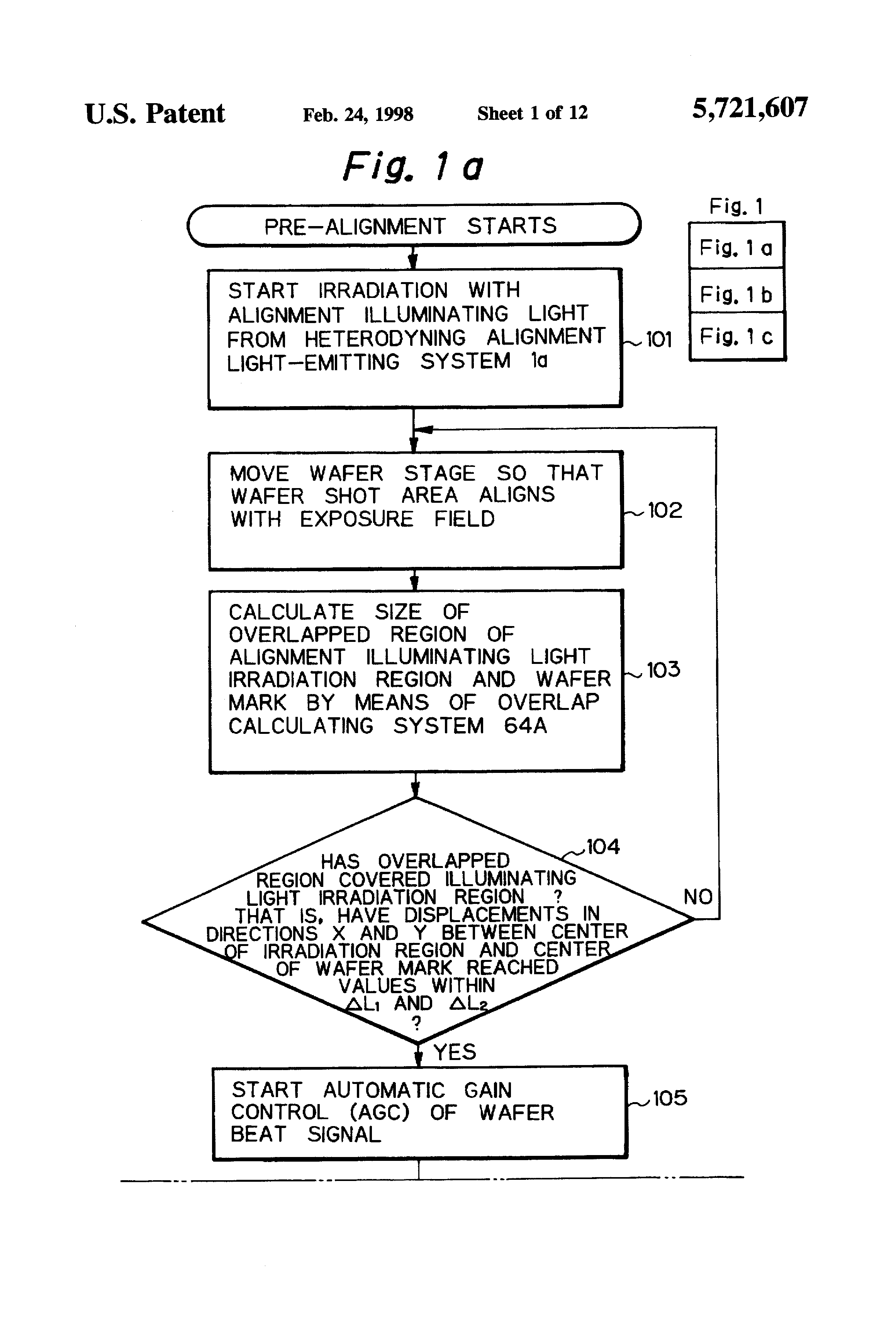 1. Field of the Invention The present invention relates to an alignment method and an alignment apparatus for use in an exposure system which transfers a pattern formed on a mask onto a photosensitive substrate, to effect alignment of the mask and the photosensitive substrate. More particularly, the present invention relates to an alignment method and an alignment apparatus which are suitably applied to a process in which a relative positional relationship between a mask and a photosensitive substrate is detected by heterodyne interferometry. 2. Description of the Related Art In a projection exposure apparatus used to produce semiconductor devices, liquid crystal display devices, etc., the accuracy of registration between a multiplicity of circuit pattern layers formed on a wafer (or a glass plate, etc.) must be maintained at a high level. Therefore, it is desired to align a reticle (or a photomask, etc.) and a wafer with each other with high accuracy, particularly when a pattern formed on the reticle is to be transferred to a second or subsequent layer on the wafer. Accordingly, a projection exposure apparatus is provided with an alignment system (alignment apparatus) for accurately detecting a positional relationship between the reticle and the wafer and for aligning them with each other. There are various types of alignment sensors usable in alignment systems: one of which is an LSA (Laser Step Alignment) type in which a laser beam is irradiated toward an alignment mark (wafer mark) on a wafer, and the position of the wafer mark is detected on the basis of the beam which is diffracted or scattered by the wafer mark; another is an FIA (Field Image Alignment) type in which an image of an alignment mark is taken by illuminating it with light having a wide wave band emitted from a halogen lamp as a light source and the position of the alignment mark is measured by processing the obtained image; yet another is a heterodyne interferometry type in which a diffraction grating-shaped wafer mark on a wafer is irradiated from two directions with laser beams having slightly different frequencies, and the position of the wafer mark is measured on the basis of the phase of two beat signals obtained by photoelectrically converting two diffracted beams (heterodyne beams) generated from the wafer mark. The heterodyne interferometry type is also known as "LIA (Laser Interferometric Alignment) type. Alignment systems can be roughly divided into a TTL (Through-The-Lens) type in which the positional relationship between a reticle and a wafer is measured through a projection optical system, and a TTR (Through-The-Reticle) type in which the positional relationship between a reticle and a wafer is measured through a projection optical system and the reticle. An alignment system of the TTR type is capable of realizing the highest accuracy in theory under existing circumstances. By applying an alignment sensor using a heterodyne interferometry to such an alignment system of a TTR type, an alignment system of extremely high accuracy can be realized (for example, see Japanese Laid-Open Patent Publication No. Hei 2-272305). In this alignment system, alignment is carried out as follows: Let us assume that ± (positive or negative) first-order diffracted beams from diffraction grating-shaped reticle and wafer marks are used, and the grating pitch of the wafer mark in a direction for measurement is PW. If the wafer mark moves by ±PW /4 in the measuring direction relative to the position at which the phase difference between two beat signals obtained from the two marks reaches zero (or a predetermined target value x), the phase difference changes by ±180°. The phase difference between the two beat signals can be detected only in the range of ±180° or in the width range of 360° in theory. Accordingly, if the target phase difference between the two beat signals is assumed to be 0°, it is necessary, in order to carry out accurate alignment by using the heterodyne interferometry, to align the wafer mark for the relevant shot area or region on the wafer with the corresponding reticle mark within the range of ±1/4 pitch by using an extra wafer alignment sensor. Therefore, the conventional practice is to detect the position of the wafer mark by using a known pre-alignment sensor of, for example, the above-described FIA or LSA type, and carry out pre-alignment of the wafer on the basis of the result of detection of the wafer mark position. FIG. 16 is a flowchart showing a conventional alignment process from the start of pre-alignment to an alignment (fine alignment) of heterodyne interferometry type. As shown in FIG. 16, during pre-alignment, a wafer stage with a wafer mounted thereon is stepped at Step 201, and while so doing, the position of a reticle and the position of the wafer are measured by a position measuring system, e.g. laser interferometers, and an amount of relative displacement between the reticle and the wafer is detected by a pre-alignment sensor. Then, it is judged at Step 202 whether or not positioning has been effected so that the amount of displacement is within ±1/4 of the grating pitch PW of the diffraction grating-shaped wafer mark. If the relative displacement between the reticle and the wafer is not within ±1/4 of the grating pitch PW, the wafer stage is further moved. If the relative displacement between the reticle and the wafer is within ±1/4 of the grating pitch PW, the wafer stage is stopped at Step 203. Upon completion of Step 203, the pre-alignment terminates. After the pre-alignment is terminated, fine alignment (final alignment) by an alignment system of heterodyne interferometry type is started. However, before the initiation of the fine alignment, the amplitude of a beat signal (wafer beat signal) obtained from the wafer mark through a variable amplifier is adjusted by automatic gain control (AGC) at Step 204. That is, a semiconductor wafer is produced through many processes su