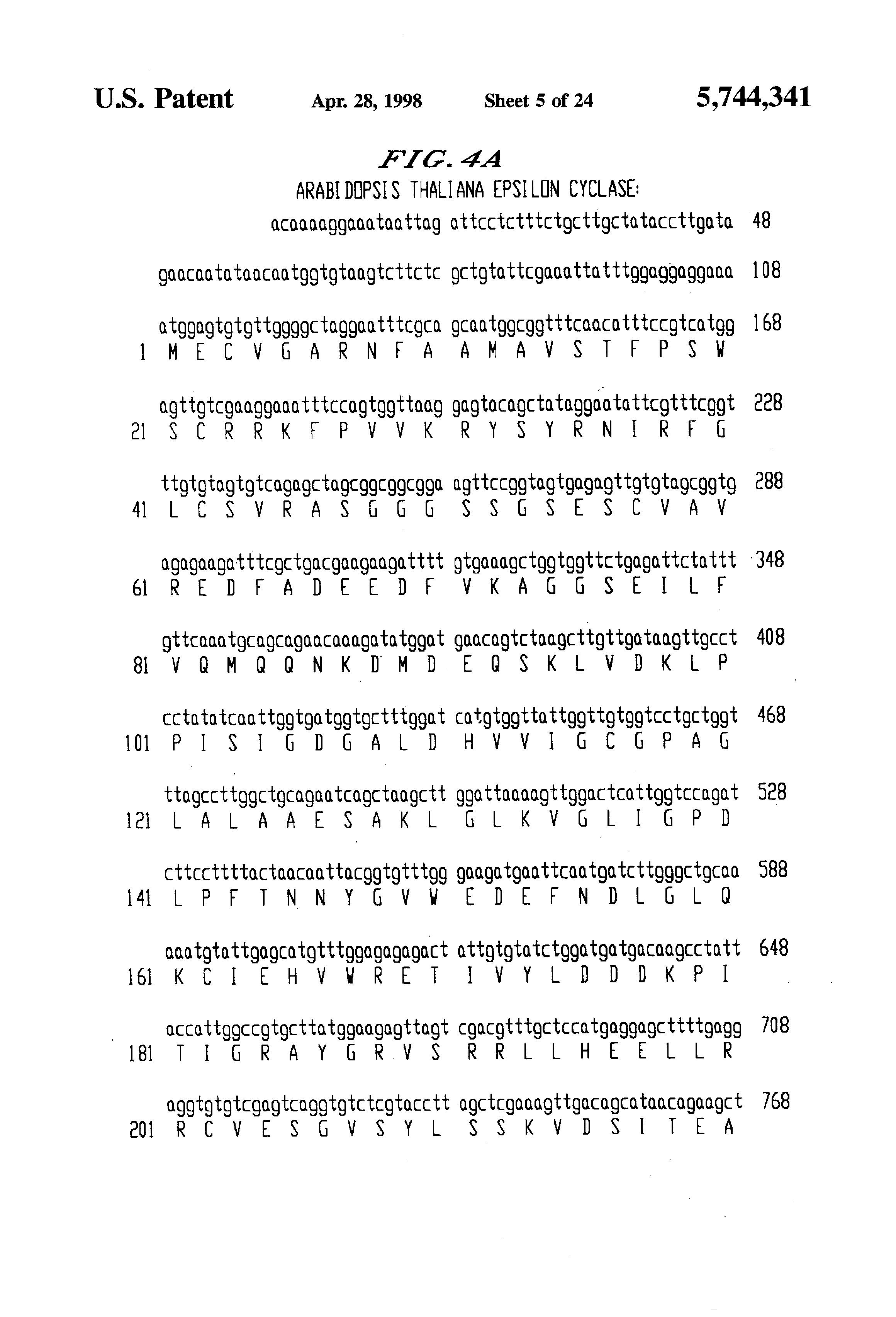 FIG. 4 is a DNA sequence and the predicted amino acid sequence of ε cyclase isolated from A. thaliana (SEQ ID NOS: 1 and 2). These sequences were deposited under Genbank accession number U50738. This cDNA is incorporated into the plasmid pATeps.