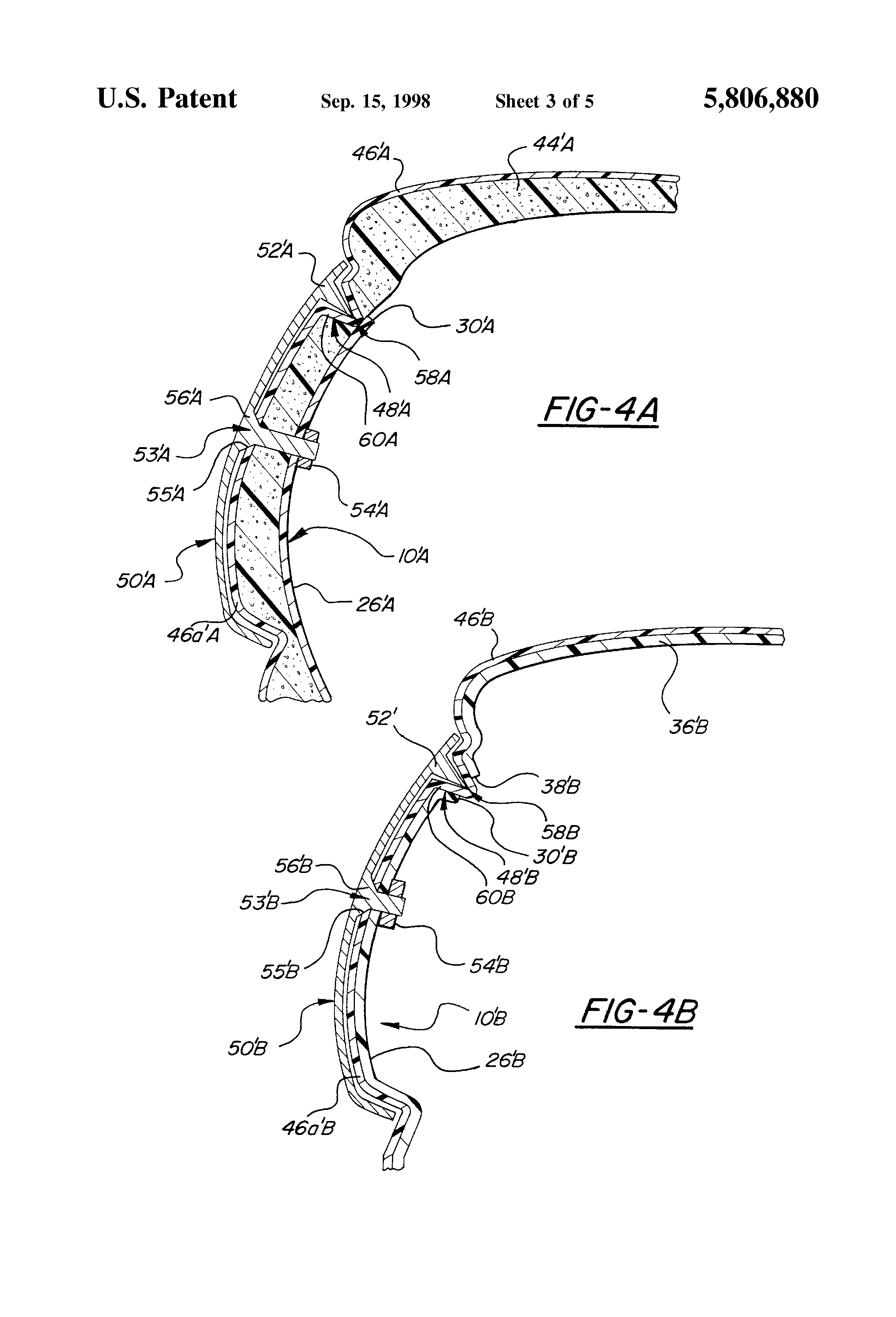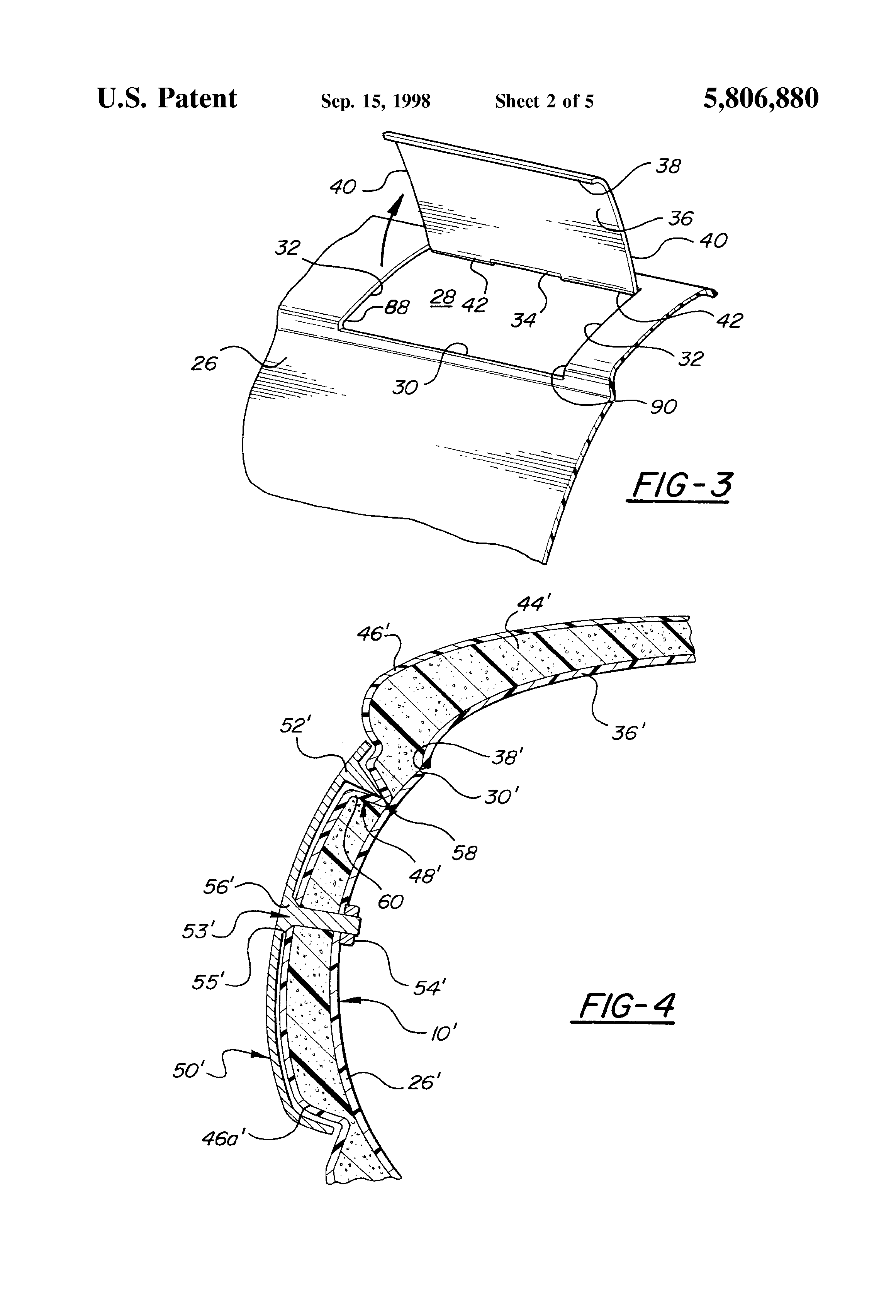 1. In a cover assembly for concealing an automotive vehicle air bag restraint assembly, the restraint assembly including an air bag, an air bag housing and a gas generator located in the housing for supplying gas to the air bag in response to vehicle impact, said cover assembly including: an inner retainer panel that is adapted for securement between the air bag and a vehicle passenger compartment, said retainer panel having an opening defined by forward, side and rear inner edges, an air bag door shaped to fill said retainer panel opening when said door is in a closed position, said door having forward and side outer edges running adjacent and parallel to said respective forward and side inner edges of said retainer panel opening when said door is in said closed position, said door having a hinged rear outer edge pivotally connected adjacent said rear inner edge of said retainer panel opening to allow said door to swing outwardly and away from said closed position when said door is exposed to the air bag when the air bag deploys; an outer skin supported in a layered disposition across an outer surface of said retainer panel and across an outer surface of said air bag door; a weakened tear-seam formed in said outer skin, said weakened tear-seam running parallel to and adjacent said forward outer edge of said door; the improvement comprising: a rigid applique supported in a layered disposition over said outer skin and including an edge portion thereon covering said weakened tear-seam for concealing said weakened tear-seam; and a rigid tear edge disposed outside said outer skin and directly over and along said weakened tear-seam. 2. A cover assembly as defined in claim 1, wherein a portion of said tear edge extends into and along said weakened tear-seam. 3. A cover assembly as defined in claim 1, wherein a portion of said tear edge extends completely through said weakened tear-seam. 4. A cover assembly as defined in claim 1, wherein said tear edge is supported on said applique. 5. A cover assembly as defined in claim 4, wherein said applique is supported on said retainer panel. 6. A cover assembly as defined in claim 4, wherein said tear edge projects integrally inwardly toward said weakened tear-seam from an inner surface of said applique. 7. A cover assembly as defined in claim 6, wherein a portion of said tear edge extends into and along said weakened tear-seam. 8. A cover assembly as defined in claim 6, wherein a portion of said tear edge extends completely through said weakened tear-seam. 9. A cover assembly as defined in claim 1, further including an elongated tear bracket supported on said retainer panel, said tear bracket extending parallel to and adjacent said weakened tear-seam, said tear edge supported on said tear bracket. 10. A cover assembly as defined in claim 9, wherein said tear edge projects integrally inwardly toward said weakened tear-seam from along said tear bracket. 11. A cover assembly as defined in claim 10, wherein said tear edge extends into and along said weakened tear-seam. 12. A cover assembly as defined in claim 10 wherein a portion of said tear edge extends completely through said weakened tear-seam. 13. A cover assembly as defined in claim 9, wherein said tear bracket and tear edge are disposed behind said applique. 14. A cover assembly as defined in claim 9, further including a foam layer supported in a layered disposition across an outer surface of said retainer panel and across an outer surface of said air bag door, said outer skin supported in a layered disposition on an outer surface of said foam layer. 15. A cover assembly as defined in claim 14, wherein said foam layer includes a shallow elongated inward recess disposed between said applique and said retainer panel and along and adjacent said weakened tear-seam, said recess shaped to receive said tear bracket in a counter-sunk disposition, said tear bracket disposed along and within said recess with an outer surface of said bracket being generally coplanar with an outer surface of said outer skin. 16. A cover assembly as defined in claim 9, wherein said tear bracket extends between first and second ends, and where said cover assembly includes first and second tear edge side pieces supported on said respective first and second tear bracket ends, said side pieces including respective cutting edges positioned outside said outer skin and aligned along a plane extending perpendicularly outward from along said side outer edges of said air bag door. 17. A cover assembly as defined in claim 1, wherein said weakened tear-seam comprises an inwardly-projecting corrugation and where said tear edge extends into said corrugation. 18. A method for making a cover assembly for concealing an automotive vehicle air bag restraint assembly, the restraint assembly including an air bag, an air bag housing and a gas generator located in the housing for supplying gas to the air bag in response to vehicle impact, the cover assembly including an inner retainer panel that is adapted for securement between the air bag and a vehicle passenger compartment, the retainer panel having an opening defined by forward, side and rear inner edges; an air bag door shaped to fill the retainer panel opening when the door is in a closed position, the door having forward and side outer edges running adjacent and parallel to the respective forward and side inner edges of the retainer panel opening when the door is in the closed position, the door having a hinged rear outer edge pivotally connected adjacent the rear inner edge of the retainer panel opening to allow the door to swing outwardly and away from the closed position when the door is exposed to the air bag when the air bag deploys; an outer skin supported in a layered disposition across an outer surface of the retainer panel and across an outer surface of the air bag door; and a rigid tear edge disposed outside the outer skin; said method including the steps of: forcing the tear edge int