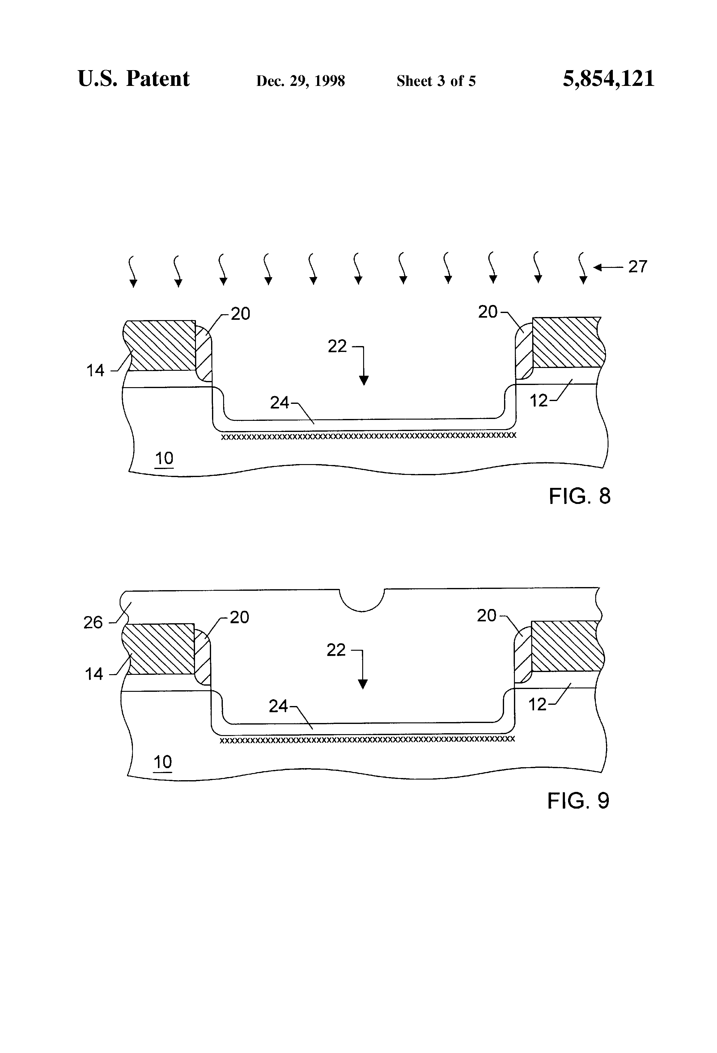 As depicted in FIG. 12a, the semiconductor topography may be concurrently subjected to thermal radiation 29 and to a barrier-entrained gas. This annealing step may be performed using Rapid Thermal Processing ("RTP") which provides for anneal implantations with minimal impurity redistribution. The barrier-entrained gas may contain compounds having barrier atoms. Preferably, the gas contains nitrogen bearing compounds. Thermal radiation 29 may cause the nitrogen atoms to migrate from the gaseous material to regions 28 of substrate 10 disposed directly under spacers 20. Masking layer 14 inhibits nitrogen atoms from passing to other regions of substrate 10. Nitrogen atoms may also migrate into fill oxide 26 and thermally grown oxide 24 and become incorporated near the surface of the trench isolation structure. Spacers 20 are strategically disposed above regions 28 and between masking layer 14 and the trench isolation structure. Since a large portion of spacers 20 have been removed from the sidewalls of masking layer 14, nitrogen atoms may migrate through the relatively thin spacers 20 to regions 28 which are disposed in close proximity to the trench isolation structure.