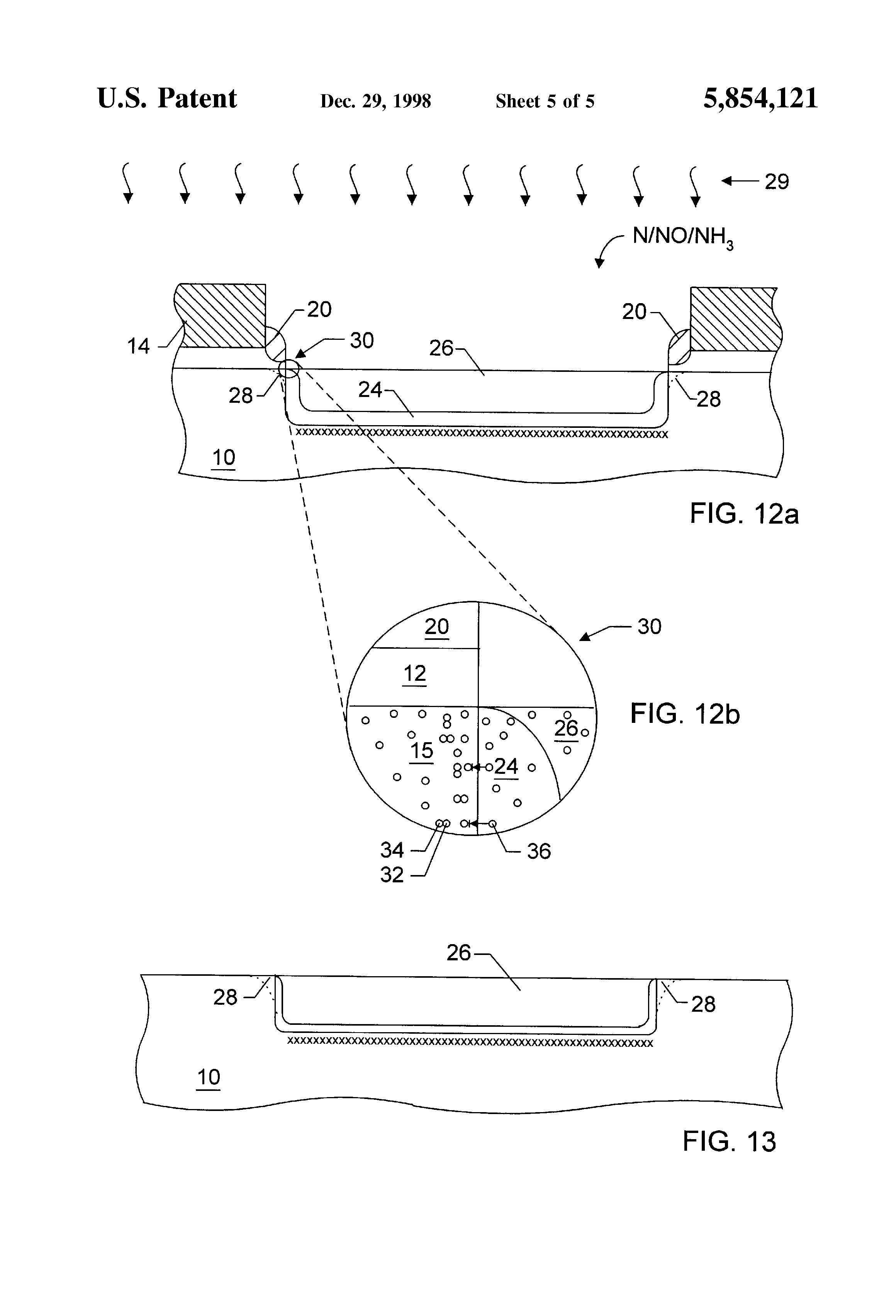 FIG. 12b depicts a detailed view along section 30 of FIG. 12a. Nitrogen atoms 32 migrate mostly through spacer 20 and oxide layer 12 to active region 15 of substrate 10. Active area 15 may form a source and drain region of a transistor in subsequent processing steps. Nitrogen atoms 32 are shown as being incorporated through the corner region of active area 15 in close proximity to the thermal oxide 24/ active area 15 interface. Nitrogen atoms 32 may bond with available silicon atoms 34 near the interface and accumulate at dangling bond sites. Nitrogen atoms 32 may also fill voids and interstitial sites within active area 15. Thus, in subsequent processing when the semiconductor topography is exposed to heat, nitrogen atoms 32 may block or "stuff" migration pathways of oxygen atoms 36 from the isolation structure into active area 15. The nitrogen atoms 32 may also block impurity species in active area 15 from passing to the trench isolation structure. Further, since Si--N bonds are relatively strong, the possibility of species such as charge carriers becoming trapped by dangling bonds is reduced.
