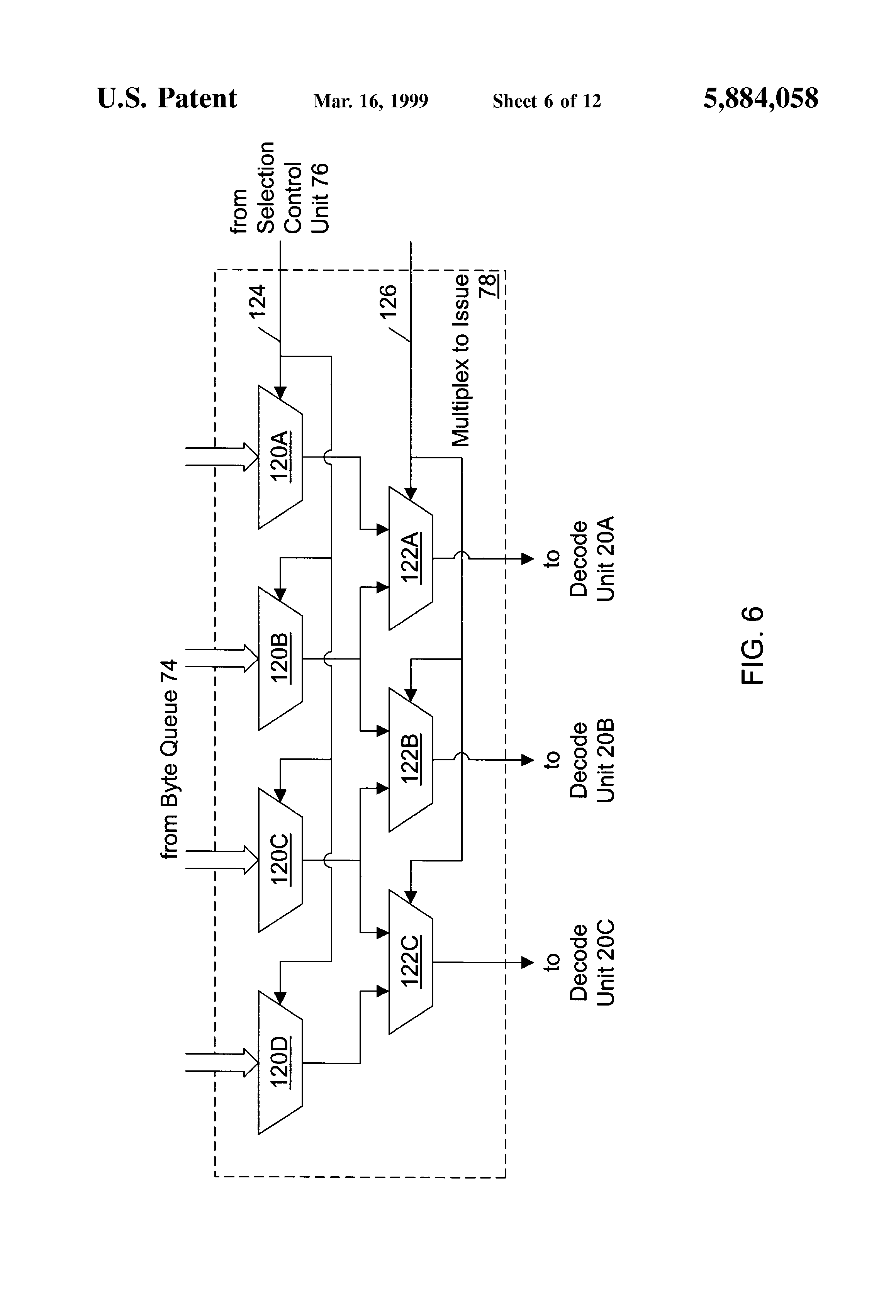 This application is a continuation of application Ser. No. 08/685,656, filed Jul. 24, 1996, now abandoned. 1. Field of the Invention This invention relates to the field of microprocessors and, more particularly, to instruction dispatch mechanisms within microprocessors. 2. Description of the Relevant Art Superscalar microprocessors achieve high performance by executing multiple instructions per clock cycle and by choosing the shortest possible clock cycle consistent with the design. As used herein, the term "clock cycle" refers to an interval of time accorded to various stages of an instruction processing pipeline within the microprocessor. Storage devices (e.g. registers and arrays) capture their values according to the clock cycle. For example, a storage device may capture a value according to a rising or falling edge of a clock signal defining the clock cycle. The storage device then stores the value until the subsequent rising or falling edge of the clock signal, respectively. The term "instruction processing pipeline" is used herein to refer to the logic circuits employed to process instructions in a pipelined fashion. Although the pipeline may be divided into any number of stages at which portions of instruction processing are performed, instruction processing generally comprises fetching the instruction, decoding the instruction, executing the instruction, and storing the execution results in the destination identified by the instruction. Microprocessor designers often design their products in accordance with the x86 microprocessor architecture in order to take advantage of its widespread acceptance in the computer industry. Because the x86 microprocessor architecture is pervasive, many computer programs are written in accordance with the architecture. X86 compatible microprocessors may execute these computer programs, thereby becoming more attractive to computer system designers who desire x86-capable computer systems. Such computer systems are often well received within the industry due to the wide range of available computer programs. The x86 microprocessor architecture specifies a variable length instruction set (i.e. an instruction set in which various instructions employ differing numbers of bytes to specify that instruction). For example, the 80386 and later versions of x86 microprocessors employ between 1 and 15 bytes to specify a particular instruction. Instructions have an opcode, which may be 1-2 bytes, and additional bytes may be added to specify addressing modes, operands, and additional details regarding the instruction to be executed. Certain instructions within the x86 instruction set are quite complex, specifying multiple operations to be performed. For example, the PUSHA instruction specifies that each of the x86 registers be pushed onto a stack defined by the value in the ESP register. The corresponding operations are a store operation for each register, and decrements of the ESP register between each store operation to generate the address for the next store operation. Often, complex instructions are classified as microcode instructions. Microcode instructions are transmitted to a microcode unit within the microprocessor, which decodes the complex microcode instruction and produces two or more simpler instructions for execution by the microprocessor. The simpler instructions corresponding to the microcode instruction are typically stored in a read-only memory (ROM) within the microcode unit. The microcode unit determines an address within the ROM at which the simpler instructions are stored, and transfers the instructions out of the ROM beginning at that address. Multiple clock cycles may be used to transfer the entire set of instructions corresponding to the microcode instruction. Each microcode instruction may correspond to a particular number of simpler instructions dissimilar from the number of simpler instructions corresponding to other microcode instructions. Additionally, the number of simpler instructions corresponding to a particular microcode instruction may vary according to the addressing mode of the instruction, the operand values, and/or the options included with the instruction. The microcode unit issues the simpler instructions into the instruction processing pipeline of the microprocessor. The simpler instructions are thereafter executed in a similar fashion to other instructions. It is noted that the simpler instructions may be instructions defined within the instruction set, or may be custom instructions defined for the particular microprocessor. Conversely, less complex instructions are decoded by hardware decode units within the microprocessor, without intervention by the microcode unit. The term "directly-decoded instruction" will be used herein to refer to instructions which are decoded and executed by the microprocessor without the aid of a microcode unit. As opposed to microcode instructions which are reduced to simpler instructions which may be handled by the microprocessor, directly-decoded instructions are decoded and executed via hardware decode and functional units included within the microprocessor. Unfortunately, having microcode instructions which translate to an arbitrary number of simpler instructions creates numerous problems for dispatching multiple instructions per clock cycle. Because the number of translated instructions is not known at the time of transmitting the microcode instruction to the microcode unit, instructions are typically not concurrently dispatched with the microcode instruction. Instead, the microcode instruction is typically dispatched alone, and subsequent dispatch is typically stalled until the simpler instructions corresponding to the microcode instructions have been dispatched. For cases in which the microcode instruction corresponds to a number of instructions less than the maximum number of instructions which may be dispatched during a clock cycle, dispatch bandwidth (i.e. the number of concurrently