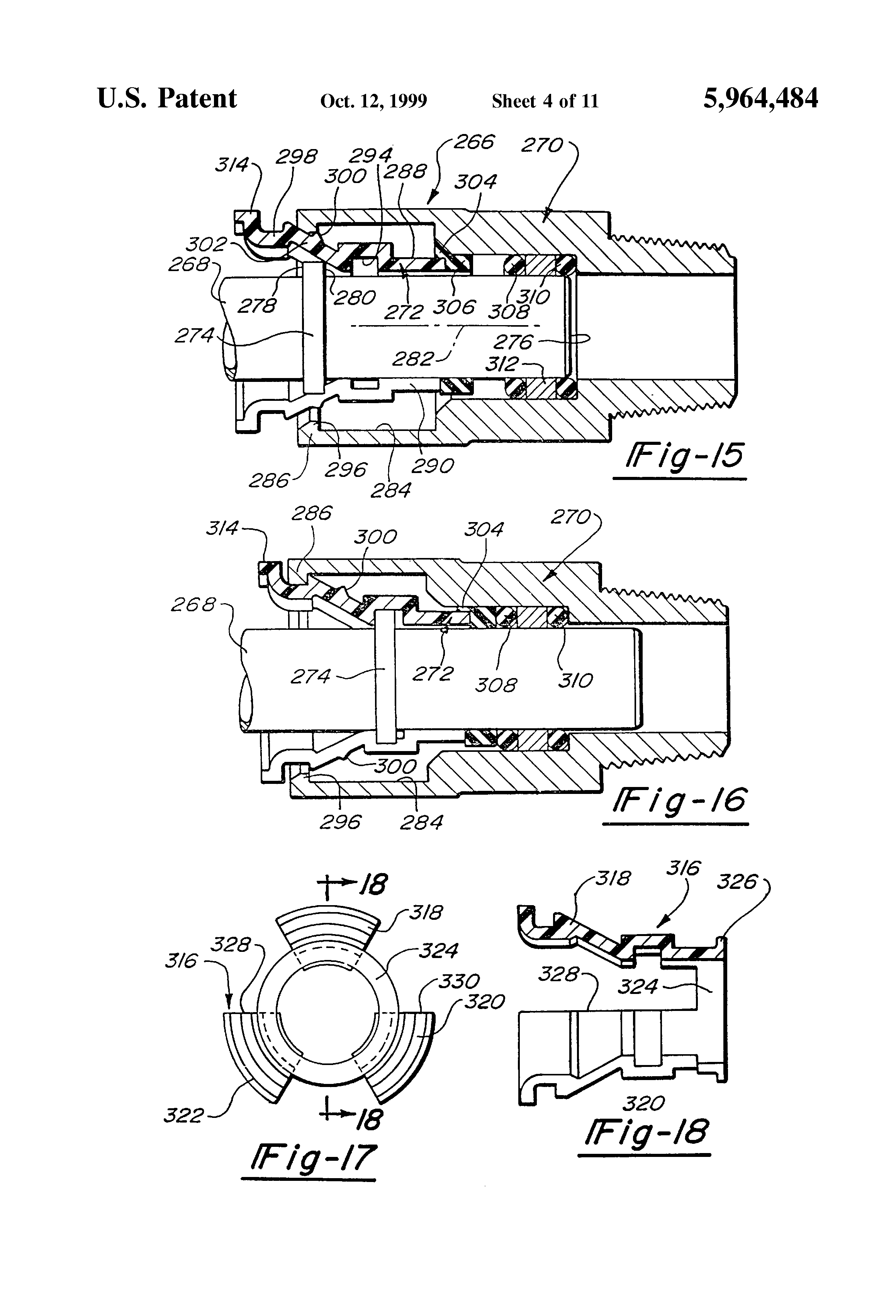 This application is a continuation of U.S. Ser. No. 09/016,817, filed Jan. 30, 1998, which is a divisional of U.S. Ser. No. 08/615,847, filed Mar. 12, 1996, issued on Jul. 21, 1998 as U.S. Pat. No. 5,782,508, which is a divisional of U.S. Ser. No. 08/437,272, filed May 8, 1995, now abandoned, which is a continuation-in-part of U.S. Ser. No. 08/009,009, filed Jan. 26, 1993, issued on May 9, 1995, as U.S. Pat. No. 5,413,387, which is a divisional of U.S. Ser. No. 07/506,449, filed Apr. 6, 1990, now abandoned, which is a continuation of U.S. Ser. No. 07/360,405, filed Jun. 2, 1989, issued on Jun. 26, 1990, as U.S. Pat. No. 4,936,544, which is a divisional of U.S. Ser. No. 07/251,038, filed Sep. 26, 1988, issued on Apr. 10, 1990, as U.S. Pat. No. 4,915,136 which is a continuation of U.S. Ser. No. 07/127,532, filed Dec. 2, 1987, now abandoned, which is a continuation of U.S. Ser. No. 06/748,307, filed Jun. 24, 1985, now abandoned, which is a continuation of U.S. Ser. No. 06/360,201, filed Mar. 22, 1982, issued Jul. 22, 1986 as U.S. Pat. No. 4,601,497, which is a continuation-in-part of U.S. Ser. No. 06/201,711, filed Oct. 29, 1980, issued Jan. 3, 1984 as U.S. Pat. No. 4,423,892, all of which are incorporated herein by reference. 1. Field of the Invention The present invention relates to a connector assembly for providing connection between fluid carrying conduits. More particularly, the present invention relates to a swivelable connector assembly for providing a quick connection between fluid carrying conduits. 2. Description of the Relevant Art In the automotive industry, as well as for many other industries, the need always exists for low-cost, reliable, and easy to assembly components. This need is especially apparent with respect to providing a connection between fluid carrying conduits, such as a fuel or refrigerant lines. In older threaded connectors, substantial assembly time could be accumulated in screwing on a cap to a fitting and tightening the cap down to the proper torque needed to provide for a fluid tight seal. Further, an inventory would have to be maintained to keep track of the number of caps and fittings, and any liners or other components that may be necessary. Also, retightening of the caps may be required to maintain the seal after the automobile or other system has been put in use. Accordingly, it is the primary object of the present invention to provide an improved connector assembly for providing a swivelable quick connection between fluid conveying conduits. In addition, it is an object of the present invention to provide a pre-assembled connector housing and retainer element so that a connection to a tubular fluid conveying conduit may be made in one step without resorting to any tools. Another object of the present invention is to provide a pre-assembled connector housing and retainer element so that a snapping connection may be made to a tubular fluid conveying conduit. Another object of the present invention is to provide a connector assembly that may be employed to join dissimilar electrically conducting materials that would be otherwise subject to galvanic corrosion. It is a further object of the present invention to provide a connector assembly which is adapted to provide for a bleed-down position when disconnecting a conduit from the housing of the connector assembly. It is another object of the present invention to provide a pre-assembled connector conduit unit which requires only a one-step snapping connection to be joined to a connector housing. It is yet another object of the present invention to provide a removable, disposable cover for protecting the pre-assembled connector conduit unit. It is a further object of the present invention to provide a disposable stuffer-plug for the connector assembly which is adapted to install one or more sealing elements in an axial bore of the connector housing and detachably secure a retainer element to the connector housing, as well as to seal the axial bore of the connector housing. It is still a further object of the present invention to provide a connector assembly which employs a check valve unit disposed in the axial bore of the housing for selectively blocking fluid flow. It is also an object of the present invention to provide an improved retainer element which operates to both secure the conduit in the axial bore of the housing and position the sealing element within the axial bore of the housing. It is a more specific object of the present invention to provide an improved retainer element formed with three or more leg members which operate to detachably secure the retainer element to the housing, the sealing means within the housing, the conduit in its operative position within the axial bore of the housing, and provide better resistance to off axis forces on the conduit. To achieve the foregoing objects, the present invention provides a swivelable connector assembly which generally comprises a tubular conduit, a housing, sealing means, and retainer means. The tubular conduit is adapted to convey fluid and is formed with an annular projection disposed a predetermined distance from the end of the conduit to be connected. The housing is formed with an axial bore for receiving the conduit at a first end and for providing a fluid path at a second end, and includes an inwardly extending annular lip (or suitable apertures) at the first end to detachably secure the retainer means to the housing. The sealing means is disposed within the axial bore of the housing for providing a fluid tight seal between confronting portions of the conduit and the housing. The retainer means is adapted to be disposed generally within the axial bore of the housing for cooperating with the annular projection of the conduit to secure the conduit in its operative position within the axial bore of the housing. The retainer means includes three or more circumferentially spaced resilient deformable leg members which extend from an integral co