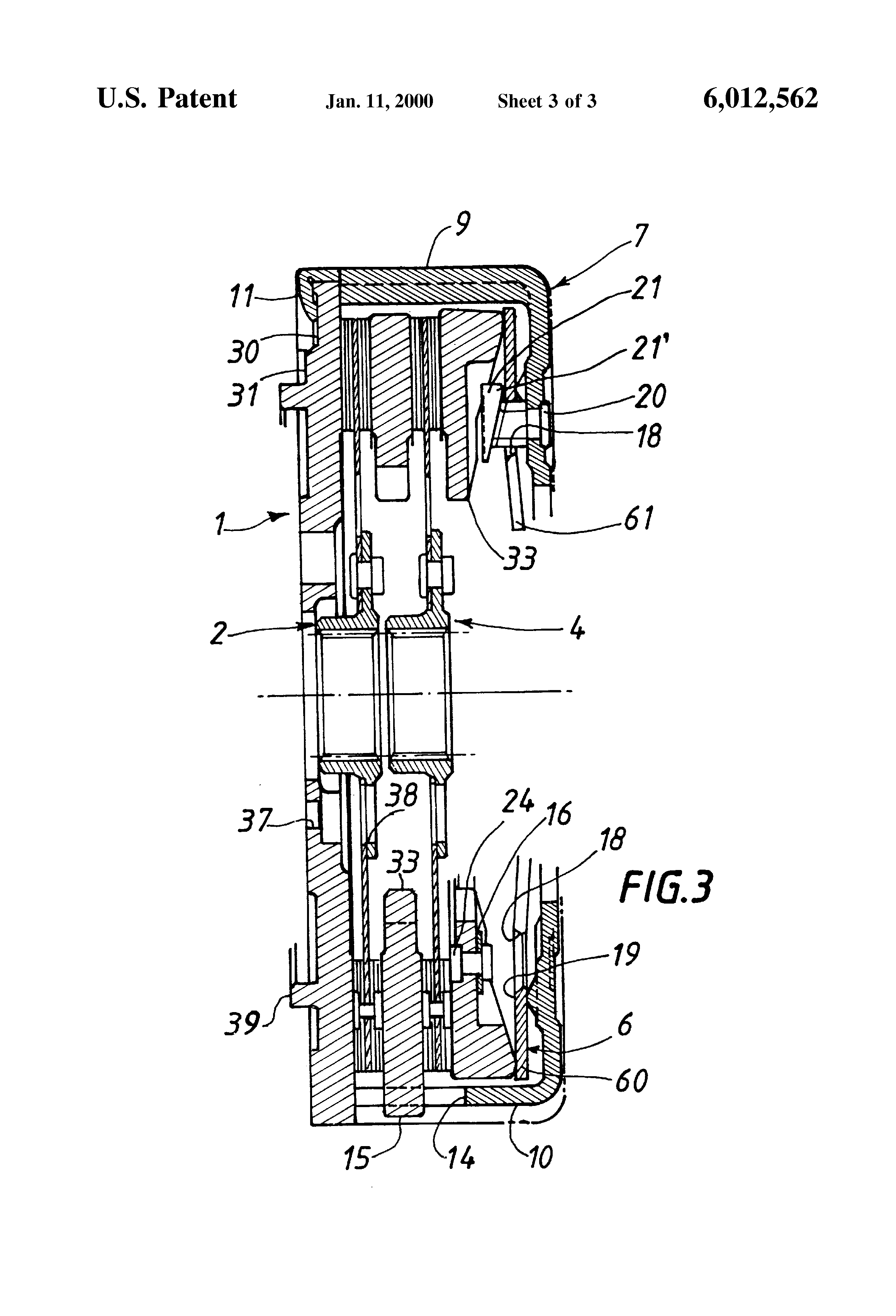 After this, and finally, the friction disc 4 is fitted in contact with the plate 5, after which the lugs 15 of the intermediate plate 3 are inserted into the blind slots 14, following which the friction disc 2 is fitted in contact with the pressure plate 3, while finally, the reaction plate 1 is positioned in contact with the terminal portion of the sectors 10, and the lugs 11 are seamed by upsetting them so as to complete the module.