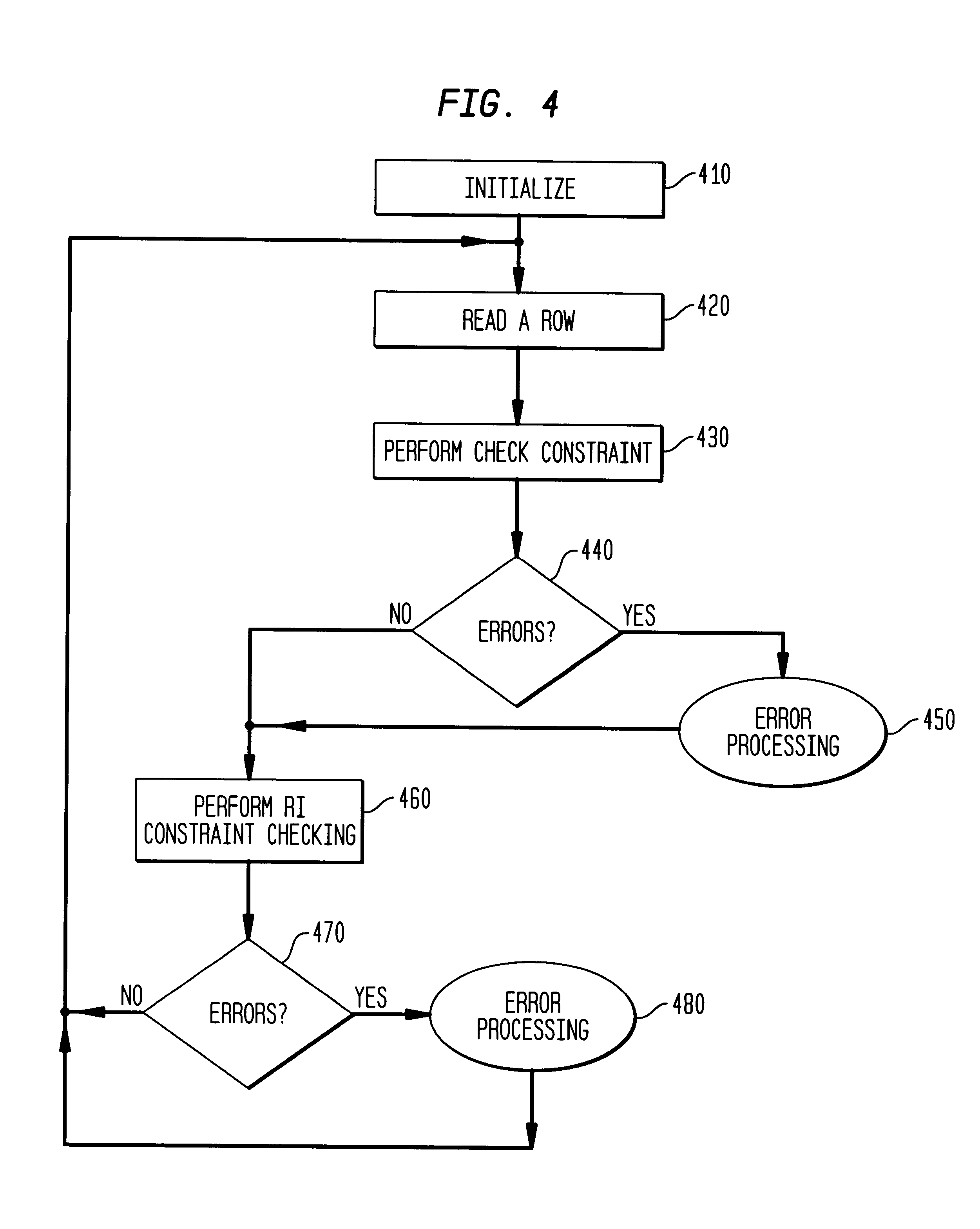 The present invention relates to database management systems, and particularly to a method for repairing constraint violations in a database management system. A well known database software program is DATABASE 2 (DB2) database software distributed by IBM Corporation. As is known in the art, DB2 operates as a subsystem in a computer system operating under the IBM MVS operating system software. In a DB2 environment, user data resides in DB2 tables which are in tablespaces. A tablespace is, for example, a portion of storage space in a direct access storage device (DASD) such as a disk drive. For exemplary purposes, illustrated below is an order_entry table that would be stored in a tablespace. The order_entry table contains columns: customer_number; product_code; order_number; buyer_name; and ship_to_zip. While the above Order_Entry table shows four rows, the table could have millions of rows for all the orders of a company, for example 4 million rows. The order_entry table also has, for example, three index keys and two foreign keys. An index key is an identifier for a particular row of a table while a foreign key also identifies a row but is also used for referential integrity as described below. For example, in the order_entry table, one index key could be based on Order_Number, another index key based on buyer_name and a third index key based on ship_to_zip. As is known in the art, an index key for a particular table indicates a row identification (RID) and a selected value for the row (e.g., the index key value). The index key can be used to generate an index for the table which facilitates subsequent searches for particular data in the table. For example, the Order_Entry table would have three indexes (e.g., one for each index key), each index being stored in an indexspace. Similar to a tablespace, an indexspace is, for example, a designated portion of a DASD. Thus, if a user was looking for rows that contain a particular buyer name in the Order Entry_table, the database management system could query the buyer index for the table to identify all occurrences of the buyer name without reading the entire table to locate the rows. DB2 administrators analyze performance characteristics for application programs that access a database table in an attempt to find the optimum index structure for fast access to the database table. The values to be used as an index must be carefully selected because each index results in overhead for the database system. For example, each transaction in a database table, such as an add or delete, requires that each index for the table also be updated. Thus, it is desirable that the number of indexes for a table be minimized to enhance the performance of application programs. The values to be used as an index for a database table are selected based on, for example, data accessed most frequently by users of the table, generally on-line transaction users. Index keys generally are not based on foreign keys, as foreign keys are used primarily for validation purposes (e.g., constraint enforcement). As is known in the art, each table in a database may be either a parent table, a child table or both. A child table is related to a parent table via the foreign key value or values contained in columns of the child table. For example, a foreign key value can appear multiple times in a child table (e.g., multiple rows in a child table can have the same foreign key, such as the customer_number and product_code entries in the order_entry table) but each foreign key must be associated with a unique key in a parent table of the child table. Referential integrity ensures that every foreign key value is valid (e.g., has a corresponding primary key in a parent table). Thus, referential integrity (RI) means that a value in the column of a row in the table is valid when this value also exists in an index of another table. A row should not be in a table if it violates a constraint. As the order_entry table illustrated above has two foreign keys, it has a RI constraint on customer_number and product_code. As is known in the art, when a user of a DB2 database management system creates a table, the user also defines the constraints for the table (e.g., the user can define the relational integrity criteria). Illustrated below are an exemplary product table and an exemplary customer table (e.g., the parent tables for the foreign keys in the order_entry table). The product table show five rows, although the table could have thousands of rows for all of the different products of a company. The product table has, for example, an index based on the column product_code, which values are illustrated in ascending order. The values in the column product_code are each unique since there is only one product code assigned to each product and thus in this table, a product code would not be included more than once. Accordingly, an index for the product table would include the key value (e.g., the stored value in the product_code column) and a RID. The product table index would reside in a DB2 indexspace. The customer table illustrated below shows four rows, although this table could also have thousands of rows for all of the customers of a company. The customer table has, for example, an index based on the column customer_number, which values are illustrated in ascending order. The values in the column customer_number are each unique since there is only one customer_number assigned to each customer name and thus a customer_number would not be included in this table more than once. Accordingly, an index for the customer table would include the key value (e.g., the value of the column customer_number) and a RID. The customer index would also reside in a DB2 indexspace. As shown by the above tables, all of the rows in the Order_Entry table are valid (e.g., there are no referential integrity constraint violations) because the foreign key values in the column product_code of the Order_Entry table also exis