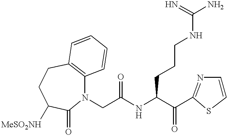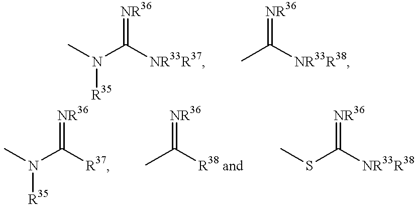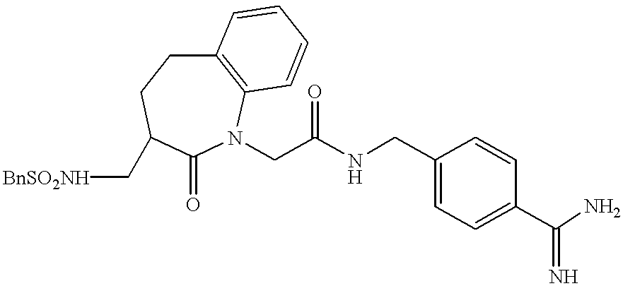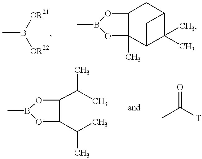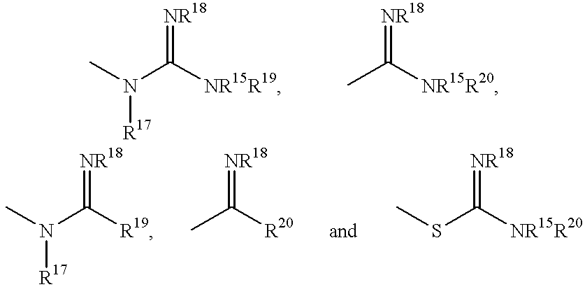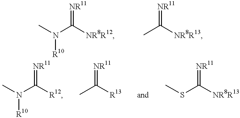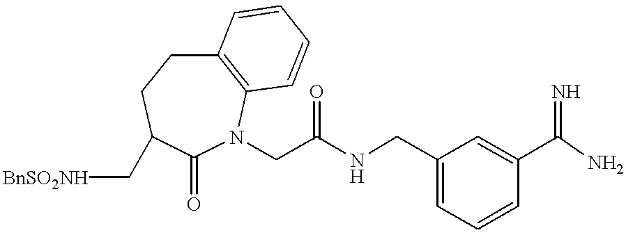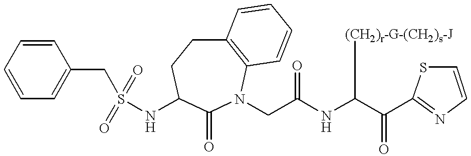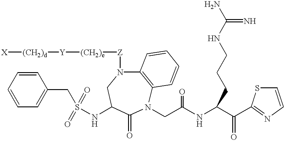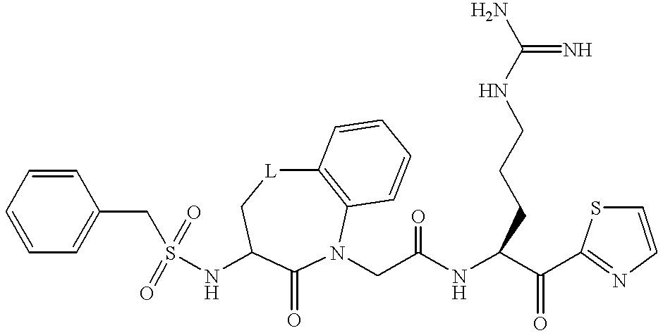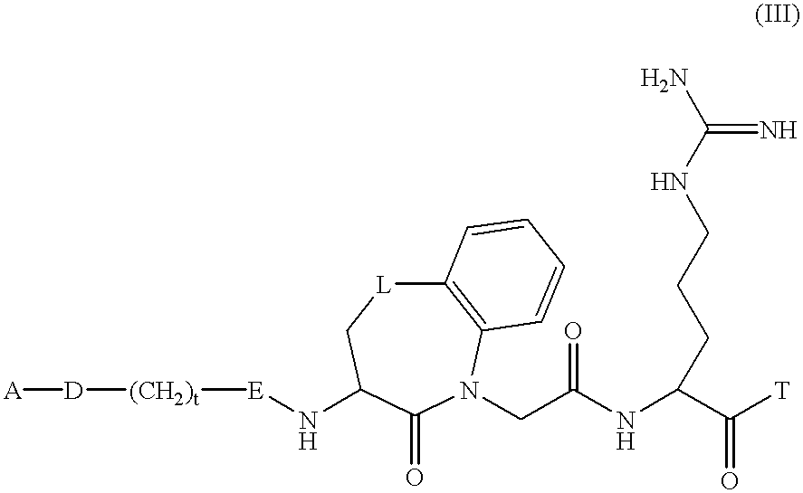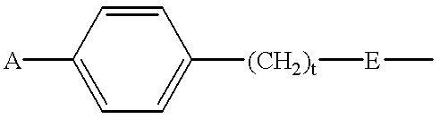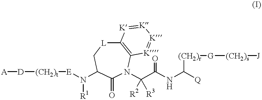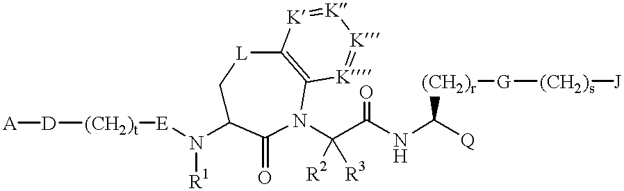 (IV) # A D t E 1 H— 2 —SO2— 2 H3C— 1 —SO2— 3 H— 1 direct link 4 H— 1 —CO— 5 H3C— 2 —NHSO2— 6 H3C— direct link 0 —N(CH3)— SO2— 7 H3C— direct link 0 —SO2— 8 H— 2 —NHCO— 9 CH3CH2— 2 —NHCO— 10 0 —SO2— 11 (CH3)2N— direct link 3 —SO2— 12 H— 0 —SO2— 13 direct link 3 —CO— 14 1 —CO— 15 H— direct link 1 —CO— 16 H— 1 direct link 17 HO— 2 direct link 18 (CH3)3C— 0 —SO2— 19 H— 2 —SO2— 20 H— direct link 0 direct link 21 H— 0 —SO2— (V) # r G s J 1 3 direct link 0 2 3 direct link 0 3 3 direct link 0 4 1 0 5 1 0 6 0 0 —NH2 7 2 0 —H 8 2 0 —CH3 9 3 0 —H 10 0 0 11 4 direct link 0 —NH2 12 0 1 —NH2 (VI) # R1 R2 R3 1 —CH3 —H —H 2 —H —CH3 —H 3 —H 4 —H —H —H (VII) # Q 1 —H 2 3 4 5 6 7 —C(O)H 8 —C(O)—COOH 9 10 11 —C(O)—CF2CF3 12 13 14 15 16 17 (VIII) # K′ K″ K′′′ K′′′′ 1 —CH— —N— —CH— —CH— 2 —C(Cl)— —N— —CH— —CH— (IX) # L 1 —O— 2 —S— 3 —SO— 4 —SO2— (X) # X d Y e Z 4 0 direct link 3 —CO— 5 0 1 direct link 6 0 direct link —CO— 7 0 2 direct link 9 H2N— 0 1 —CO— 10 H— 0 —CH2—C(CH3)2— 0 —O—CO— 11 H— 0 1 —SO2— 12 0 0 —CO— 13 H— 0 0 —SO2— 14 H— 0 0 —SO2— 15 H— 0 2 —NH—SO2— 16 H3C— 0 1 —NH—SO2— 17 H3C— 0 0 —SO2— 18 H3C— 0 0 —SO2— 19 1 1 —CO— 20 H— 0 2 —N(CH3)—SO2— 21 H— 0 2 —N(OH)—CO— 22 H— 0 1 —SO2— (X) # r G s J 1 0 0 2 0 0 Preparation of the Disclosed Compounds