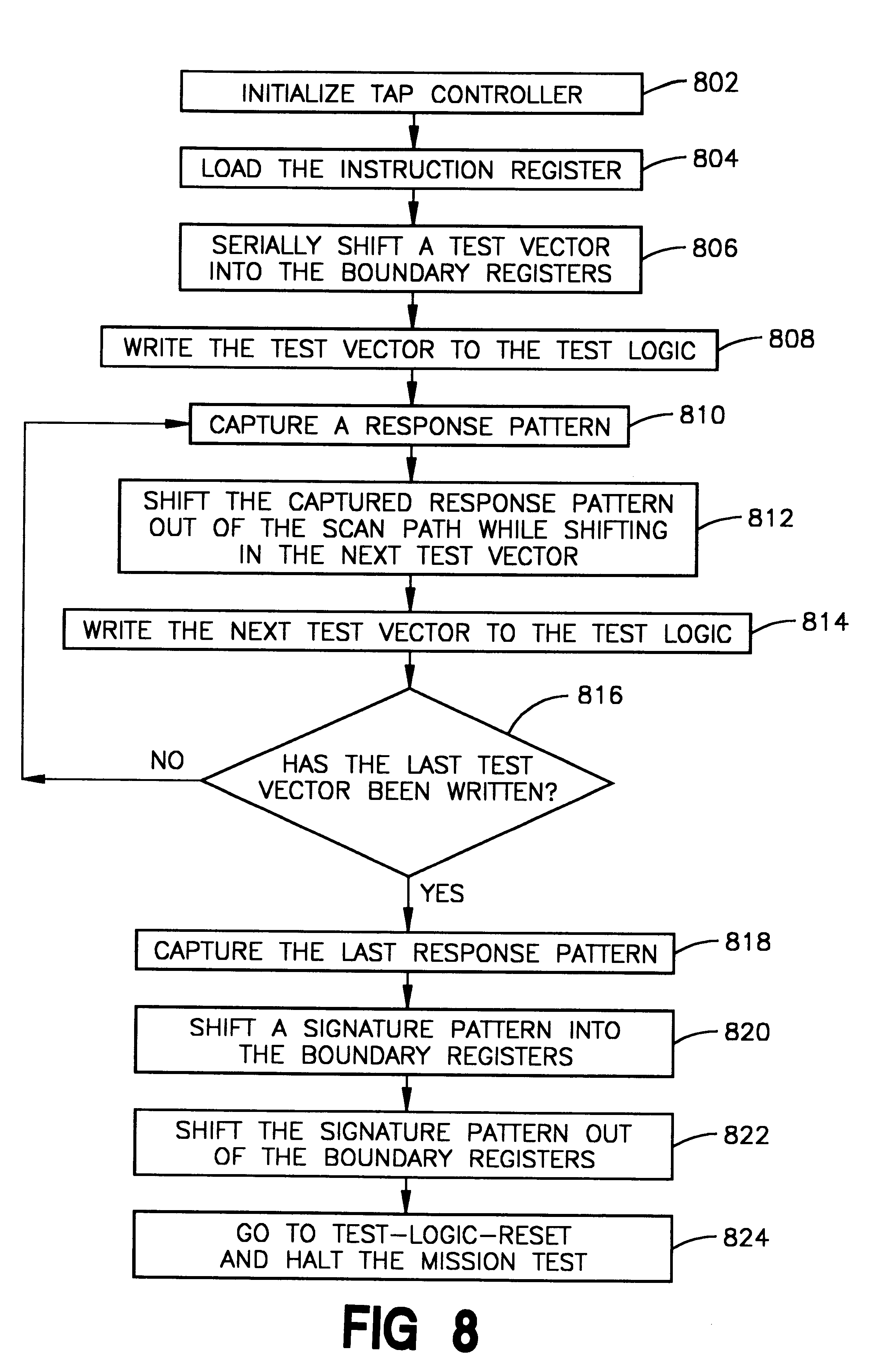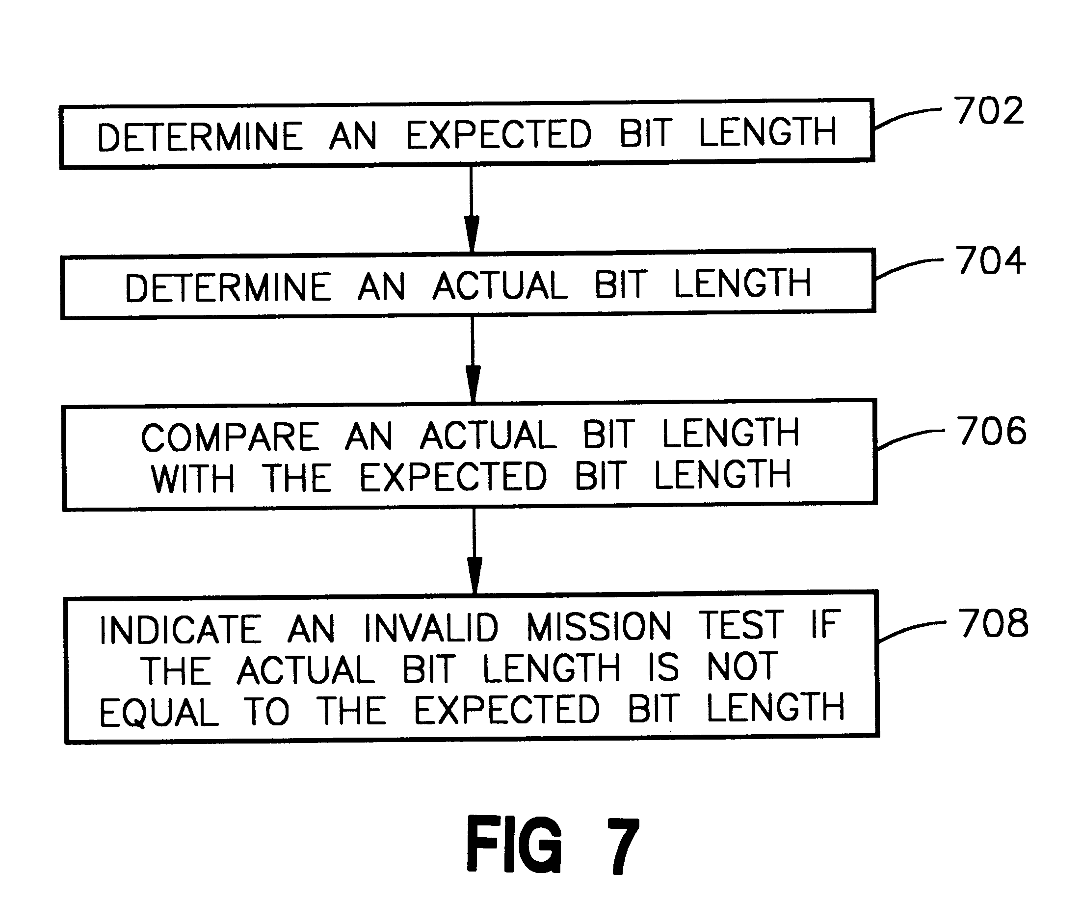 1. Field of the Invention This invention relates to boundary scan testing. More particularly, this invention relates to a post-mission test method for assuring the integrity of the boundary scan test. 2. Background Art Boundary scan is a testing standard formally known as IEEE/ANSI Standard 1149.1-1990. Boundary scan is applied principally at the Integrated Circuit (IC) level. Boundary scan ICs are designed with shift registers or cells place between each device pin and the internal logic of the IC. These cells allow an operator to control and observe what happens at each input and output pin. When these cells are connected together they form a data register chain, called the Boundary Register, defining a scan path. Additional registers within a boundary scan IC include and Instruction Register, which decodes instruction bits that allow the IC to perform various functions; a Bypass Register, which provides a one-bit scan path that minimizes the distance between the scan input and the scan output; an Identification Register, called the IDCODE Register, which identifies the device and manufacturer; and other designer-specified data registers, which typically perform internal test functions. Boundary scan ICs are designed to be linked together into chains. A simple chain includes boundary scan ICs with common test clock terminals (TCK) and test mode select terminals (TMS); and with the scan paths of the ICs linked together by connecting a test data out (TDO) terminal of one IC to the test data in (TDI) terminal of the following IC. For purposes of the following discussion, testing with boundary scan principles and techniques, and boundary scan IC chips and scan paths is referred to as boundary scan testing. A mission test includes a complete single test, such as an interconnect test, a connection test or an interaction test, as well, IC internal logic tests. A test frame refers to a portion of a mission test involving shifting in a test vector, writing the test vector to the test logic, which is part of the testing infrastructure, capturing a test result and shifting out the test results. A more detailed discussion of boundary scan testing is provided in IEEE Standard 1149.1-1990, “IEEE Standard Test Access Port and Boundary Scan Architecture,” IEEE Standards Board; “HP Boundary Scan Tutorial and BSDL Reference Guide,” Hewlett-Packard Company, HP Part Number E1017-90001, 1990; and Kenneth P. Parker, Prior to executing useful mission testing, an operator has to be able to depend upon the chain of register cells being in operational order. Therefore, the basic function of the chain needs to be assured before the results of the mission test can be relied upon. Testing the integrity of the chain prior to executing boundary scan testing is discussed in detail in However, it has been identified by the inventors that it is possible that during execution of a mission test, an operational flaw in the scan path may occur, causing the integrity of the scan path to be compromised. For example, a test induced ground bounce or a timing condition may cause the integrity of the mission test to be compromised after the pre-mission test integrity test has been performed and, more particularly, during mission test execution. If this occurs, the mission test results will be inaccurate. Diagnosing the inaccurate test results will result in invalid or erroneous diagnostic information. If this diagnostic information is relied upon, a significant amount of a technician's time may be wasted in attempting to repair faults that, in reality, do not exist. What it is needed is a method to detect when such an operational flaw occurs so that invalid test results can be discarded. The invention is a method for performing and assuring the integrity of a mission test. The method includes the steps of checking the integrity of the mission test after mission test execution and prior to mission test diagnosis. In particular, after the mission test has been executed, the integrity of the mission test is confirmed based on a scan path bit length comparison. The method in accordance with the invention comprises the steps of performing a mission test on a circuit, determining (after performance of the mission test) an actual bit length of a scan path through the circuit, comparing the actual bit length to an expected bit length and indicating the invalidity of the mission test if the actual bit length is not equal to the expected bit length. The actual bit length of the scan path is determined at the end of mission test execution by shifting a signature pattern through the scan path. Specifically, the signature pattern shifted into the scan path is compared to the signature pattern shifted out. Based on this comparison, the actual bit length of the scan path can be determined. Preferably, the signature pattern is shifted in concurrently with the shifting out of the last test result of the mission test. The length of the scan path can be determined based on the number of clock cycles required to shift the signature pattern through the scan path. This is most readily accomplished by shifting the scan path a number of clock cycles equal to twice the expected length of the scan path. If the signature pattern is equal in length to the scan path, then this will result in the test pattern traveling through the scan path with the last bit exiting the scan path on the last clock cycle. The last n bits out the scan path should then match the n bits of the signature pattern (for an n bit long scan chain). If the bits of the pattern out do not match the bits of the pattern in, then the actual length of the scan path does not match the expected length. The method for testing a circuit board includes the steps of generating a group of mission test vectors, serially shifting each test vector into the scan path, writing each test vector to the test logic, capturing each response pattern, serially shifting each response pattern out of the 