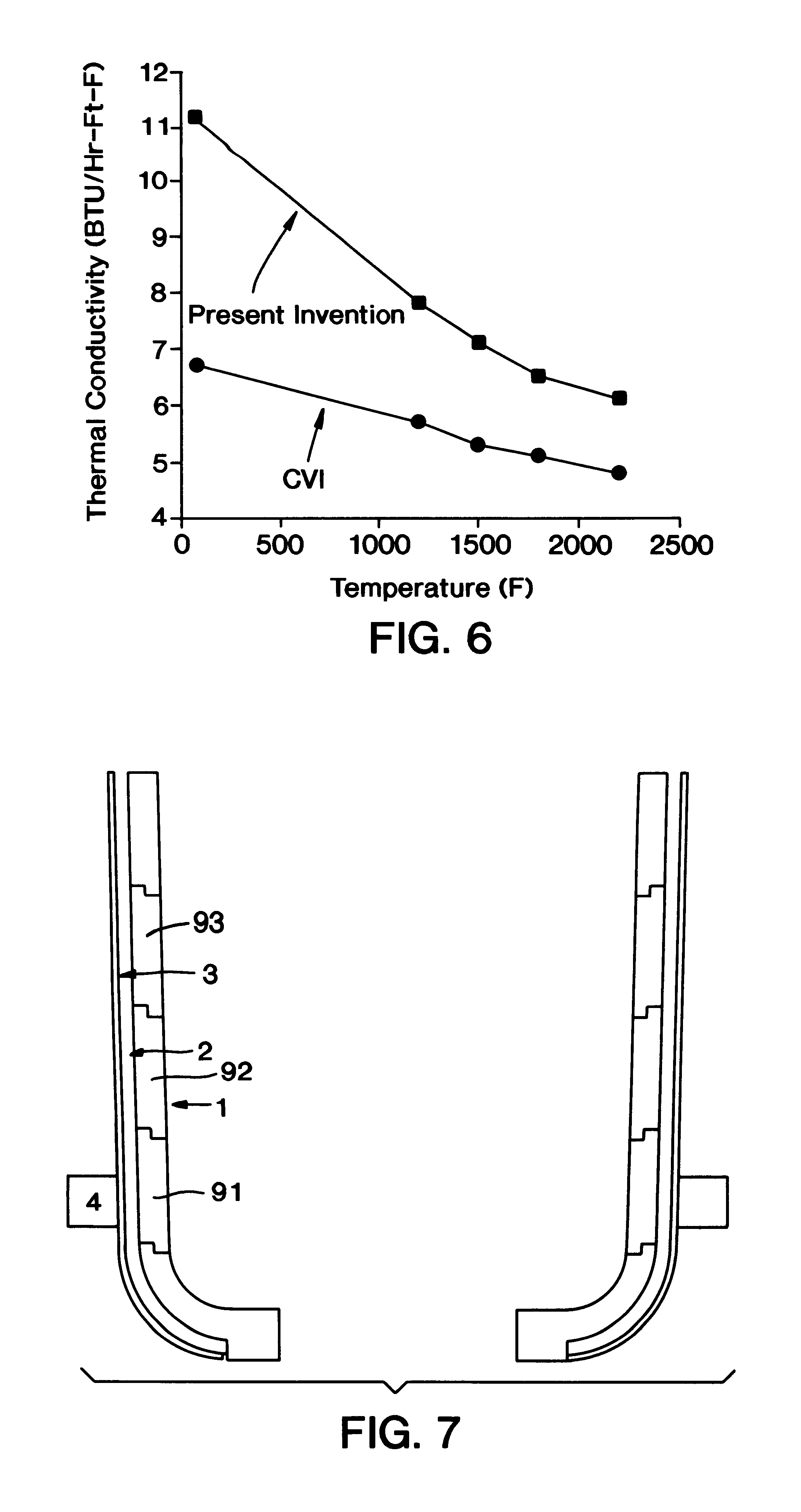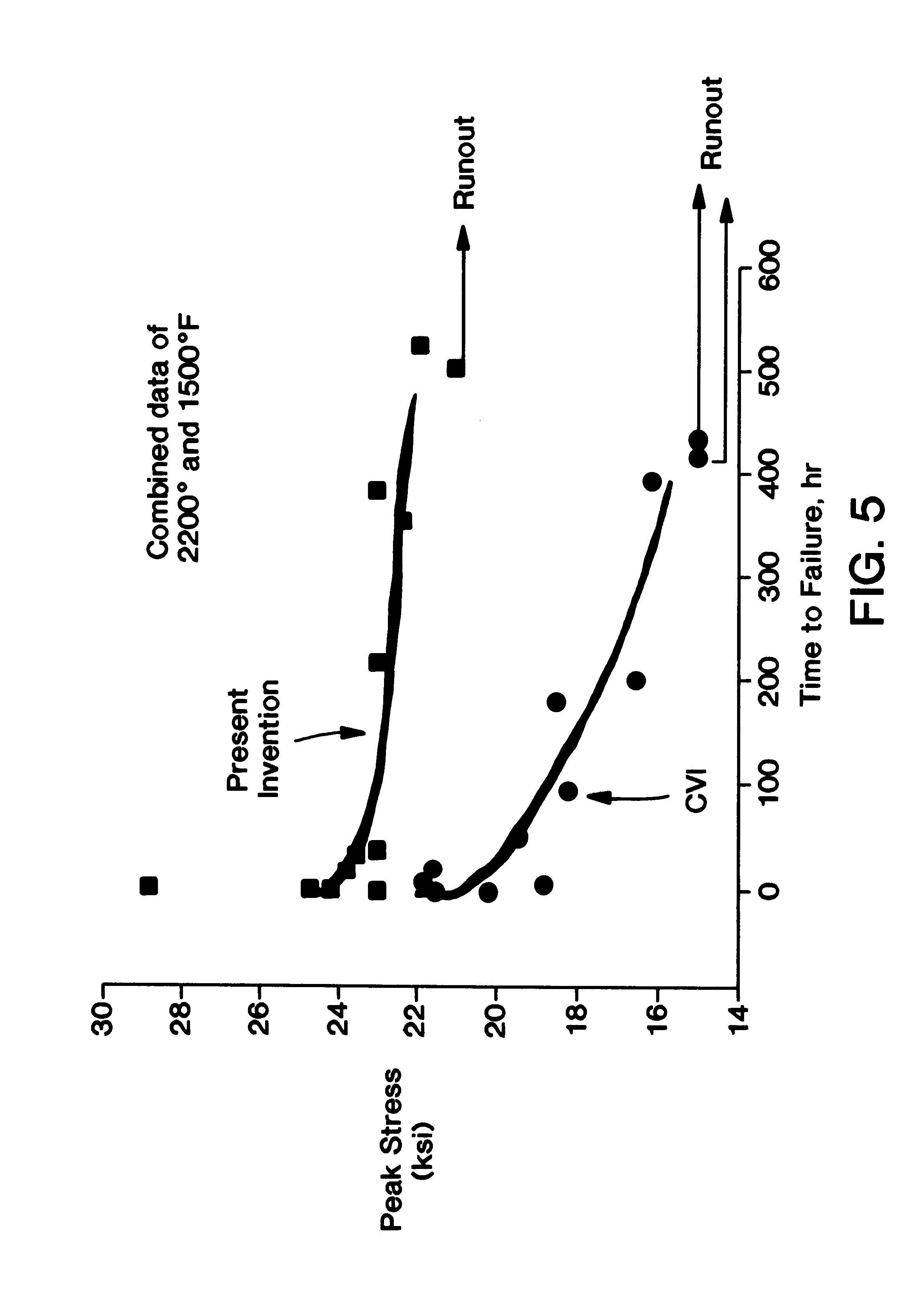 This application is a division of Ser. No. 08/758,715 filed Dec. 2, 1996 U.S. Pat. No. 5,840,221. A portion of the subject matter of this invention was developed under the High Speed Civil Transport/Enabling Propulsion Materials Program, sponsored by NASA through Contract No. NAS3-26385. Reinforced ceramic matrix composites (“CMC's”) are well suited for structural applications because of their toughness, thermal resistance, high temperature strength and chemical stability. These composites can be produced by adding whiskers, fibers or platelets to a ceramic matrix. In the fabrication of continuous fiber reinforced-ceramic matrix composites (“CFCC's”), the fabrication process usually begins by weaving continuous TM fiber tows (e.g., sintered SiC fibers such as Hi-Nicalon or Dow Corning Sylramic™) into a cloth such as 2-dimension 5HS or 8HS, or 3-dimension cloths. The woven fiber cloth is then formed into a panel or shape called a fiber preform. The porosity within the fiber preform is then filled to produce the dense CFCC. The non-brittle nature of the CFCC provides the much needed reliability that is otherwise lacking in monolithic ceramics. The enhanced fracture resistance of ceramic matrix composites is achieved through crack deflection, load transfer, and fiber pull-out. Fiber pullout is achieved by having little or no chemical bonding between the fibers and matrix, so that the fibers are able to slide along the matrix. However, it is also known that many fiber-matrix combinations undergo extensive chemical reaction or interdiffusion between the fiber and matrix materials during densification. Such reaction or interdiffusion can lead to serious degradation in strength, toughness, temperature stability and oxidation resistance. Accordingly, the proper fiber-matrix interface must be selected in order to prevent or minimize chemical reactions and interdiffusion. Surface modification of the fibers is an effective means to control reaction at the fiber-matrix interface. This can be accomplished by coating the fibers with a suitable ceramic. Equally important, a suitable ceramic coating also allows the debonding of the fiber's matrix interface and enables the fiber to pull out from the matrix and slide along the matrix, thus increasing the fracture toughness of the composite. Coated silicon carbide fibers and whiskers are known in. The art of composite materials. U.S. Pat. No. 4,929,472 (“Sugihara”) discloses SiC whiskers having a surface coated with either a carbonaceous layer or a silicon nitride layer. These surface coated whiskers are used as a reinforcing material for ceramics such as SiC, TiC, Si3N4, or Al2O3. U.S. Pat. No. 4,781,993 to Bhatt discloses a SiC fiber reinforced reaction bonded Si3N4matrix wherein the SiC fibers are coated with an amorphous carbon layer and an overlayer having a high silicon/carbon ratio covering the amorphous layer. U.S. Pat. No. 4,642,271 to Rice discloses BN coated ceramic fibers embedded in a ceramic matrix. The fibers may be SiC, Al2O3or graphite, while the matrix may be SiO2, SiC, ZrO2, ZrO2-TiO2, cordierite, mullite, or coated carbon matrices. U.S. Pat. No. 4,944,904 to Singh et al. discloses a composite containing boron nitride coated fibrous material. Carbon or SiC fibers are coated with BN and a silicon-wettable material and then admixed with an infiltration-promoting material. This mixture is formed into a preform which is then infiltrated with a molten solution of boron and silicon to produce the composite. The densification of green CFCC's is more difficult than that of green monolithic ceramics. Conventional sintering of a green ceramic matrix reinforced with sintered fibers is not possible, as the green ceramic matrix has rigid inclusions. Densification of green CFCC's can, however, be achieved by chemical vapor infiltration (“CVI”) or molten silicon infiltration. Molten silicon infiltration is the preferred method because it is less time consuming and more often produces a fully dense body than the CVI process. For high temperature applications, full densification is necessary for good thermal and mechanical properties and for preventing rapid oxidation/degradation of the reinforcements or reinforcement coating. For example, desirable characteristics for CFCC's used in air transport applications include a high thermal conductivity, high tensile strength, high tensile strain and a high cyclic fatigue peak stress. One conventional CFCC fabricated by state-of-the-art chemical vapor infiltration processing has been found to have a thermal conductivity of only about 4.7 BTU/hr.ft.F at 2200° F., and a cyclic fatigue peak stress of only about 15 ksi (about 105 MPa) using a Hi-Nicalon™ fiber. It is believed the low thermal conductivity and cyclic fatigue peak stress of this CVI material is due to the material's relatively high porosity (typically 10-20%) which is common for CVI processes. According, the art has focused upon densification by silicon infiltration. Densification by silicon infiltration has been practiced for monolithic ceramics, such as reaction-bonded silicon carbide, for many years. This process, as described in U.S. Pat. No. 3,205,043 to Taylor, involves infiltrating molten silicon through the pores of a green body containing alpha silicon carbide and carbon. The silicon reacts with the carbon to form beta-SiC, which then bonds the alpha-SiC grains together. The portion of the infiltrated molten silicon which does not react with the carbon solidifies upon cooling, thereby filling the pores of the Sic bonded Sic body. This phenomenon is known as siliconization, and results in a fully dense end product containing SiC and residual free silicon. Since silicon infiltration does not involve shrinkage of the green body (as is the case with conventional sintering), the final dense product is near net shape. The art has used silicon infiltration to densify fiber-containing ceramic composites as well. U.S. Pat. No. 5,29