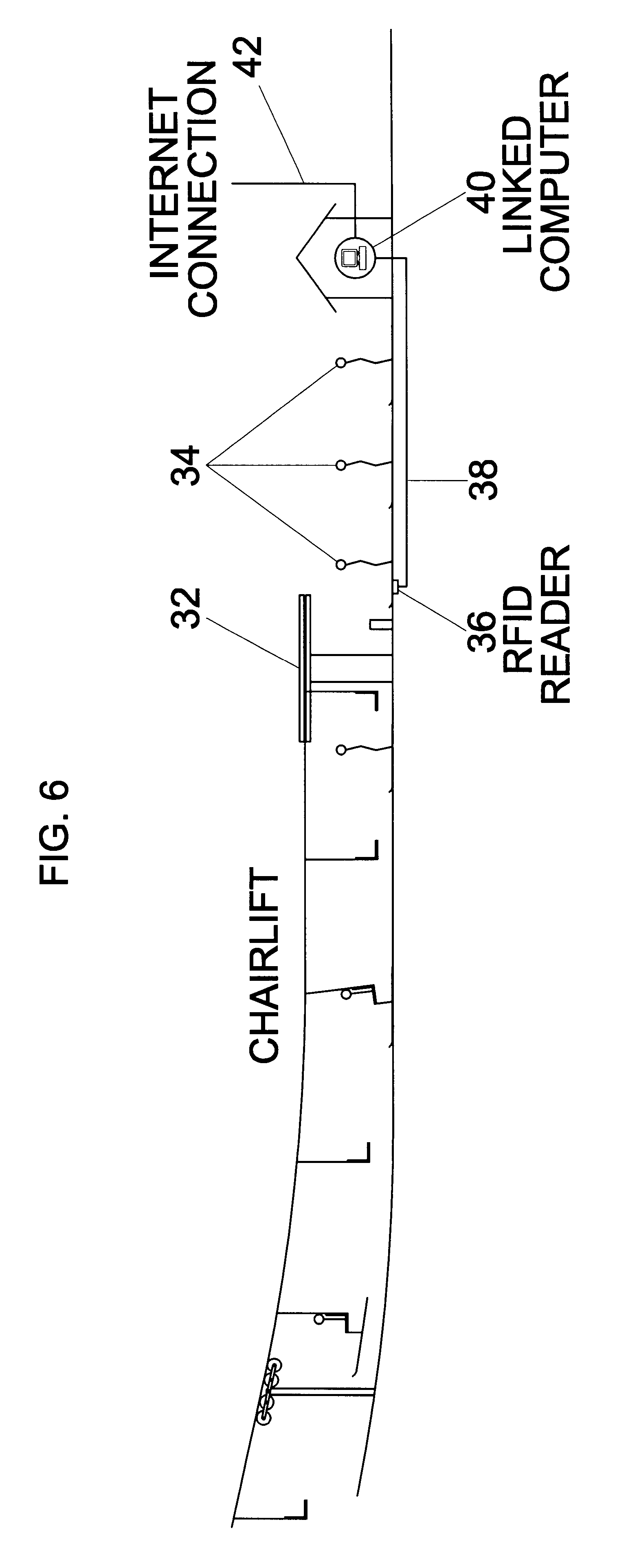 Referring to FIG. 6, there is illustrated in a schematic view, a hill-side component of a ski and snowboard tracking system in accordance with a preferred embodiment of the invention. In the embodiment of FIG. 6, the hill-side component of the tracking system is implemented around a chairlift. However, it will be appreciated by those skilled in the art that the hill-side component of the snowboard and ski tracking system could also be implemented in any location skis and snowboards must pass for the user to use the hill (for example, aT-Bar lift). In FIG. 5, each of the skiers 34, has passed, is passing, or will pass over a RFID interrogator 36 in order to be transported up the hill by a chairlift 32. The RFID interrogator 36 generates a magnetic field that powers the transponder 24 in snowboard 22 or ski 20. The transponder 24 of the snowboard 22 or ski 20 then transmits the identification number 28 stored thereon back to the RFID interrogator 36. The RFID interrogator 36 is linked via an electronic connection 38 to a hill-side computer 40, which receives the identification numbers 28 read from the snowboards 22 and skis 20. The identification numbers 28 can then be compared with identification numbers stored off site via an Internet connection 42. It will be appreciated by those skilled in the art that while the interrogator 36 of FIG. 6 is shown underneath a position that the skis or snowboards must traverse in order for the user to use the chairlift, the RFID interrogator 36 may also operate at a considerable distance from the skier. For example, the RFID interrogator 36 could be mounted above ground while still permitting operation of the invention.