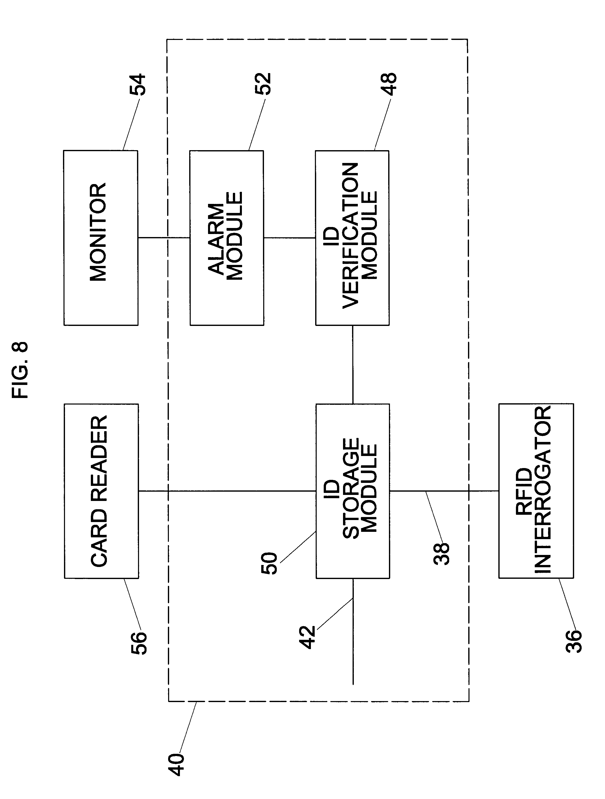 Referring to FIG. 8, the computer 40 is illustrated in a block diagram as configured to implement an embodiment of the invention. The computer 40 includes a monitor 54 and is connected to the RFID interrogator 36 via electronic connection 38. The computer 40 is also linked to a card reader 56 for reading the identification number 28 from the magnetic strip 30 of a card 26, and to the server 44 via internet connection 42. Configured according to the block diagram of FIG. 8, the computer 40 includes an ID verification module 48, an ID storage module 50 and an alarm module 52. In operation, a list of ID numbers is downloaded from the server 44 via internet connection 42 and is stored in the ID storage module 50. ID numbers 28 read by the RFID interrogator 36 are sent to the computer 40 via electronic connection 38 and are also stored in the ID storage module 50. ID verification module 48 then checks each identification number 28 received from the RFID interrogator 36 against the list of identification numbers downloaded from the server 44. If an identification number 28 received from the RFID interrogator 36 corresponds to an identification number 28 in the list of identification numbers downloaded from the server 44, then the alarm module 52 is activated and an alarm is indicated via the monitor 54.