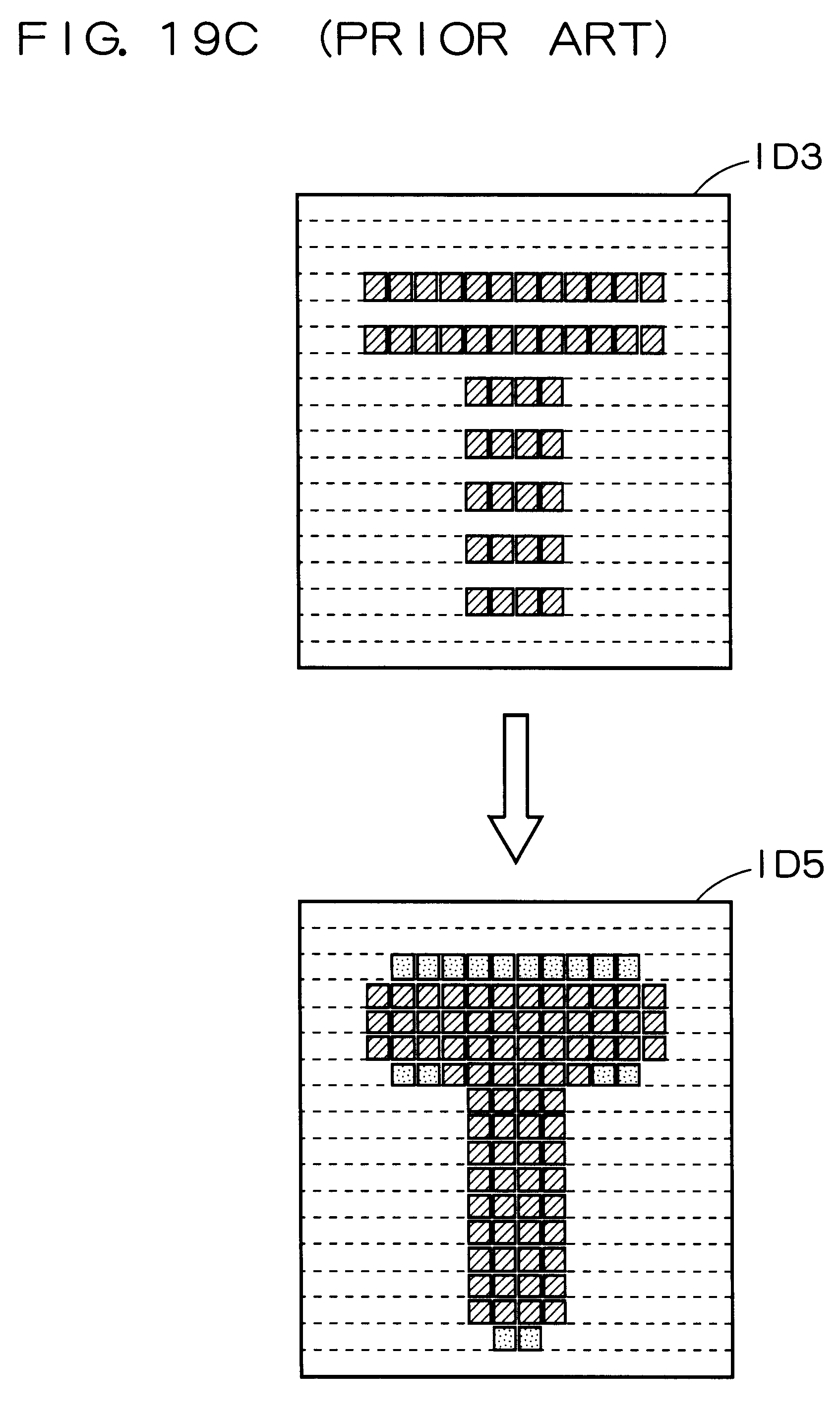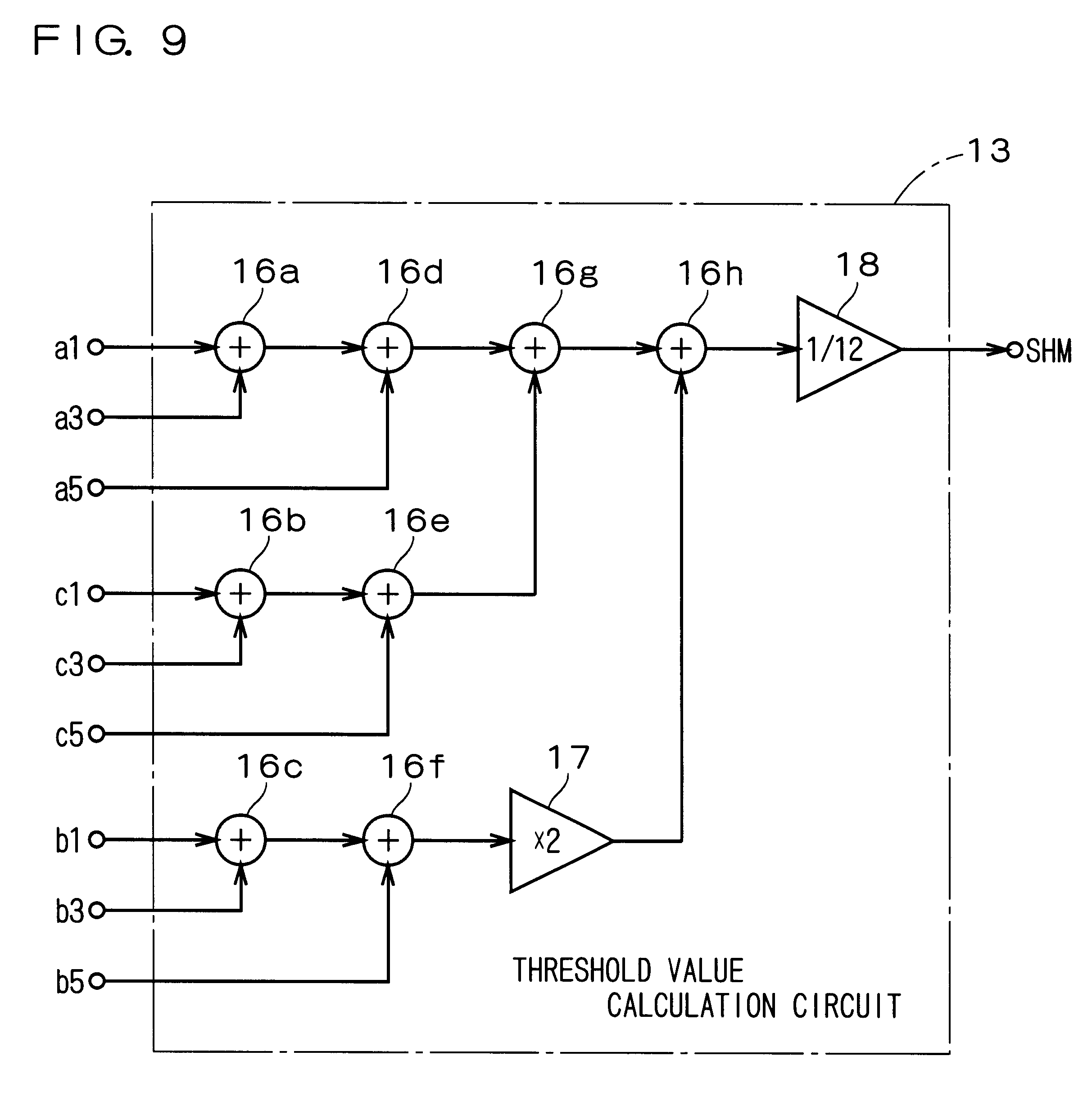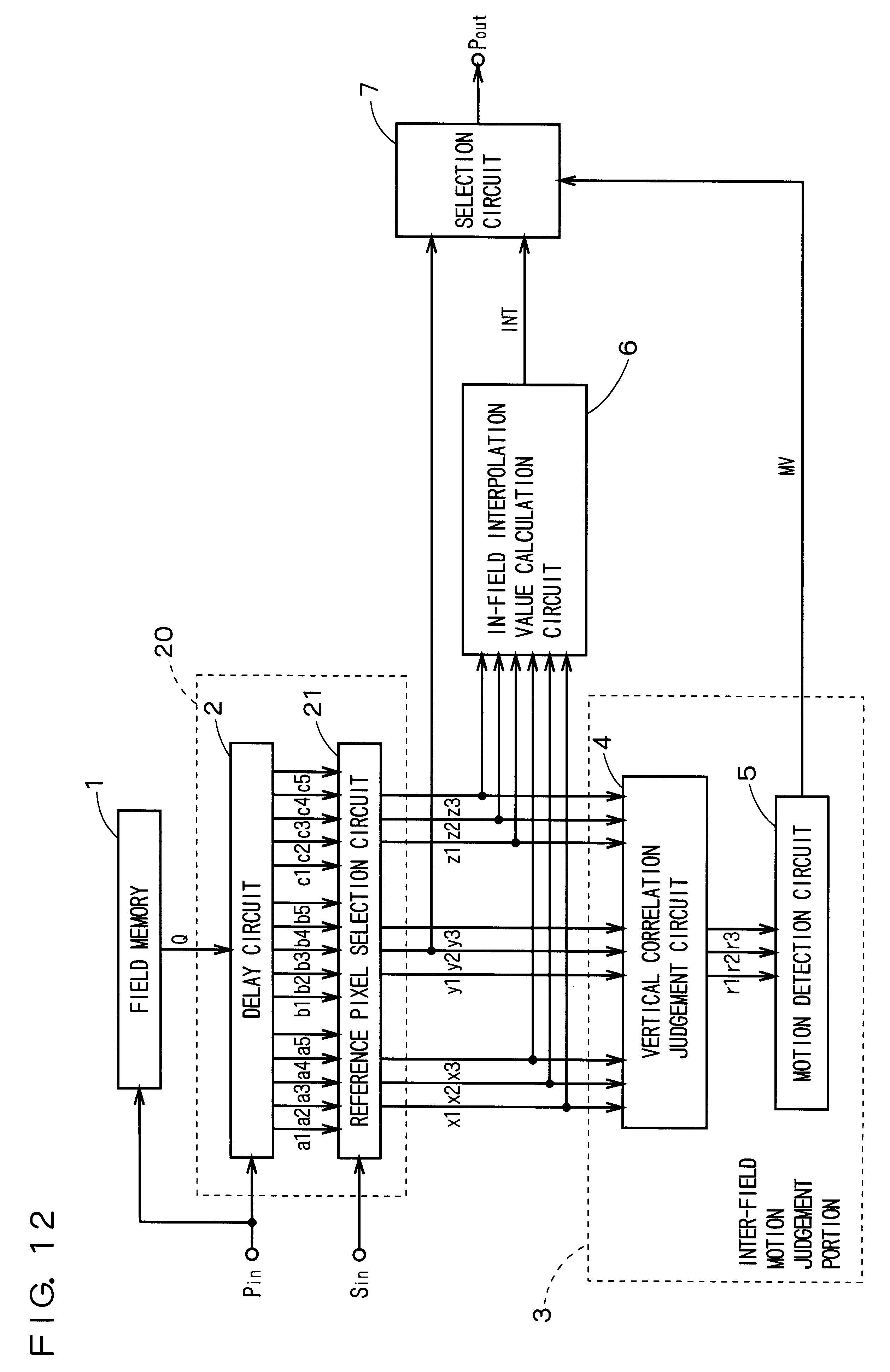 1. Field of the Invention The present invention relates to a scanning line interpolation device. More particularly, the invention relates to a scanning line interpolation device for converting an interlace signal into a non-interlace signal in image signal processing in a non-interlaced scanning CRT, a video printer, a matrix-type display device such as a plasma display, a liquid crystal display, an LED display, a field emission display, and a digital micromirror device, and the like. 2. Description of the Background Art The operation of the device shown in For the interpolation of an uppermost or lowermost scanning line, the reference pixels in a single reference line are directly used for the interpolation or the reference pixels in the reference line which should be present on opposite side from the single reference line are set to “0”. The interpolation table illustrated in The conventional scanning line interpolation device constructed as above described always performs a function as a vertical low pass filter upon the input image, thus deteriorating high-frequency components and providing only an interpolation image with fuzzy horizontal edges. Additionally, as a result of the interpolation of a comer part at which horizontal and vertical edges intersect, the comer part is rounded off since the slant interpolation is selected in accordance with the interpolation table. In particular, the interpolation performed on image data with sharp edges such as the image data of characters and graphics results in conspicuous edge fuzziness and significantly reduced interpolation image qualities. For example, image data “T” (ID1) as shown in A first aspect of the present invention is intended for a scanning line interpolation device for converting an interlace signal into a non-interlace signal. According to the present invention, the scanning line interpolation device comprises: storage means for storing preceding-field image data; reference pixel data extraction means for extracting a plurality of reference pixel data from current-field image data and the preceding-field image data provided from the storage means, the plurality of reference pixel data including pixel data located in an interpolation pixel position which is not present in the current-field image data and in positions surrounding the interpolation pixel position; inter-field motion detection means for detecting whether or not there is a motion of an image between a preceding field and a current field, based on the plurality of reference pixel data; in-field interpolation data calculation means for calculating in-field interpolation data associated with the interpolation pixel position based on pixel data in the current field among the plurality of reference pixel data; and interpolation pixel selection means operative to select the in-field interpolation data when the inter-field motion detection means detects that there is a motion, and to select pixel data in the preceding-field image data which is located in the interpolation pixel position when the inter-field motion detection means detects that there is no motion, thereby to output the selected data as interpolation pixel data of a pixel located in the interpolation pixel position. Preferably, according to a second aspect of the present invention, in the scanning line interpolation device of the first aspect, the plurality of reference pixel data comprise central line pixel data which are pixel data derived from the preceding-field image data and positioned on a central line on which the interpolation pixel position is present, and upper and lower line pixel data which are pixel data derived from the current-field image data and positioned on upper and lower lines lying above and below the central line, and the inter-field motion detection means comprises: vertical correlation data calculation means for calculating vertical correlation data indicative of a vertical line correlation which is a pixel data correlation between the upper line data, the central line data and the lower line data; and motion detection means for detecting whether or not there is a motion of the image based on the vertical correlation data. Preferably, according to a third aspect of the present invention, in the scanning line interpolation device of the first aspect, the inter-field motion detection means comprises: threshold-by-threshold binarization means for weighting each of the plurality of reference pixel data to binarize each of the plurality of reference pixel data using the average value of the plurality of weighted reference pixel data as a threshold value; and motion detection means for comparing the plurality of binarized reference pixel data with a predetermined binary data pattern to detect a motion of the image based on a result of the comparison. Preferably, according to a fourth aspect of the present invention, in the scanning line interpolation device of the first aspect, the plurality of reference pixel data include a first number of reference pixel data, and the reference pixel data extraction means comprises: reference pixel data preliminary extraction means for preliminarily extracting a second number of reference pixel data from the current-field image data and the preceding-field image data provided from the storage means, the second number being greater than the first number of the pixel data located in the interpolation pixel position and in the positions surrounding the interpolation pixel position; and reference pixel data selection means for selecting the first number of reference pixel data to be actually extracted from the second number of reference pixel data. The scanning line interpolation device in accordance with the first aspect of the present invention comprises the interpolation pixel selection means operative to select the in-field interpolation data when the inter-field motion detection means detects that there is a motion, and to select the pixel dat