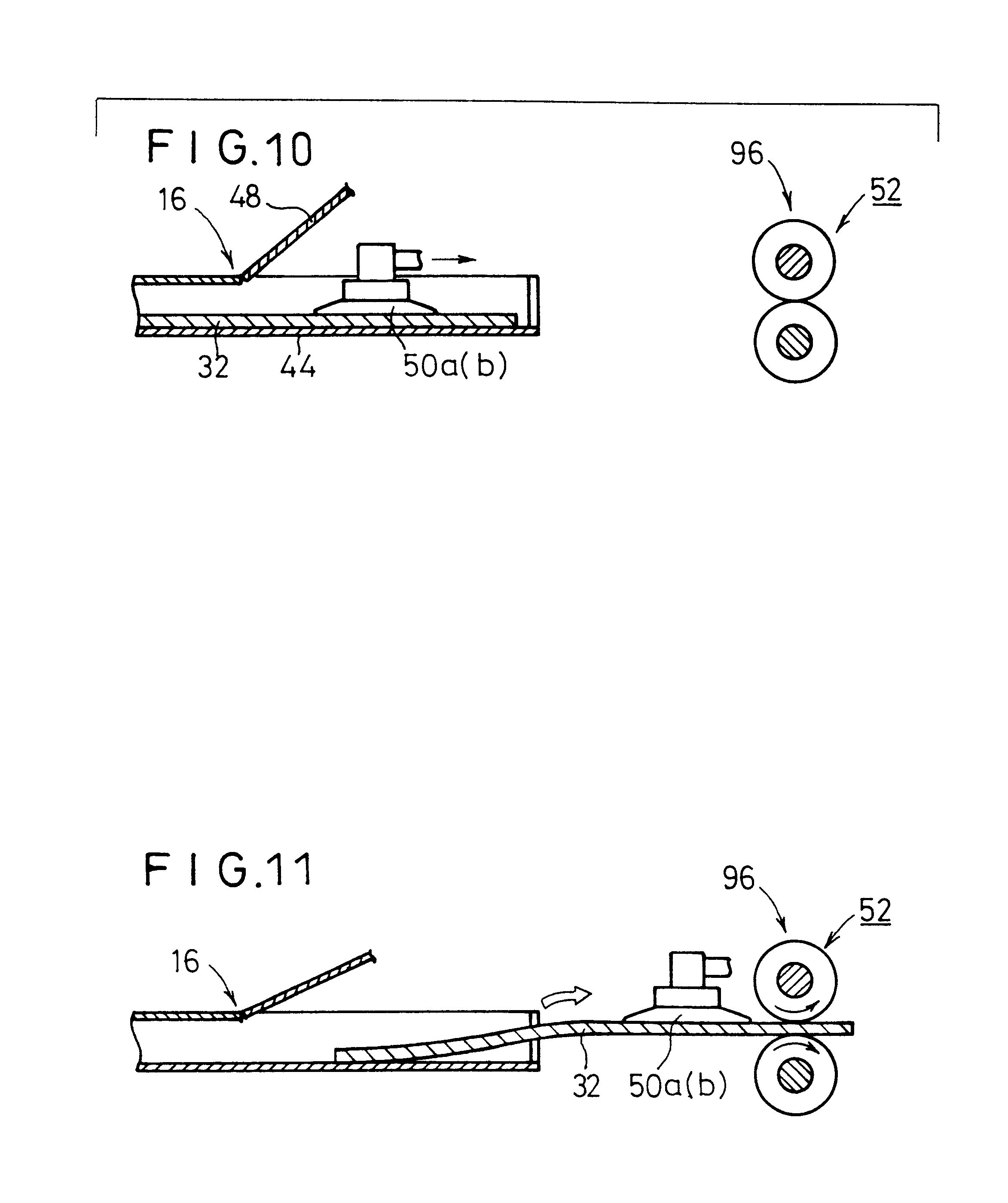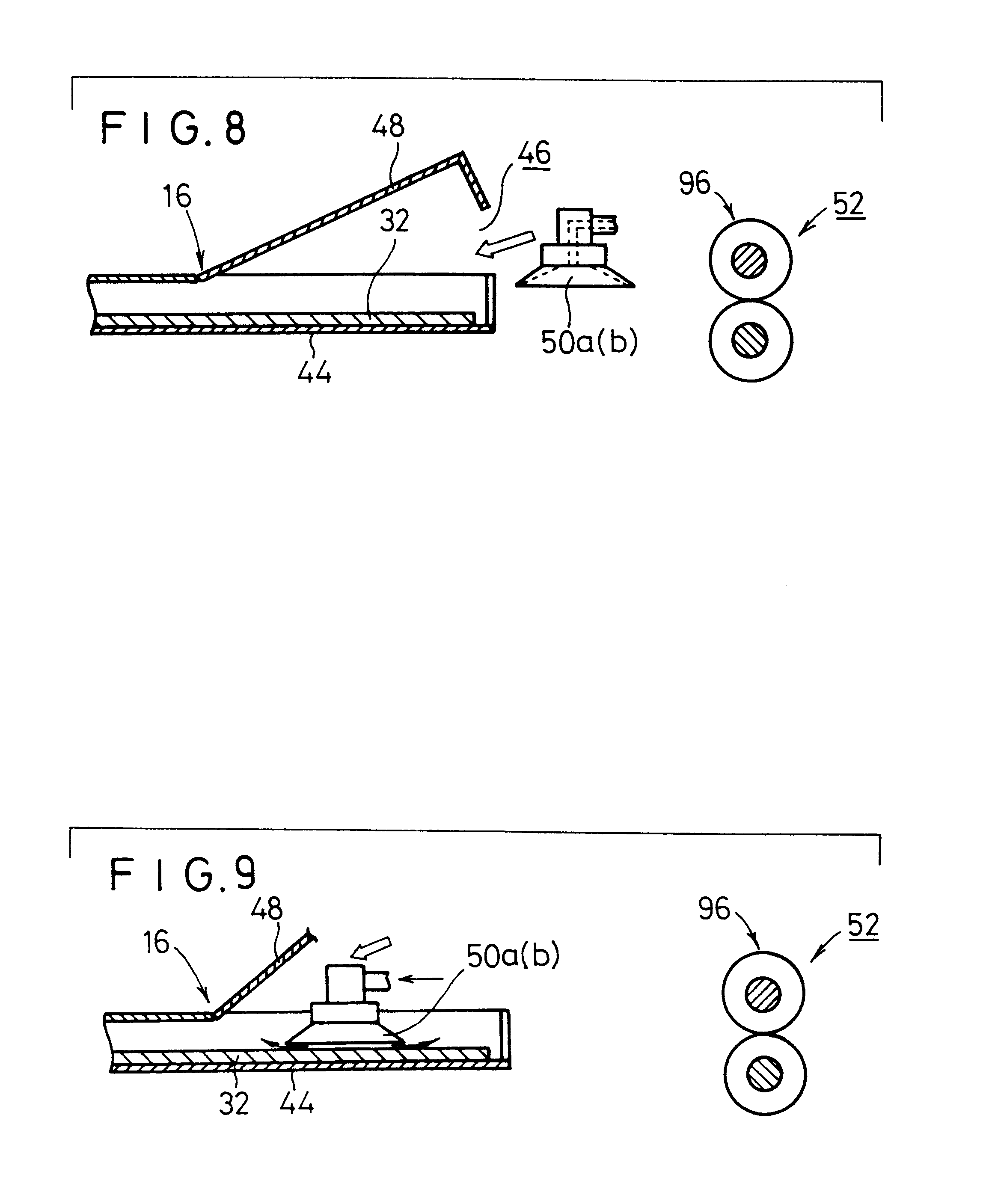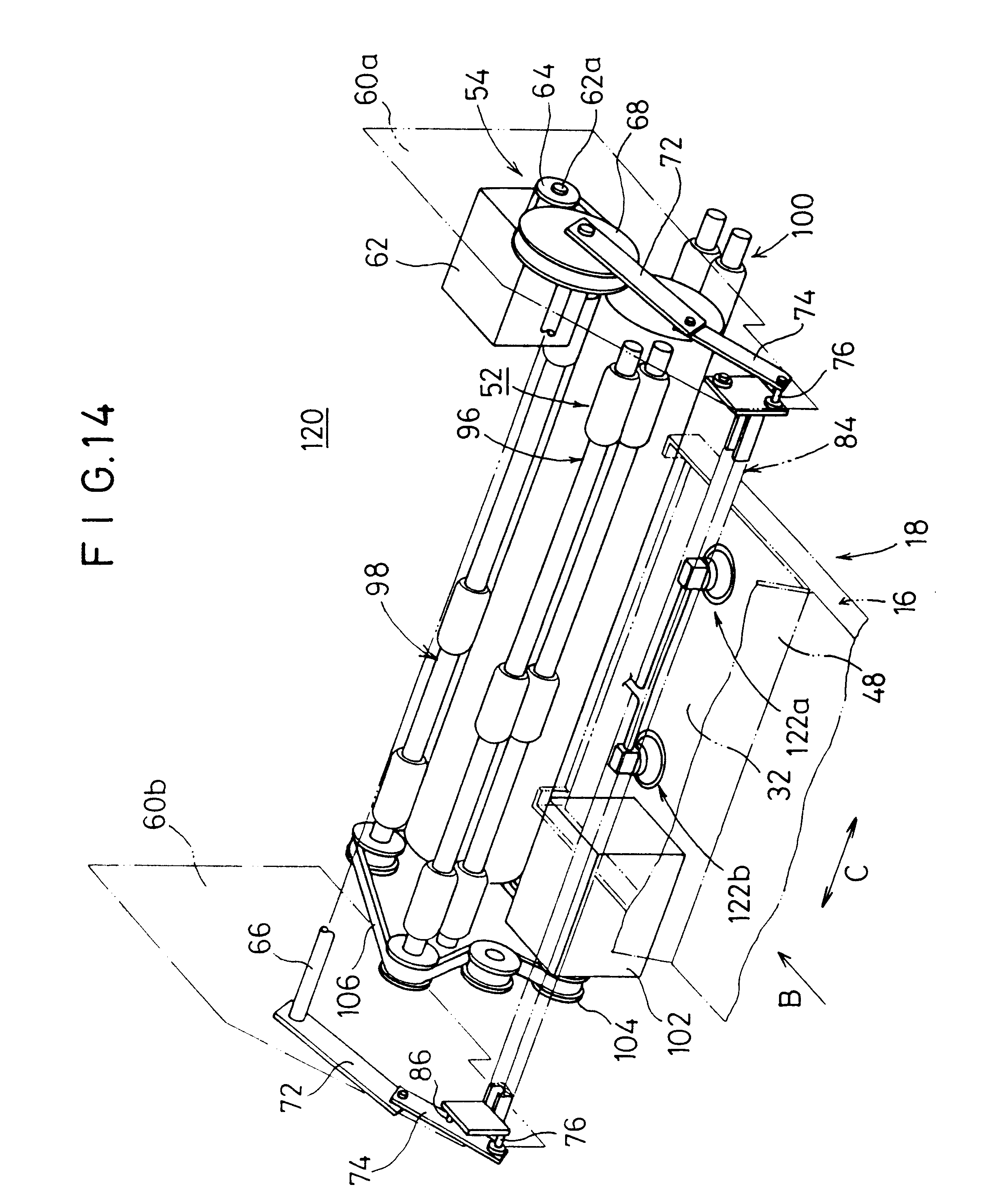 Field of the Invention The present invention relates to a method of and apparatus for feeding a sheet such as a photographic film, a stimulable phosphor sheet, etc., by smoothly and reliably attracting the sheet with suction cups. There is known a system for recording radiation image information of a subject such as a human body with a stimulable phosphor, and reproducing the recorded radiation image information on a photosensitive medium such as a photographic film, or displaying the recorded radiation image information on a display device such as a CRT or the like. The stimulable phosphor is a phosphor which, when exposed to an applied radiation, stores a part of the energy of the radiation, and, when subsequently exposed to applied stimulating rays such as visible light, emits light in proportion to the stored energy of the radiation. Usually, a sheet provided with a layer of the stimulable phosphor, or a stimulable phosphor sheet, is stored in a cassette, or a plurality of such stimulable phosphor sheets are stored in a magazine. The above known system includes an image information reading apparatus which comprises a reading section for reading image information recorded on a stimulable phosphor sheet, and an erasing section for erasing remaining image information from the stimulable phosphor sheet after the recorded image information has been read. In the image information reading apparatus, after a cassette or a magazine (hereinafter referred to as a “cassettes”) housing a stimulable phosphor sheet which bears radiation image information of a subject recorded by an external exposure device is inserted into a loading section, the lid of the cassette is opened, and then the stimulable phosphor sheet is taken out of the cassette by a sheet feeding mechanism. The stimulable phosphor sheet is thereafter delivered to the reading section by a sheet delivering mechanism. In the reading section, a laser beam or the like is applied to the stimulable phosphor sheet to read the recorded image information from the stimulable phosphor sheet. Thereafter, remaining image information is erased from the stimulable phosphor sheet in the erasing section, after which the stimulable phosphor sheet is stored in the cassette from which it has been removed or another cassette in the loading section. The cassette which stores the stimulable phosphor sheet is then removed from the image information reading apparatus. The loading section does not have a space large enough to allow the cassette to be fully opened because of limitations imposed by the small size of the image information reading apparatus. In the loading section, therefore, the cassette is opened by tilting the lid of the cassette through a predetermined angle. The sheet feeding mechanism moves suction cups along a path which is inclined obliquely downwardly toward the stimulable phosphor sheet in the cassette, causes the suction cups to attract the stimulable phosphor sheet, and then lifts the suction cups to remove the stimulable phosphor sheet from the cassette. The above problem is not limited to the arrangement in which the suction cups move obliquely toward and away from the stimulable phosphor sheet. If the suction cups have skirts whose height is larger than the diameter of the suction cups, then the skirts tend to roll on the stimulable phosphor sheet even when the suction cups move perpendicularly toward and away from the stimulable phosphor sheet. The above system also includes an image information reproducing apparatus for reproducing radiation image information recorded on a stimulable phosphor sheet on a photosensitive medium such as a photographic film. The image information reproducing apparatus has a magazine loading section for loading a magazine which stores a plurality of photosensitive mediums, and a sheet feeding mechanism for removing the photosensitive mediums, one by one, from the magazine that is loaded in the magazine loading section. The sheet feeding mechanism has suction cups which suffer the same problem with respect to the photosensitive mediums as the problem described above with respect to the suction cups and the stimulable phosphor sheets in the image information reading apparatus. Attempts have heretofore been made to solve the above problem by making suction cups of a slippery material or roughening the attracting surfaces of suction cups to make them slippery. However, if the suction cups are made slippery, then the frictional resistance between the suction cups and the sheet becomes smaller than required. Specifically, when the slippery suction cups move while attracting the sheet, the sheet is liable to be positionally displaced relatively to the suction cups, or fall off the suction cups. It is a major object of the present invention to provide a method of and an apparatus for feeding a sheet by smoothly and reliably attracting the sheet with suction cups while effectively preventing the suction cups from being deformed, with a relatively simple arrangement. The above and other objects, features, and advantages of the present invention will become more apparent from the following description when taken in conjunction with the accompanying drawings in which preferred embodiments of the present invention are shown by way of illustrative example. As shown in The sheet delivery system 22 has a plurality of pairs of nip rollers 28 spaced along a vertical delivery path. The erasing section 24 has a plurality of erasing light sources 30 disposed in a position on one side of the vertical delivery path. The reading section 26 comprises an auxiliary scanning system 38 having first and second pairs of rollers 34, 36 for delivering a stimulable phosphor sheet 32 from the cassette 16 in an auxiliary scanning direction indicated by the arrow A, an optical system 40 for applying a laser beam L as it is deflected in a main scanning direction (substantially perpendicular to the auxiliary scanning direction) to the st